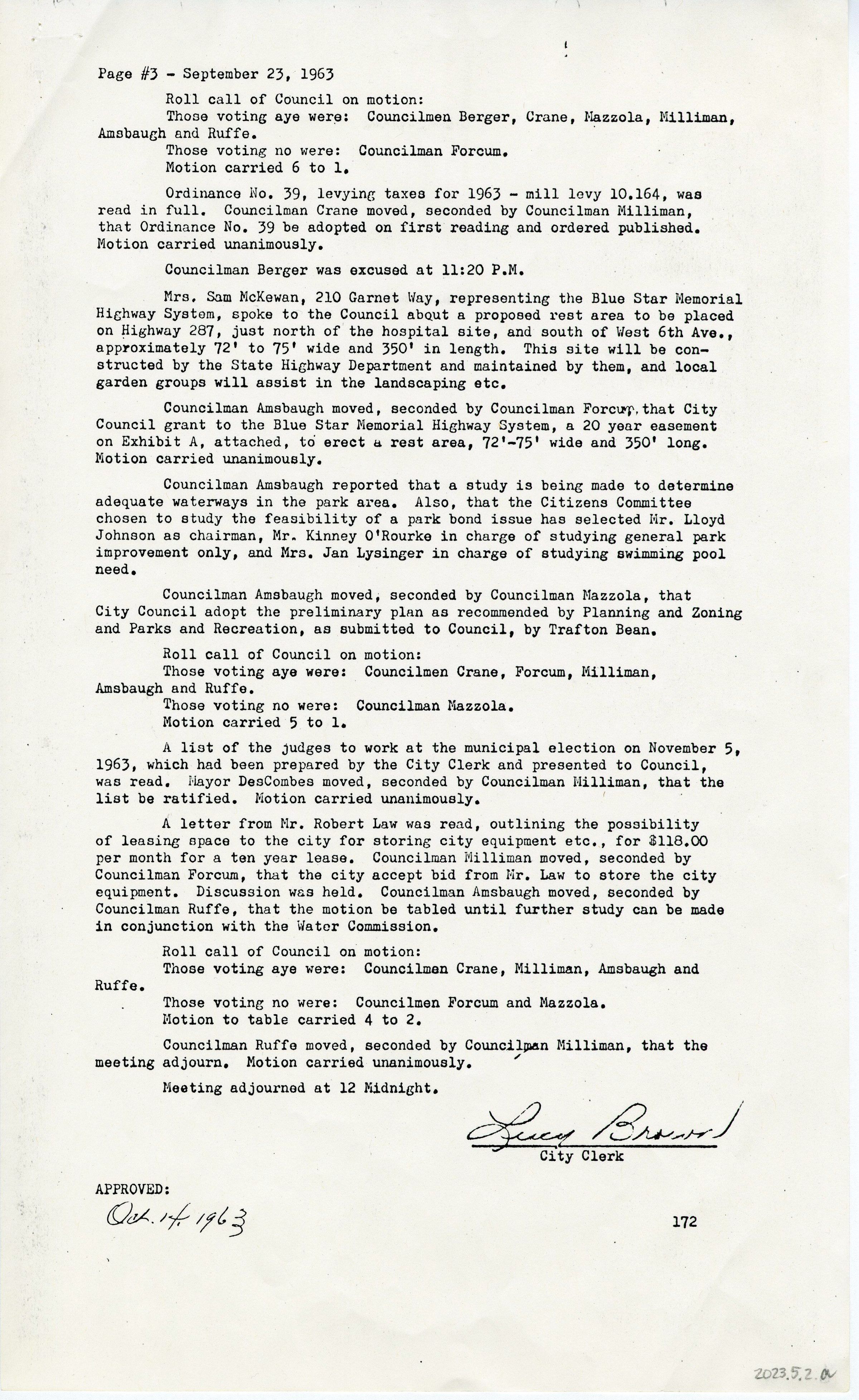 Document series (20 pages) describing the proposal, resolution, easement, dedication, and rededication of the Blue Star Memorial Park at Hwy. 287 and 6th Street. Dates from September 23, 1963 to 1981.Lexicon