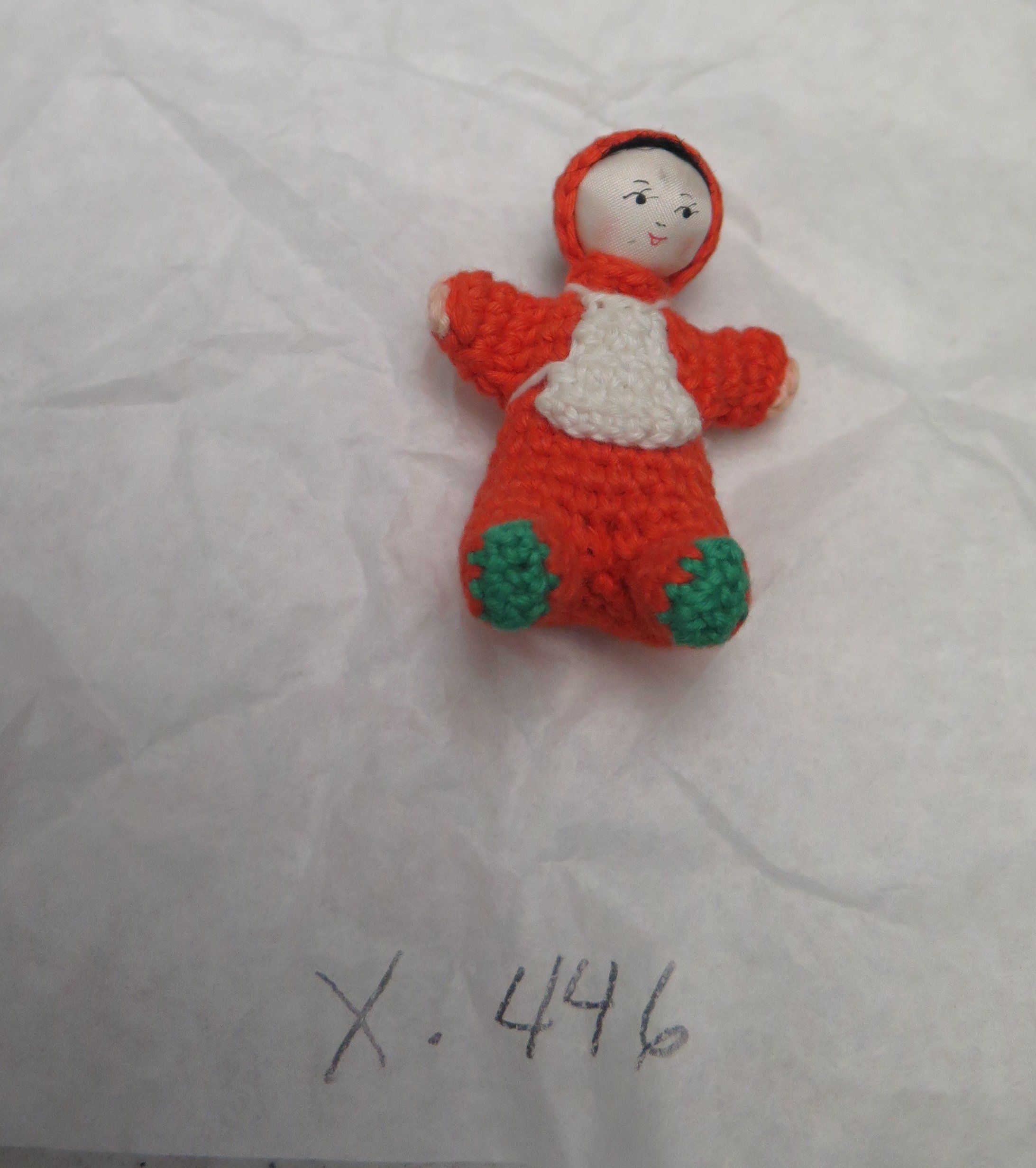 This is an orange crocheted doll with a white apron, green shoes, and a painted face. The doll measures 0.75" (h) x 2" (w) x 2" (l).Lexicon
