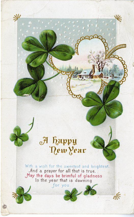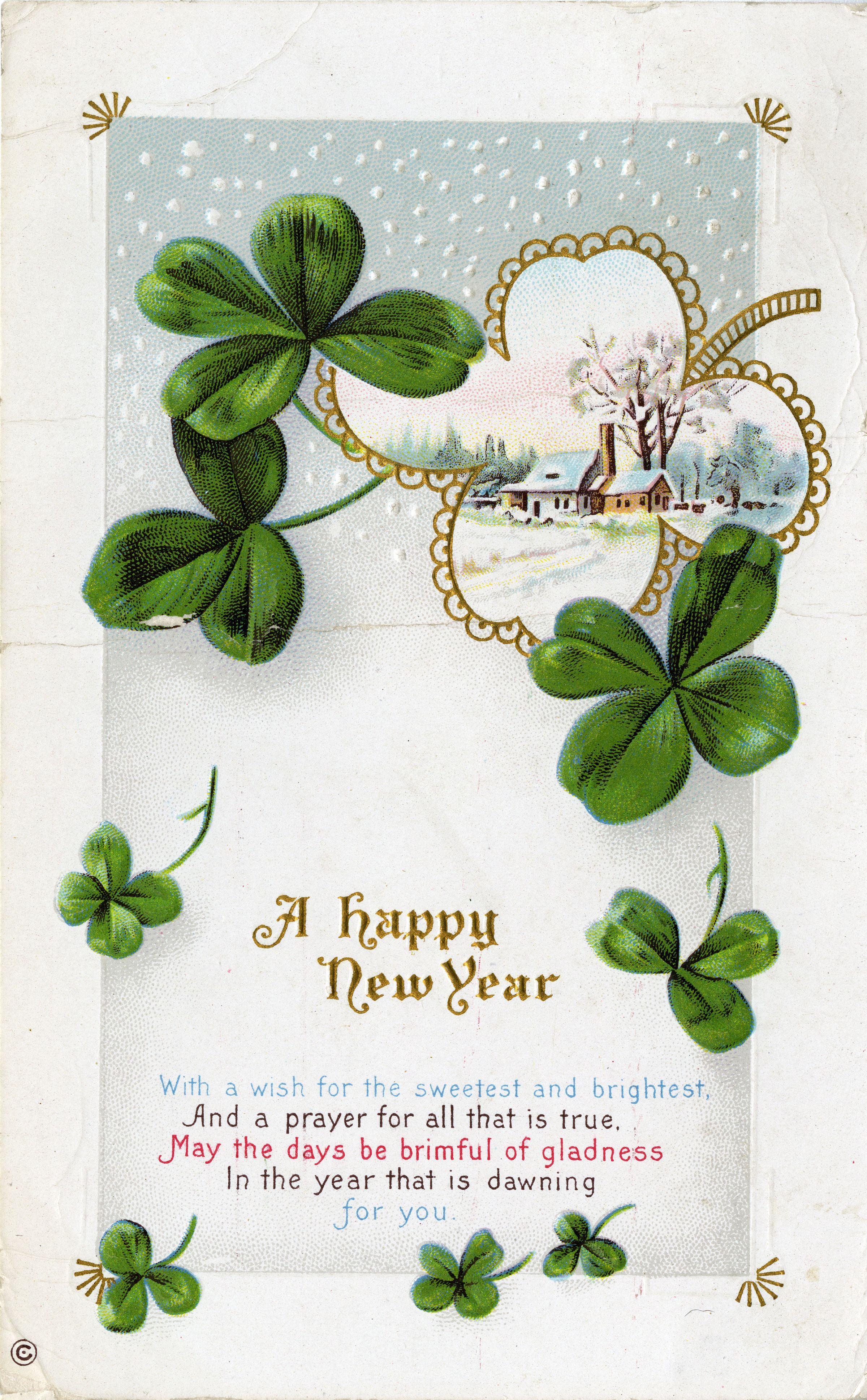 A New Years postcard, dated December 29, 1914. The card is 3.5" x 5.5", white, with several green four-leaf clovers depicted on the front. One clover in the upper right corner is filled with a color illustration of a house in a winter landscape. The text "A happy New Year" is printed in gold-colored lettering just below the center. Another message is printed in colored text near the bottom: "With a wish for the sweetest and brightest, And a prayer for all that is true. May the days be brimful of gladness In the year that is dawning for you."
