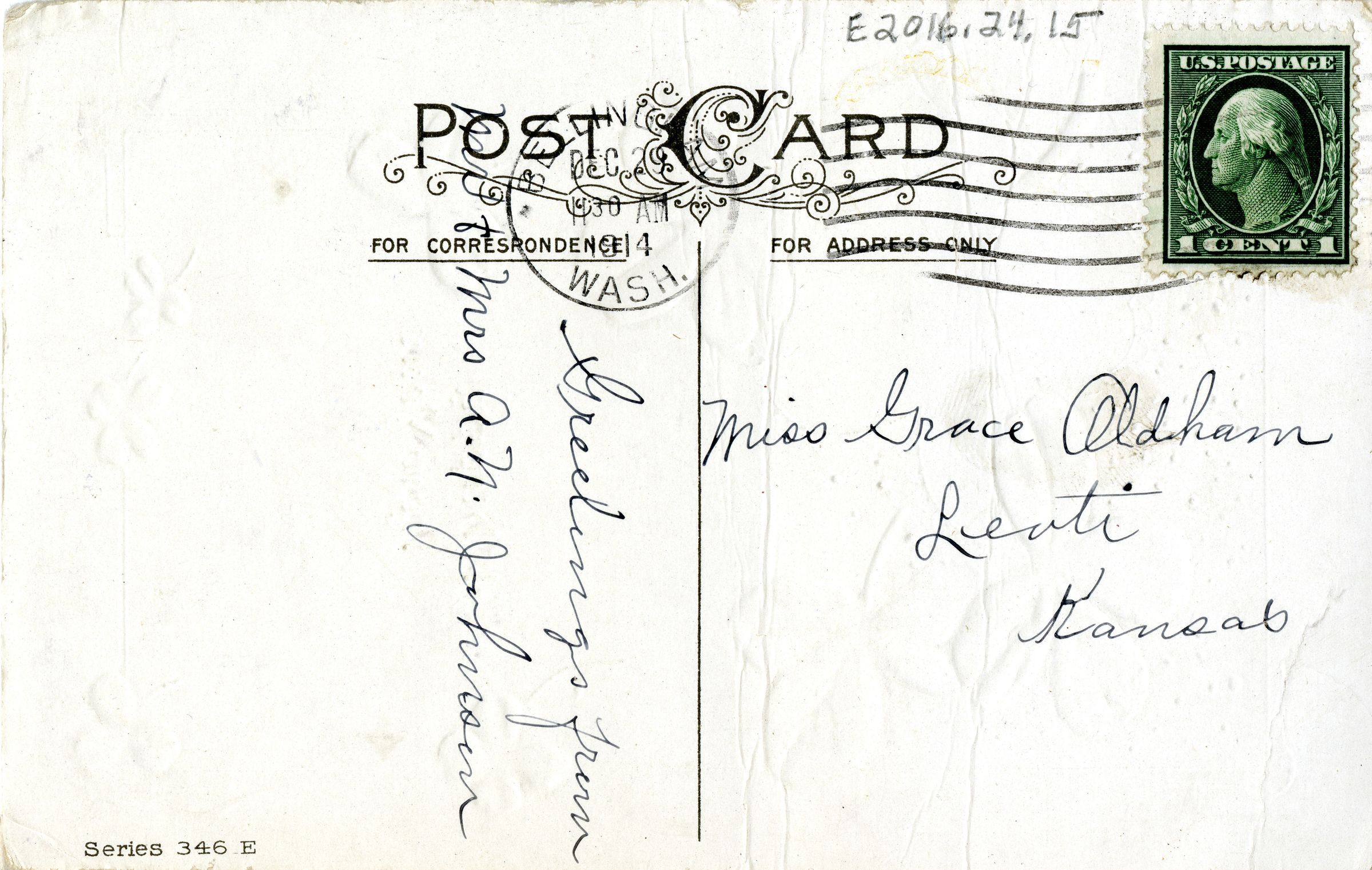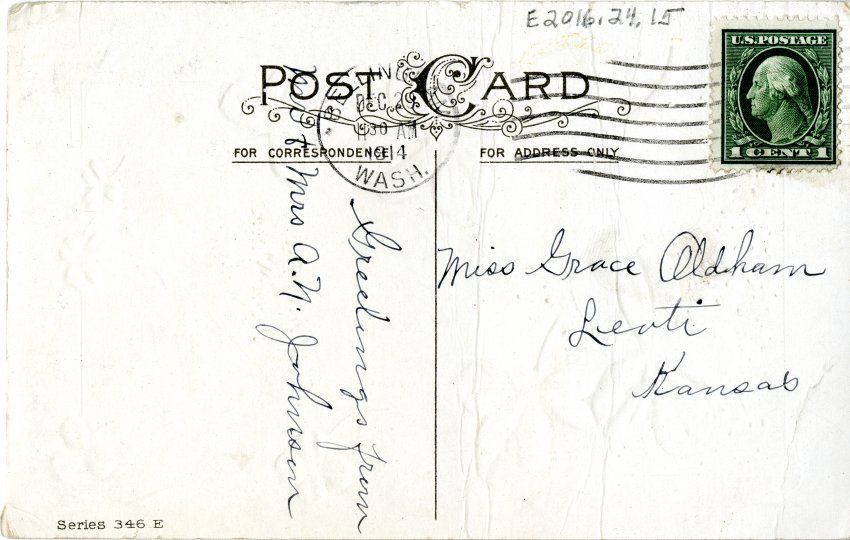 The reverse side has an ink post office stamp, along with the original postage stamp. Brief, handwritten greetings in ink are written from a Mr. and Mrs. A.N. Johnson to a Miss Grace Aldham of Levti, Kansas. The postcard's series number, "346 E", is printed in the lower left corner.Collection