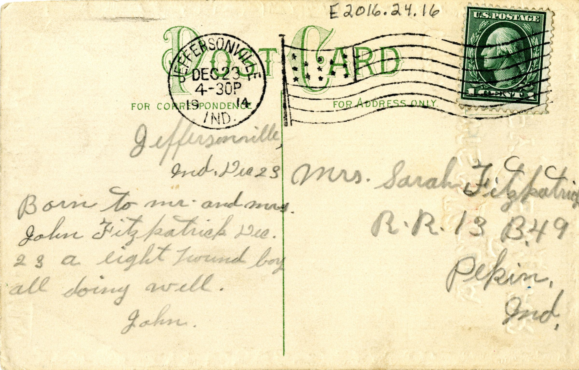The reverse side has an ink post office stamp along with the original postage stamp. A New Years greeting, in pencil, is written from "John" of Jeffersonville, Indiana to a Mrs. Sarah Fitzpatrick of Pekin, Indiana.Collection