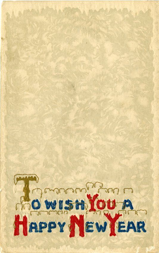 A New Years postcard, dated December 23, 1914. The card is 3.5" x 5.5", with a non-colored, foliage-like pattern depicted on the front. Stylized, colored text printed at the bottom states, "To Wish You A Happy New Year."