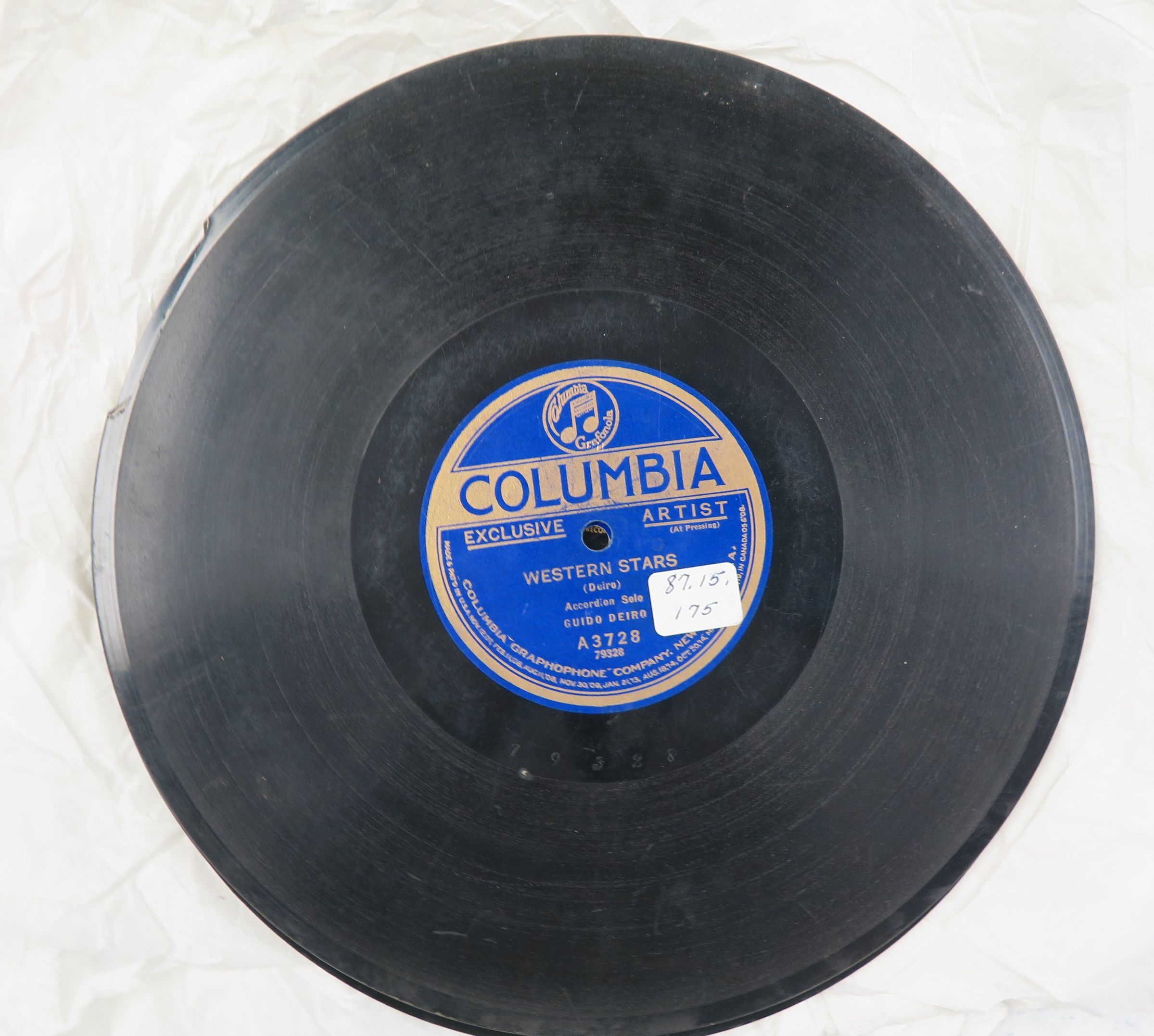 Vinyl record album 9.875"(Dia) featuring Guido Deiro's "Neapolitan Polka" and "Western Stars". Broken