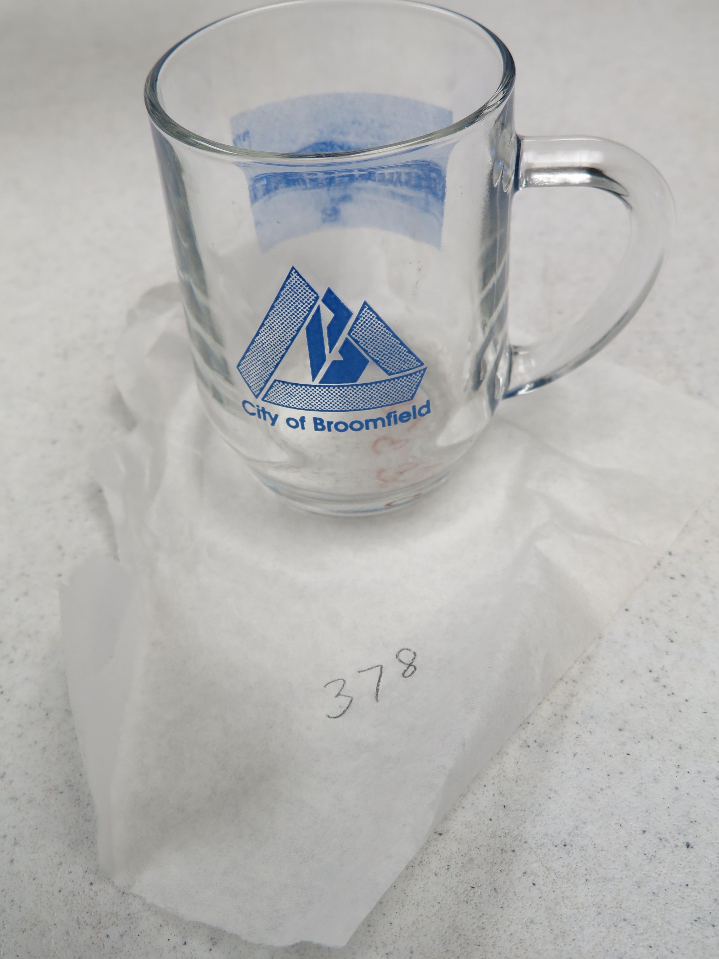 This is a clear class mug with the text "City of Broomfield" and the Broomfield logo on the side. The mug measures 4" (h) x 4.5" (dia).