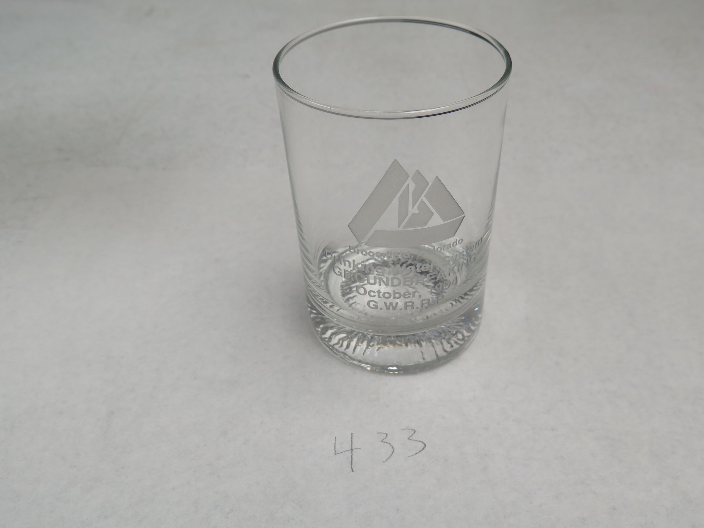 This is a clear glass drinking glass with the Broomfield logo on the side. The text on the glass reads, "Broomfield, Colorado/ Drinking Water System/ Groundbreaking/ October, 1994/ G.W.R.R.P.". The glass measures 5" (h) x 5.75" (dia).