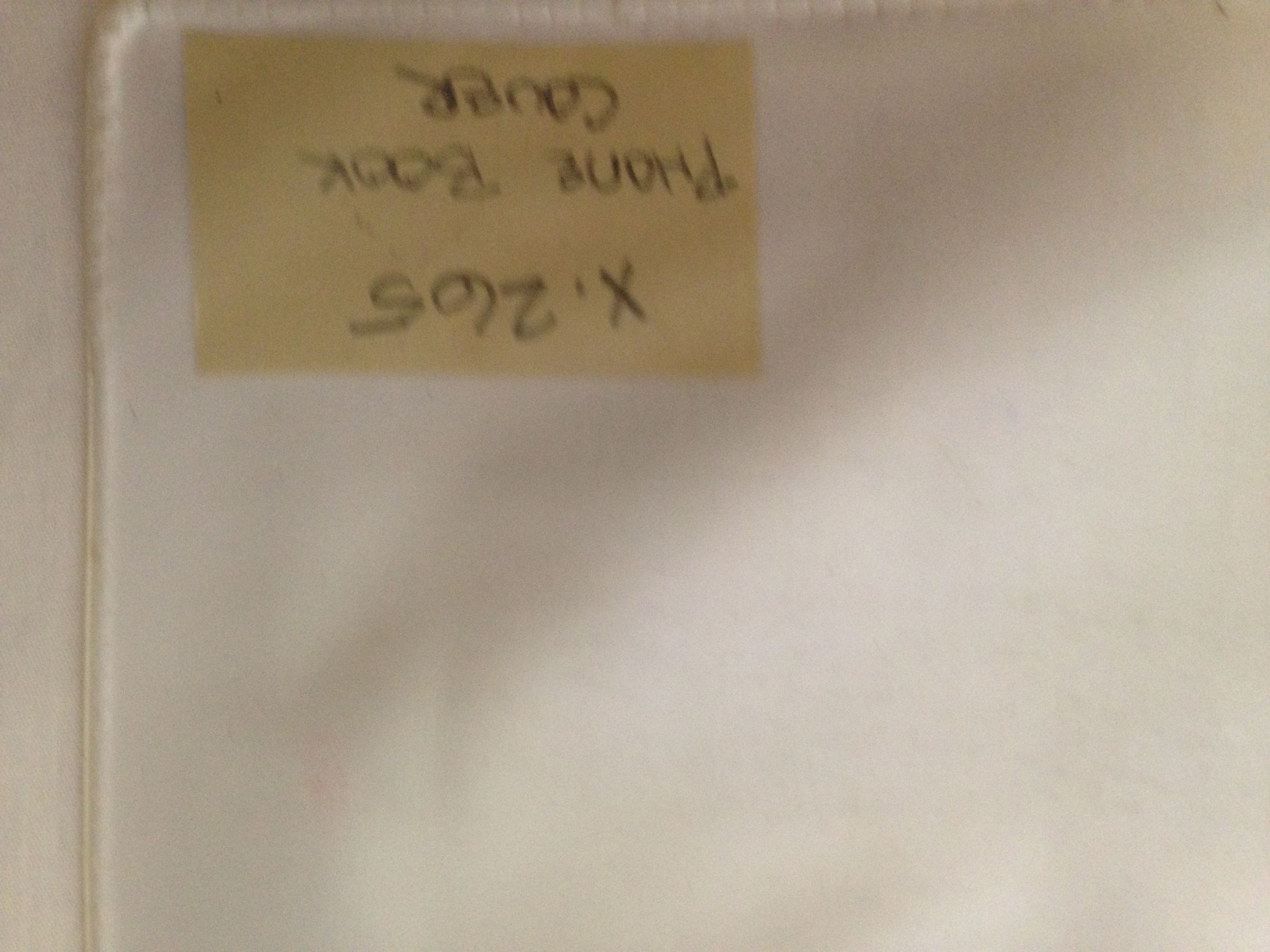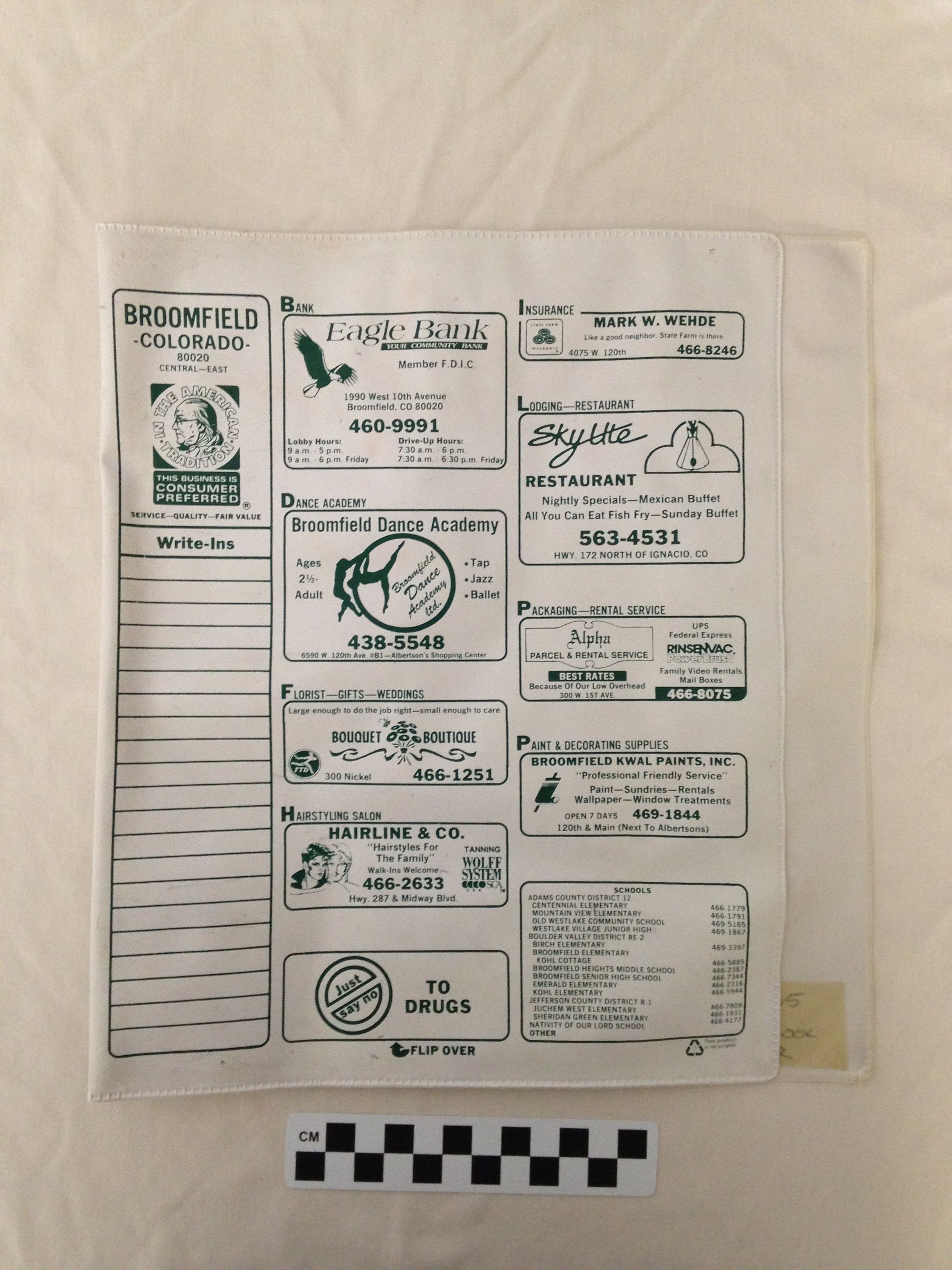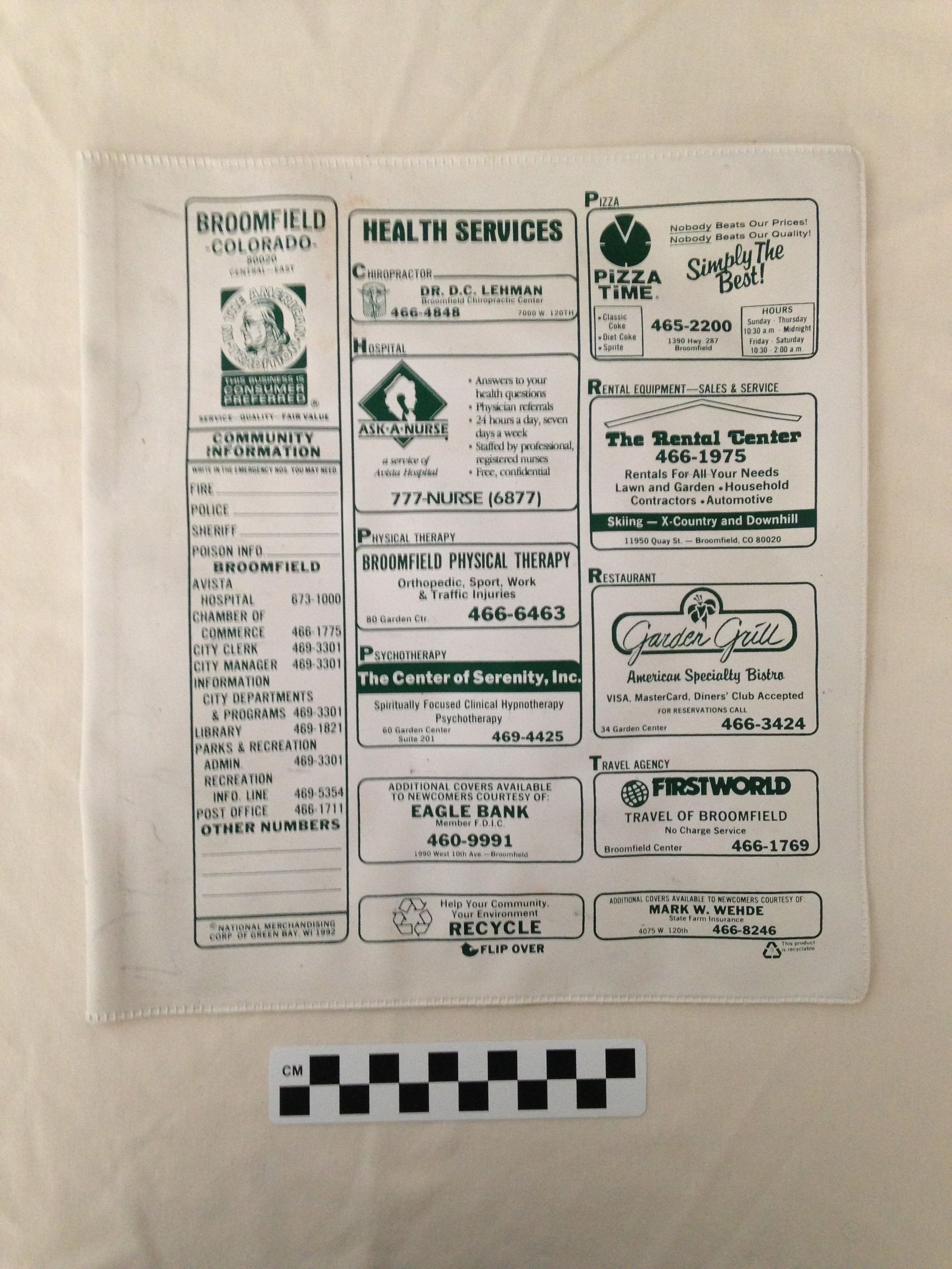 This is a white plastic phone book cover with advertisements printed in green on the front and back. The phone book cover measures 9.5" (w) x 11" (l).