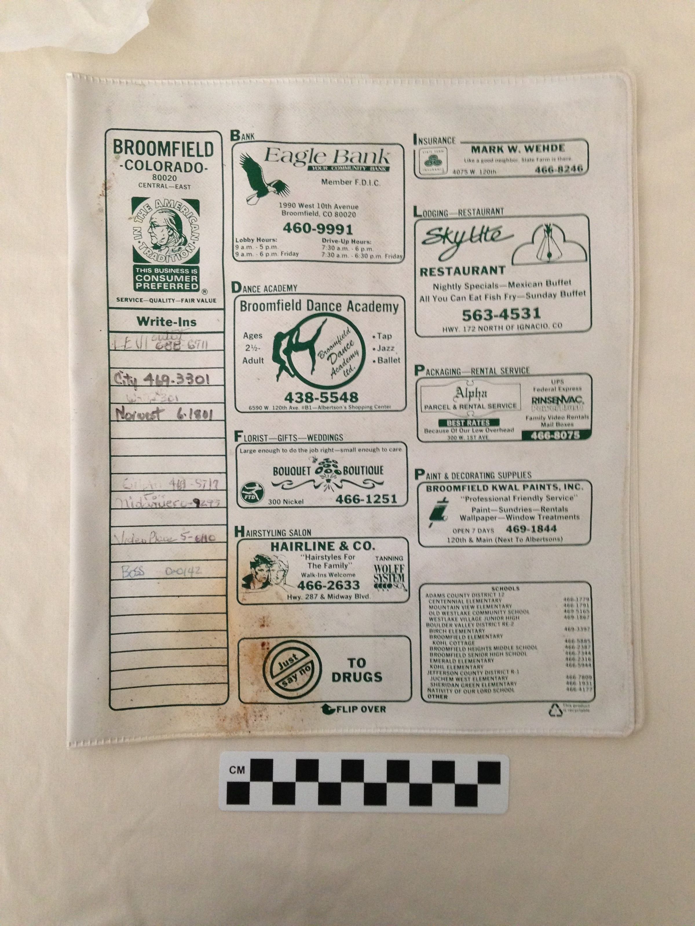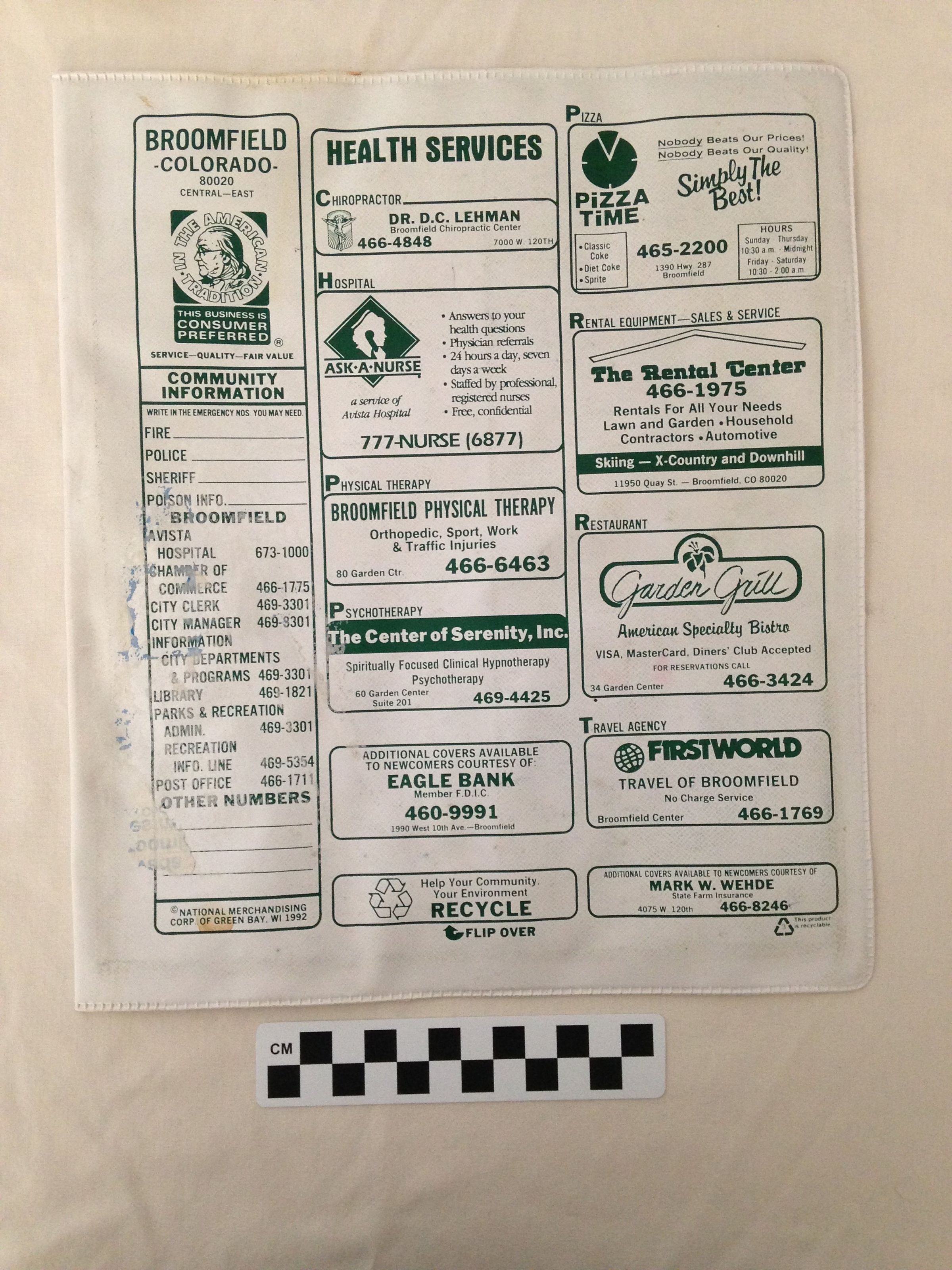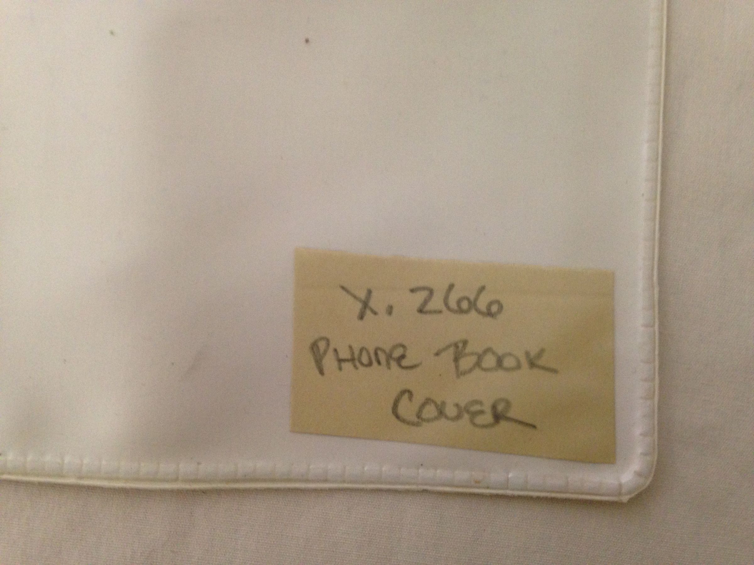 This is a white plastic phone book cover with advertisements printed on it in green. The phone book cover measures 9.5" (w) x 11" (l).