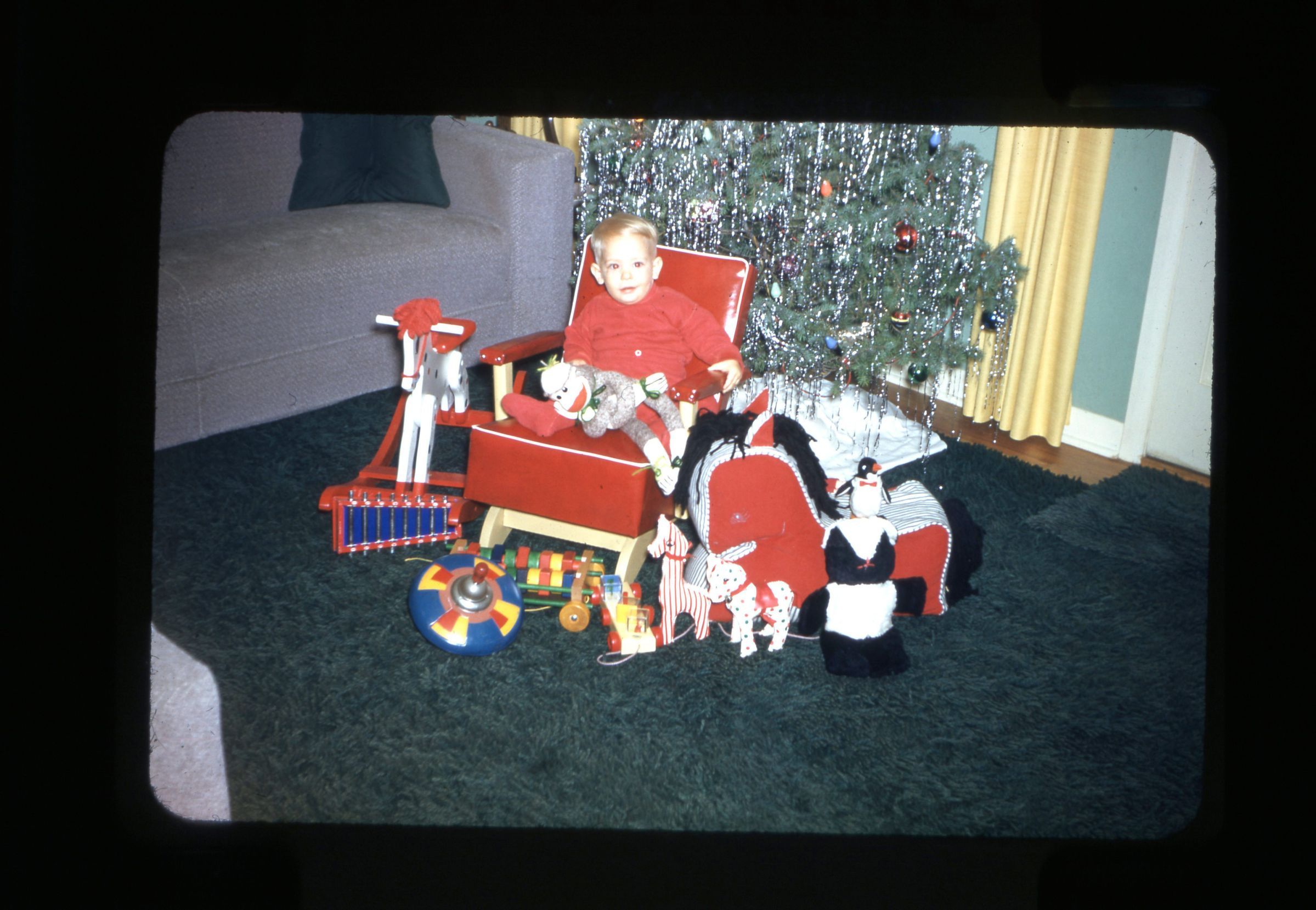Color film slide of David Brunner. Image is located inside of Clyde Brunner's house around Christmas. David Brunner is surrounded by toys.