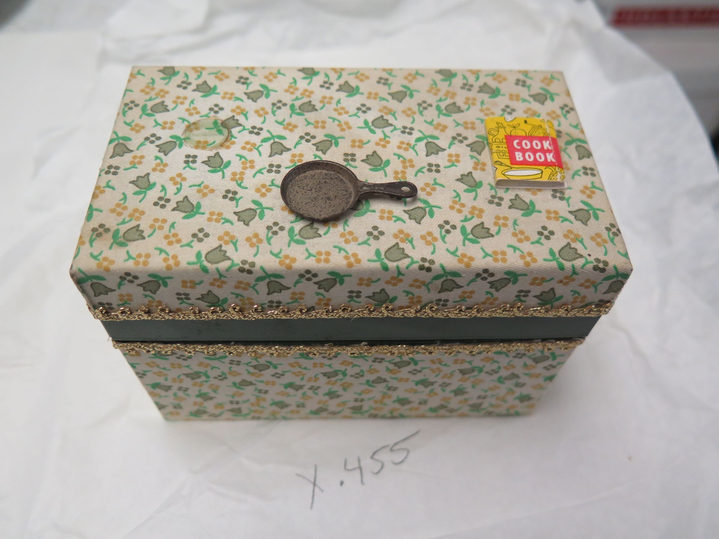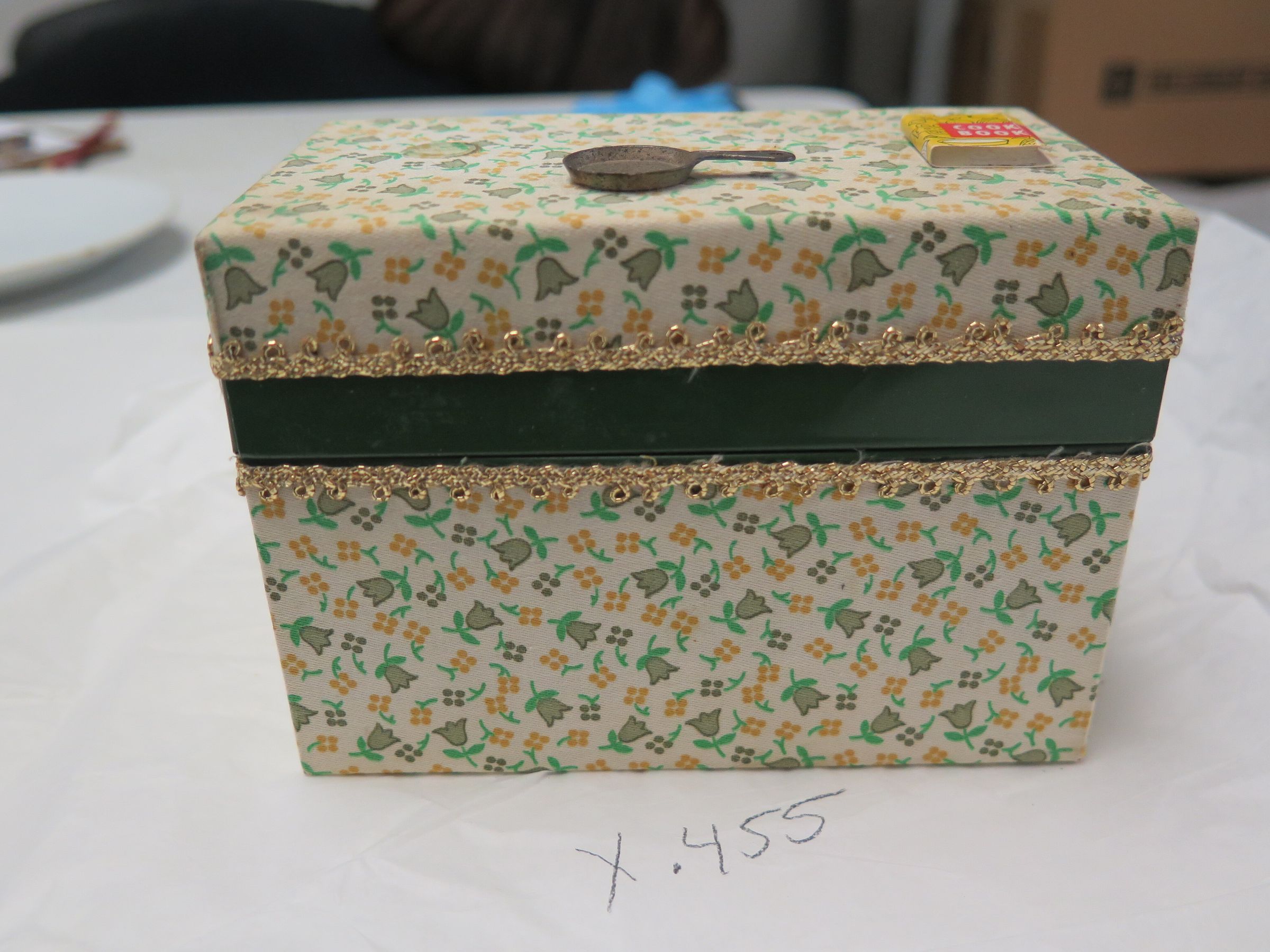 This is a recipe box with a green floral pattern. The top of the box has a miniature frying pan and cook book stuck to it. The box measures 3.75" (h) x 5.25" (w) x 3" (l).