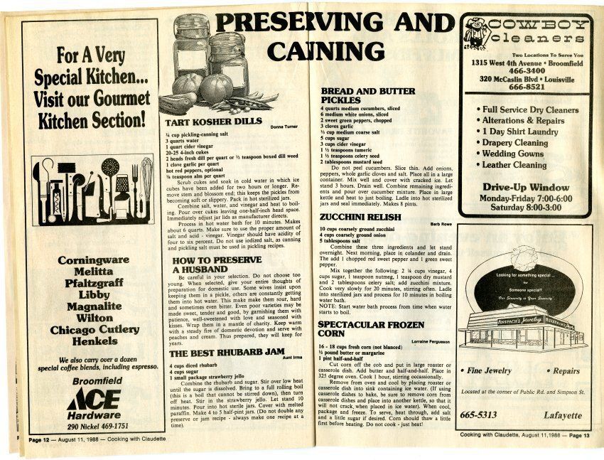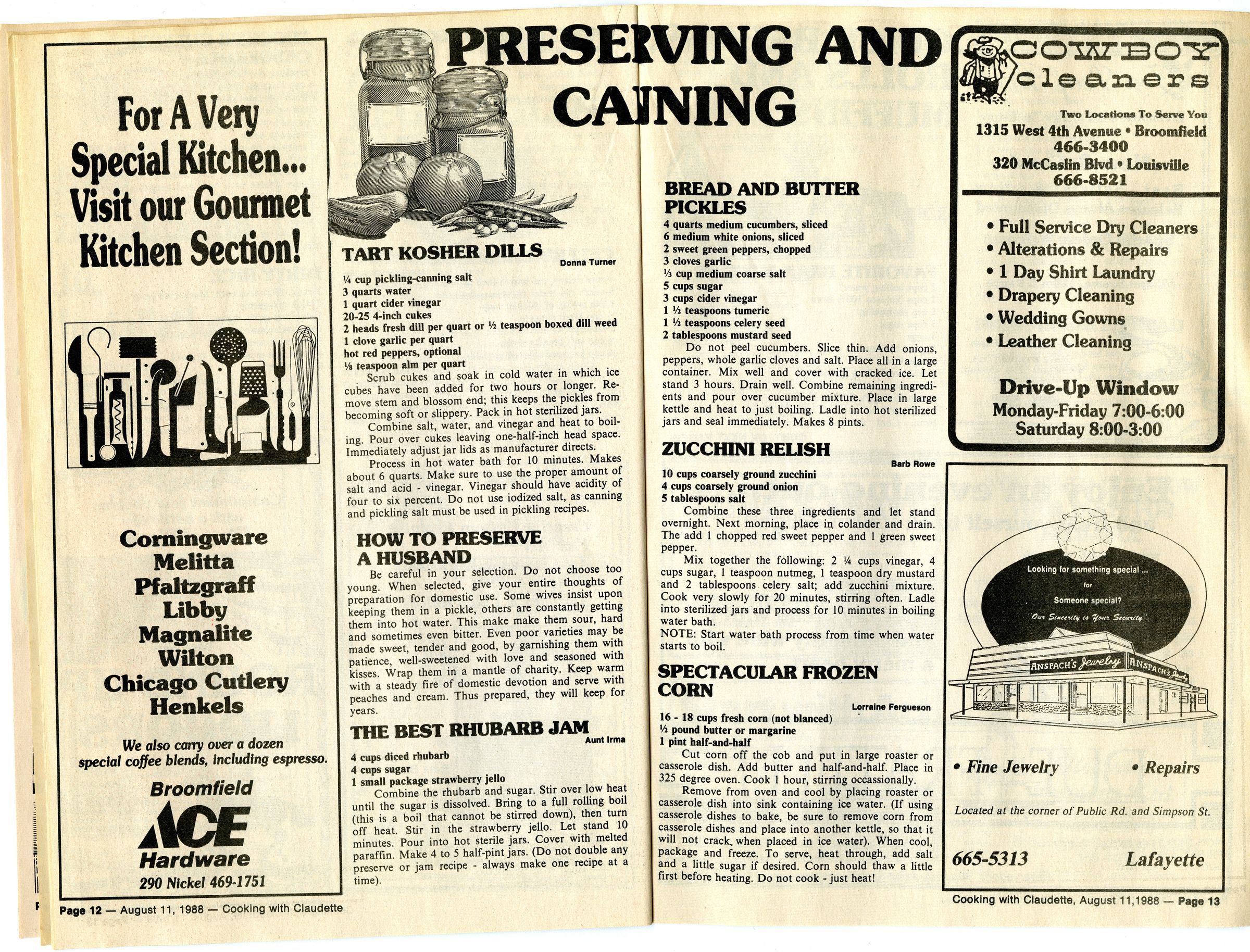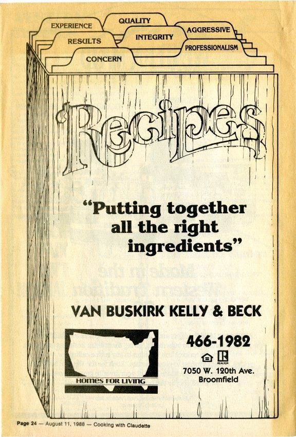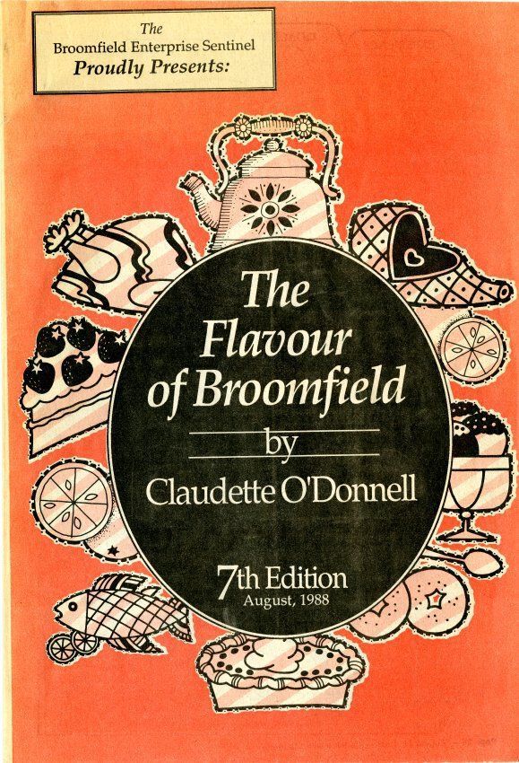 The book was a seventh edition published by The Broomfield Enterprise Sentinel. An alternate title for the book was "Cooking with Claudette," referring to the author. The contents of the book contain several recipes for appetizers, salads, side dishes, preserving and canning, breads, main dishes, and desserts. Advertisements for several Broomfield businesses are also displayed throughout the book.Collection