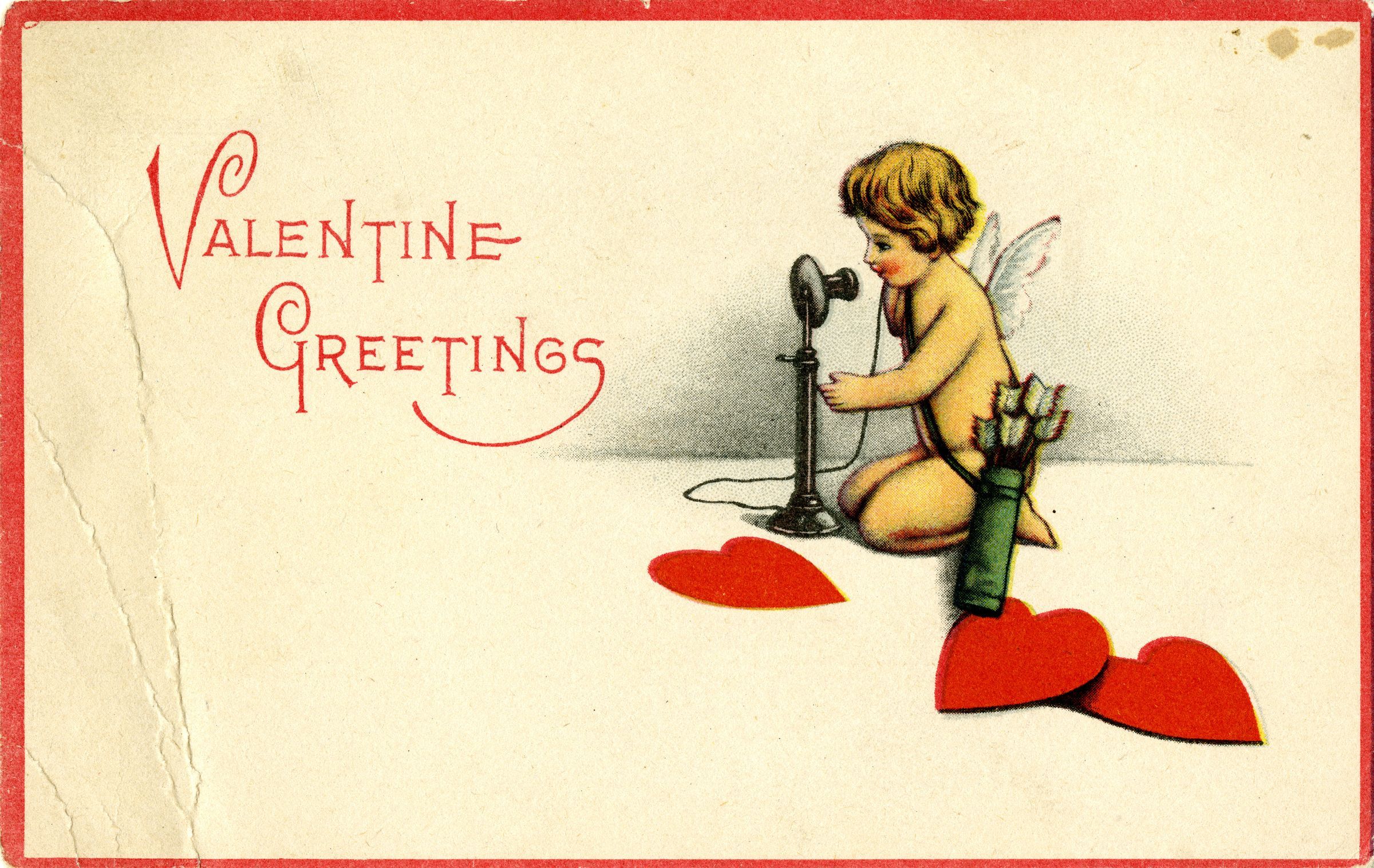 Valentine's Day postcard with a colored image of a Cupid on a telephone. Card has a red border. Text says "Valentine Greeting."