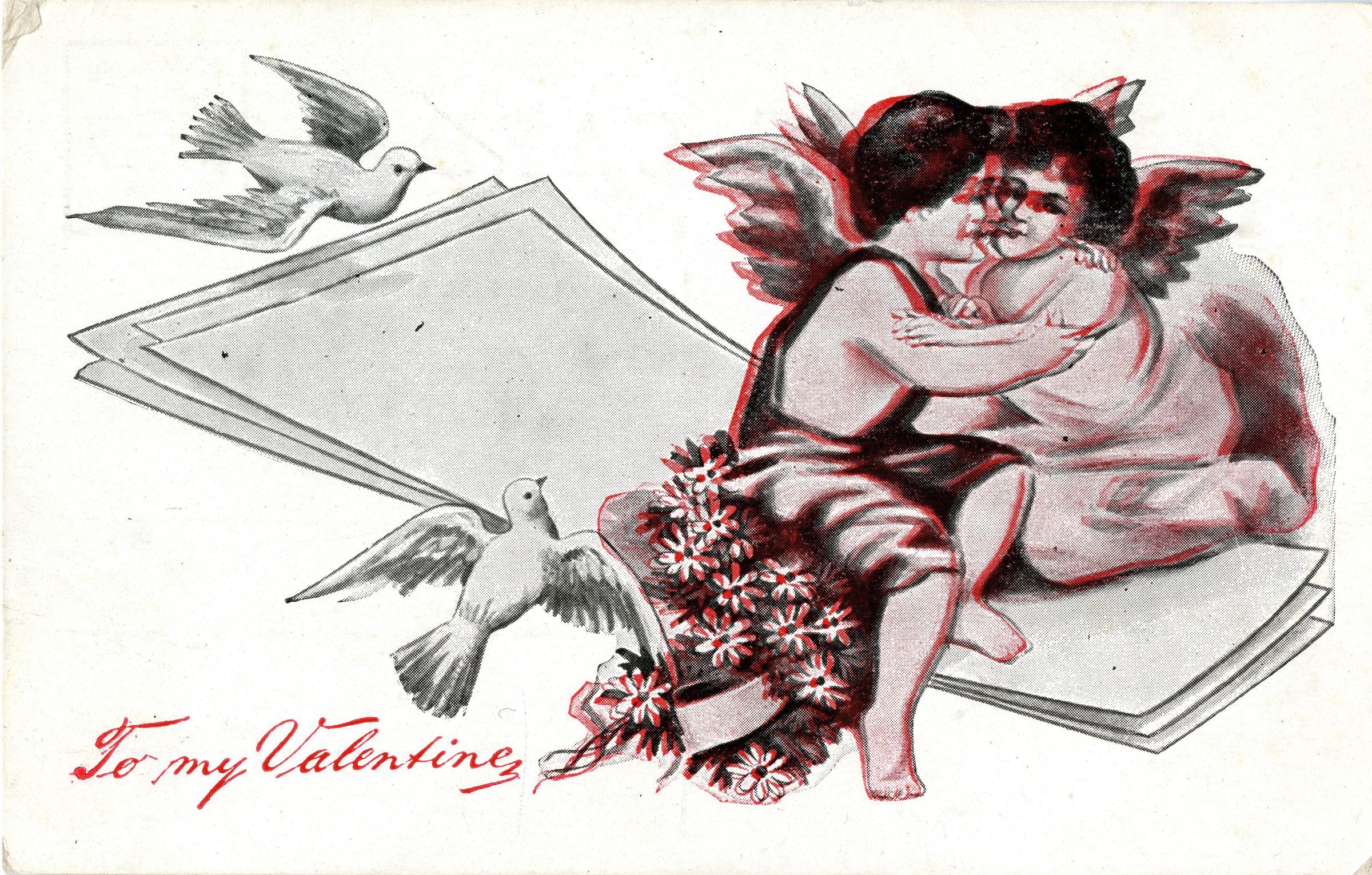 Valentine's Day postcard with a red, black and white image with two doves and two Cupids. Text says "To My Valentine."