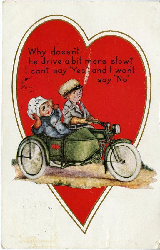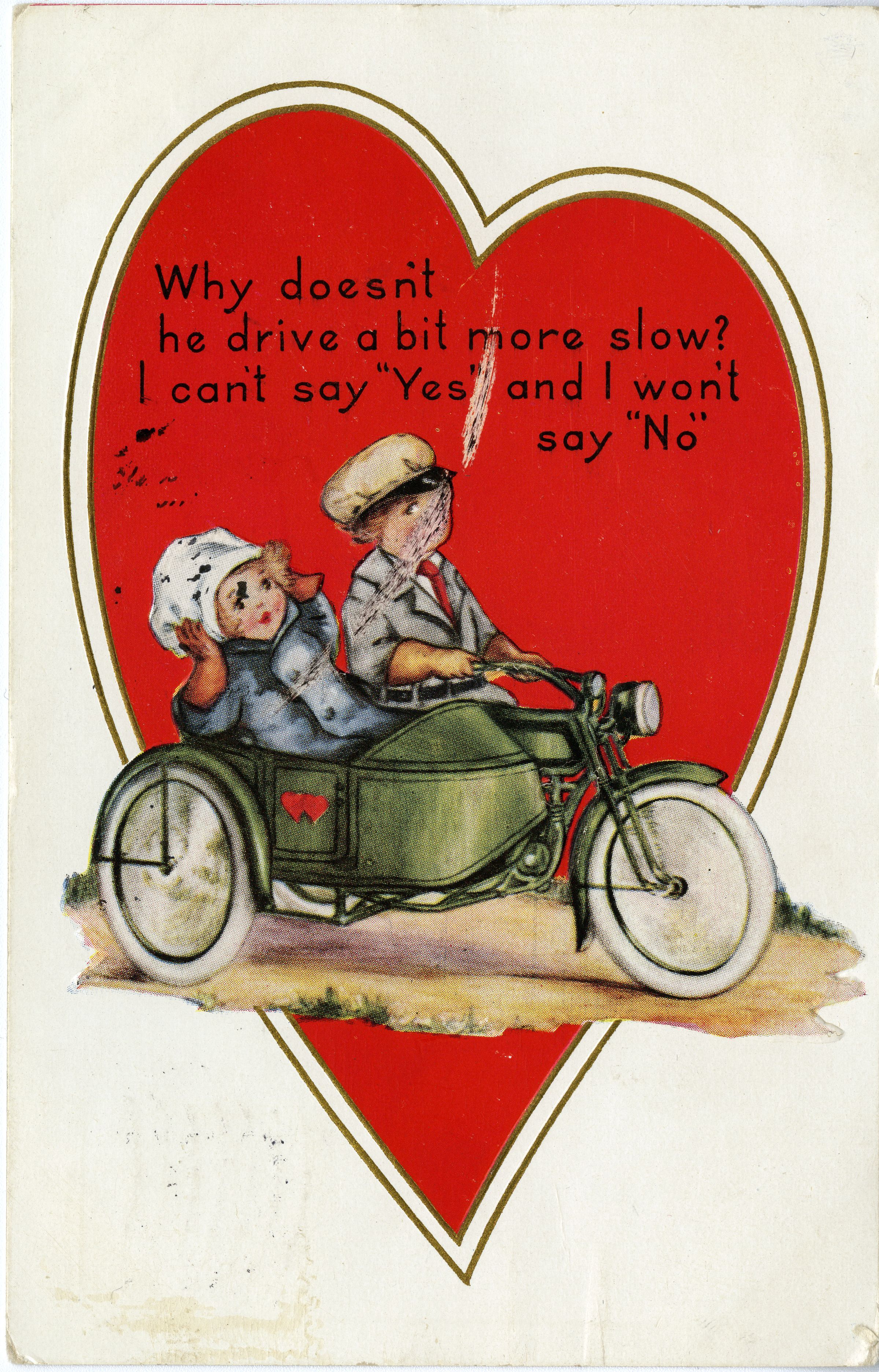 Colored image of a boy and girl riding on a motorcycle with a side car on a white background. Text says "Why doesn't he drive a bit more slow? I can't say 'Yes' and I won't say 'No.'"
