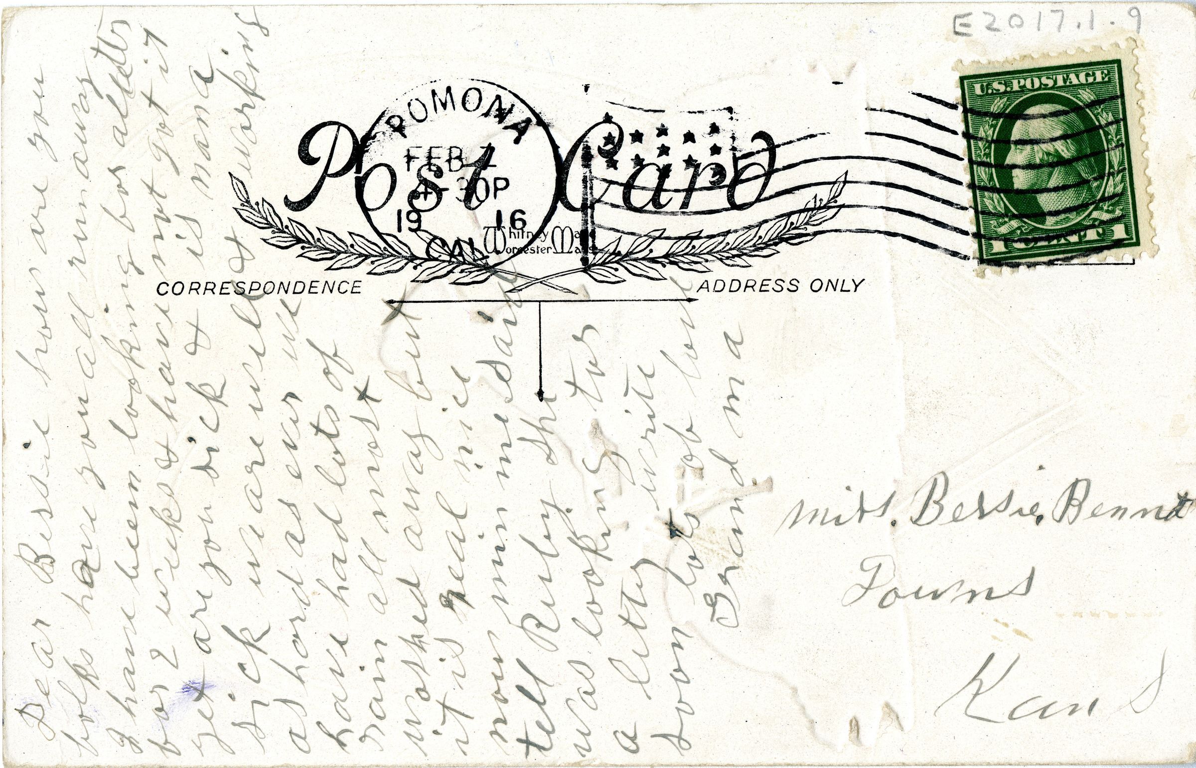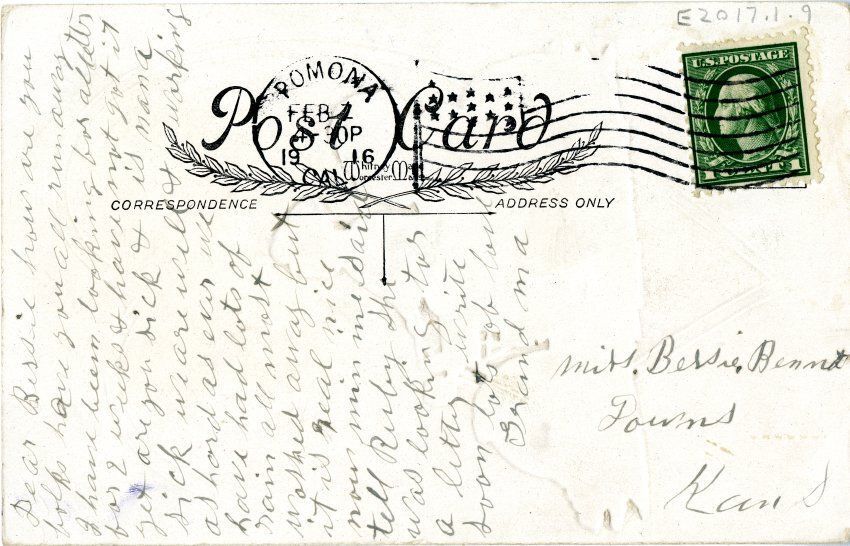 Card has a one-cent stamp and is postmarked Feb. 1916, Pomona, Cal, and addressed to Miss Bessie Bennet in Downs, Kansas. Message written in pencil is from a grandmother to her granddaughter.Collection