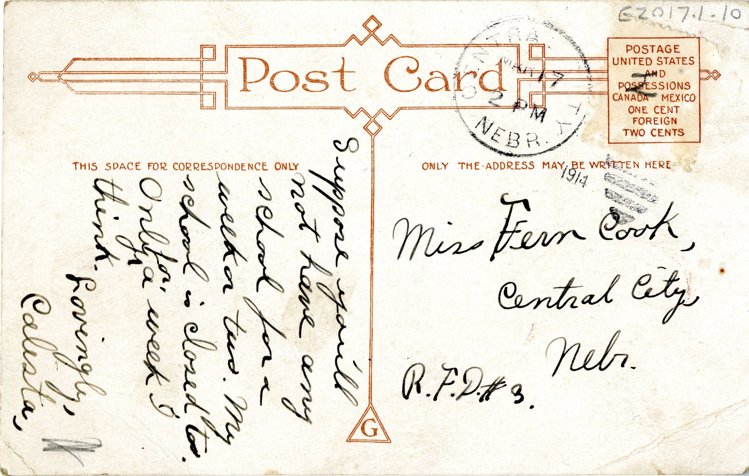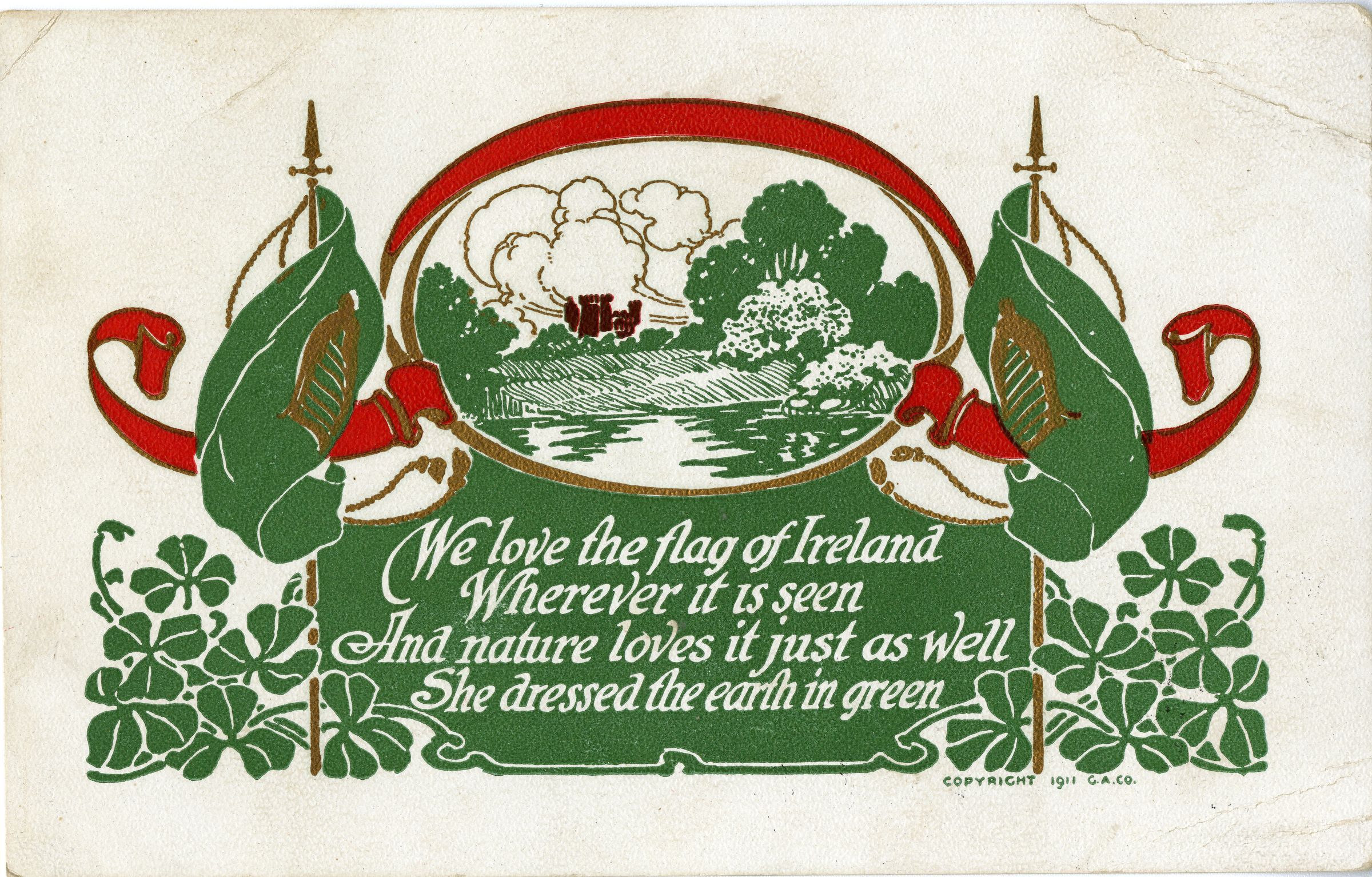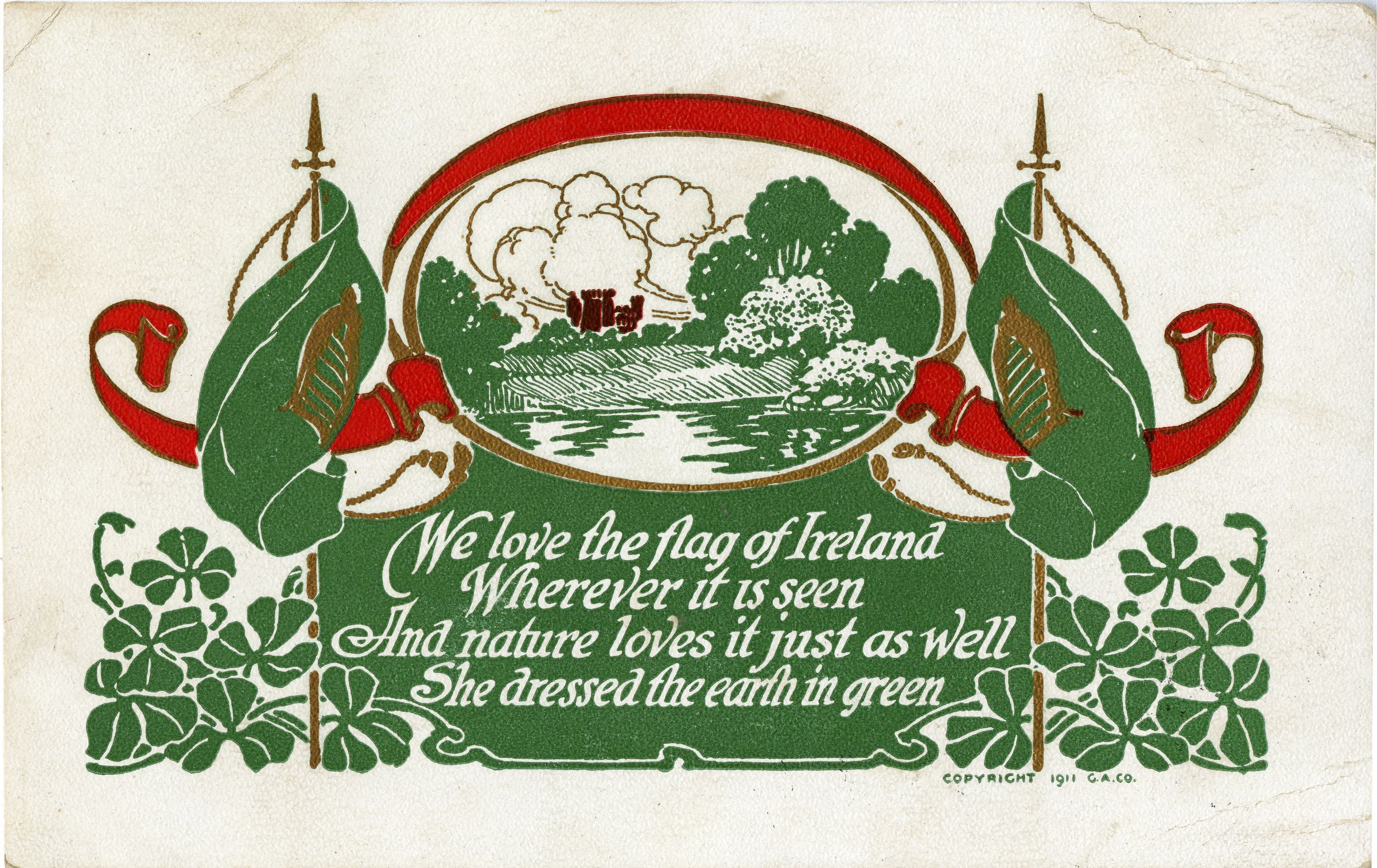 Postcard with image of a castle with Irish flags on both sides in the center of the card and shamrocks across the bottom. Image is green and red. Text on the front of the card, "We love the flag of Ireland/Wherever, it is seen/And nature loves it just as well/She dressed the earth in green."Collection