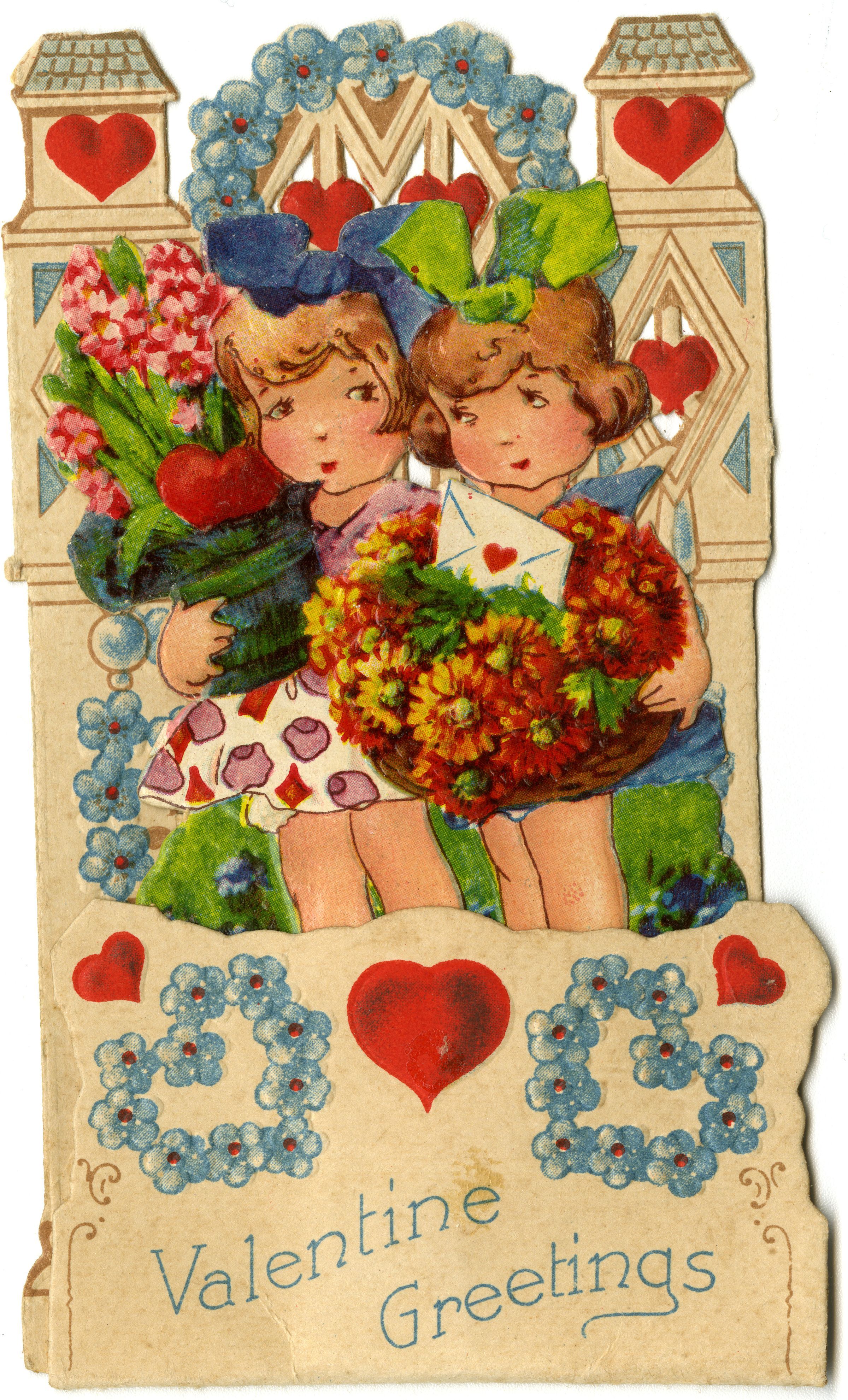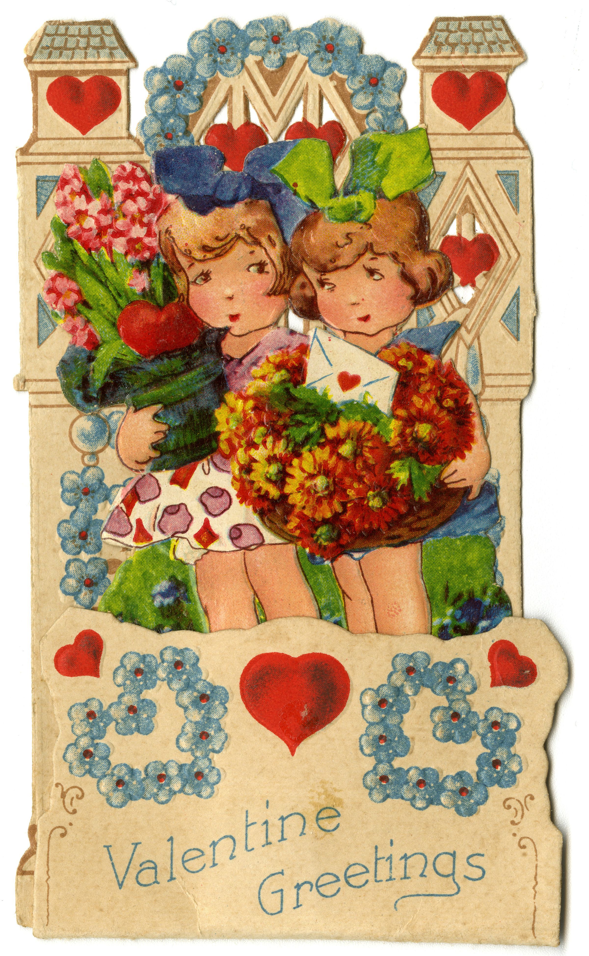 Dimensional Valentine's Day card with two girls in dresses holding flowers and text, "Valentine Greetings." The card is marked Made in Bavaria.