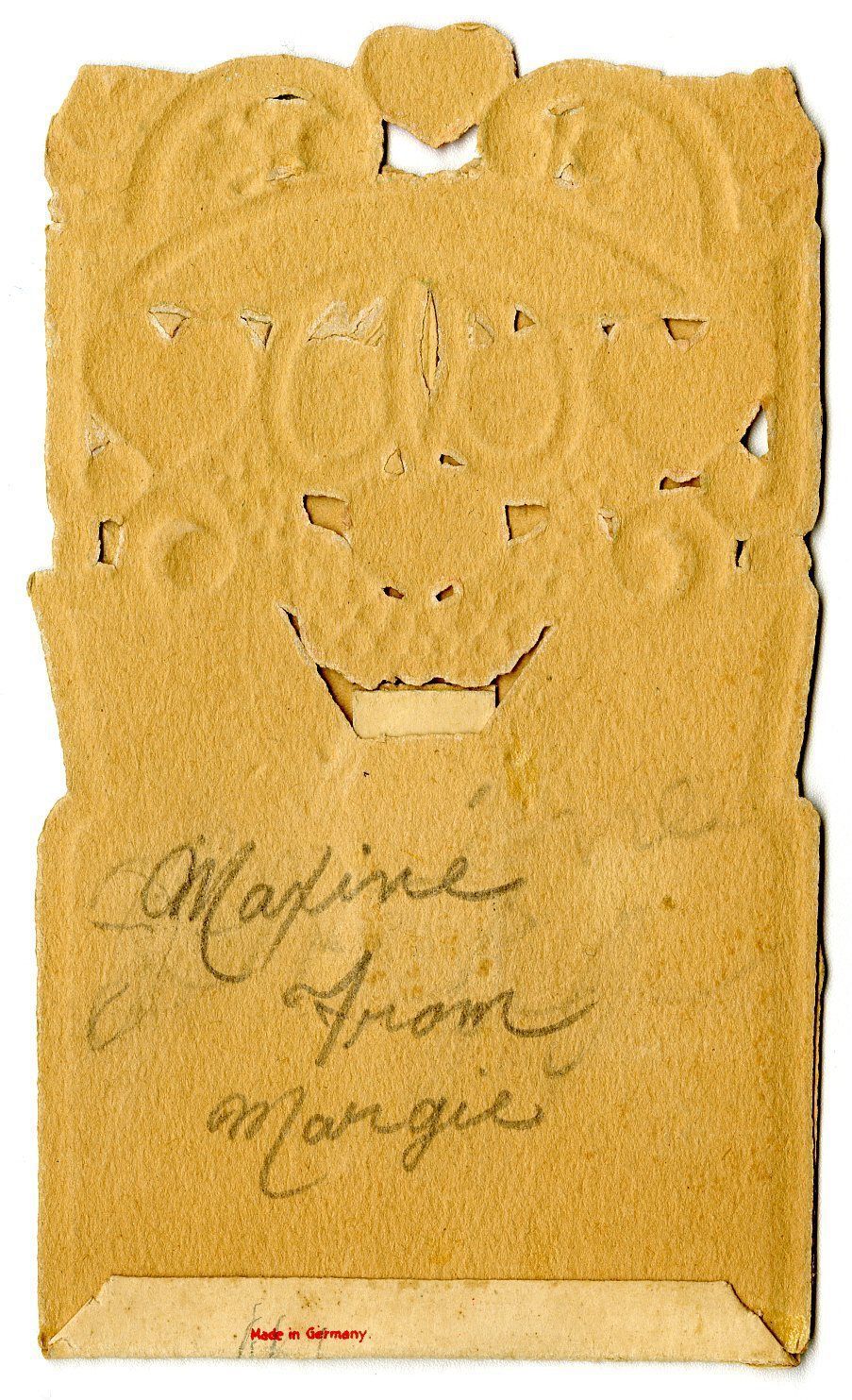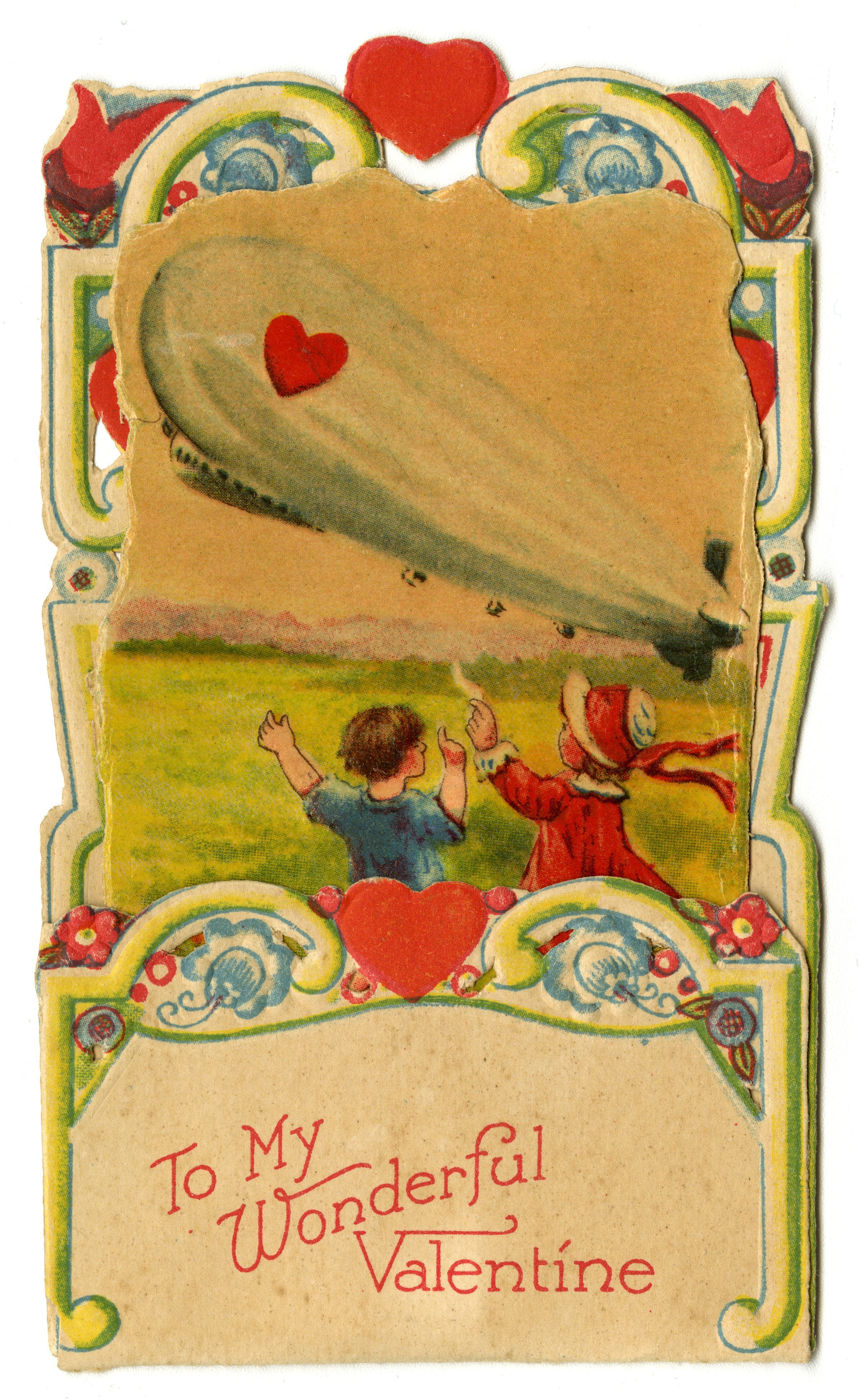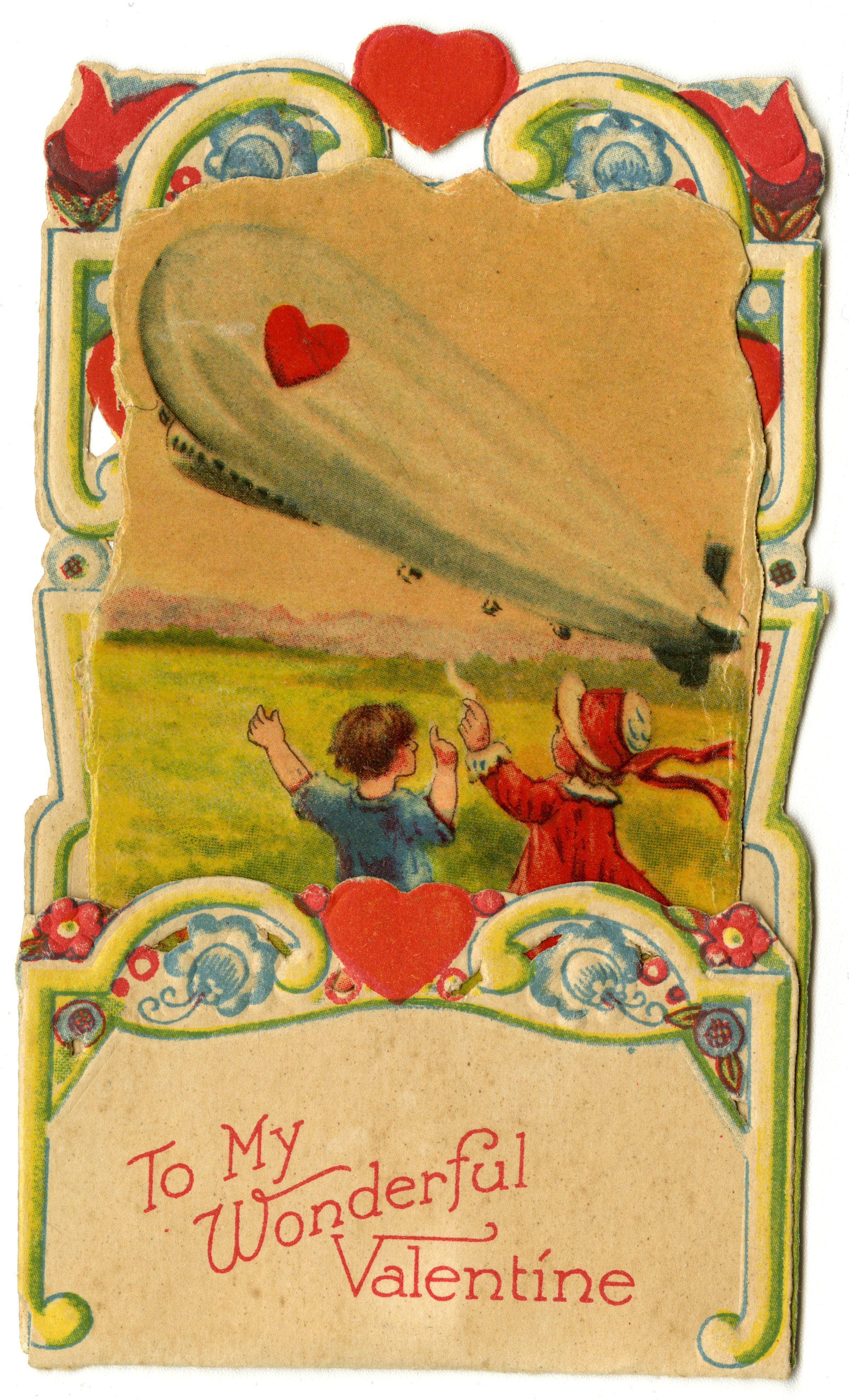 Dimensional Valentines's Day card with a boy and girl in a field beneath a dirigible. Marked "Made in Germany" and text says, "To my wonderful Valentine."