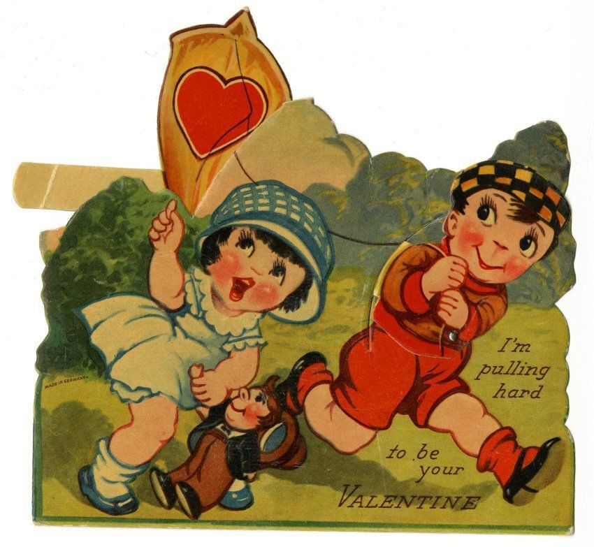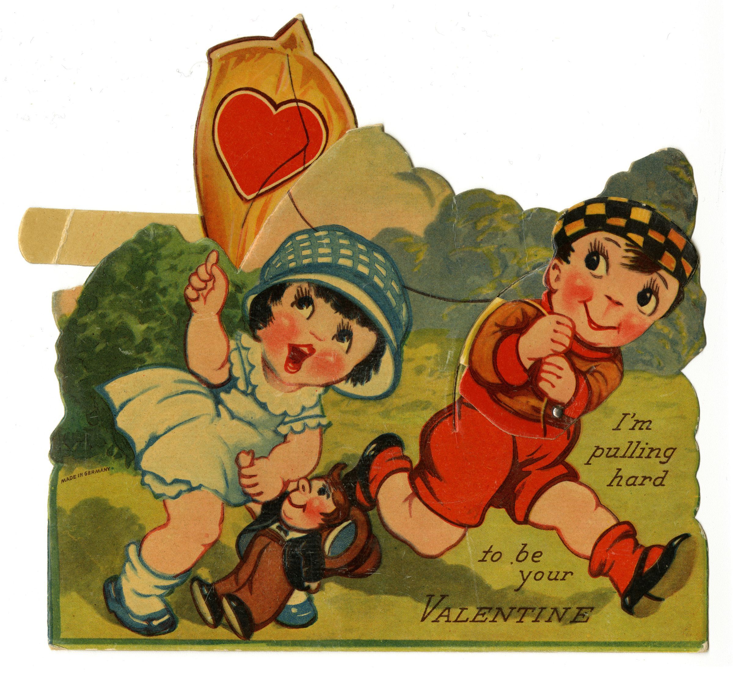 A mechanical Valentine's Day card with a scene of a little boy and girl flying a kite. A brad attaches the kite to the card. A small piece of paper on the bottom of the back of the card can be folded back to form a stand. Text reads "I'm pulling hard to be your Valentine."