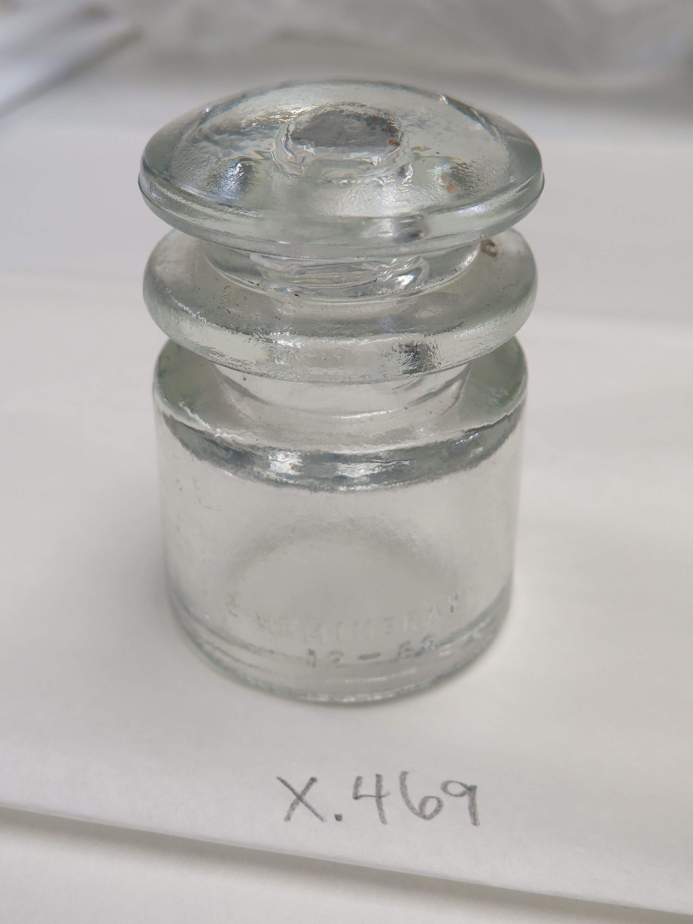 This is a clear glass insulator with the word "Hemingray" on it. The insulator measures 3.5" (h) x 2.5" (dia).