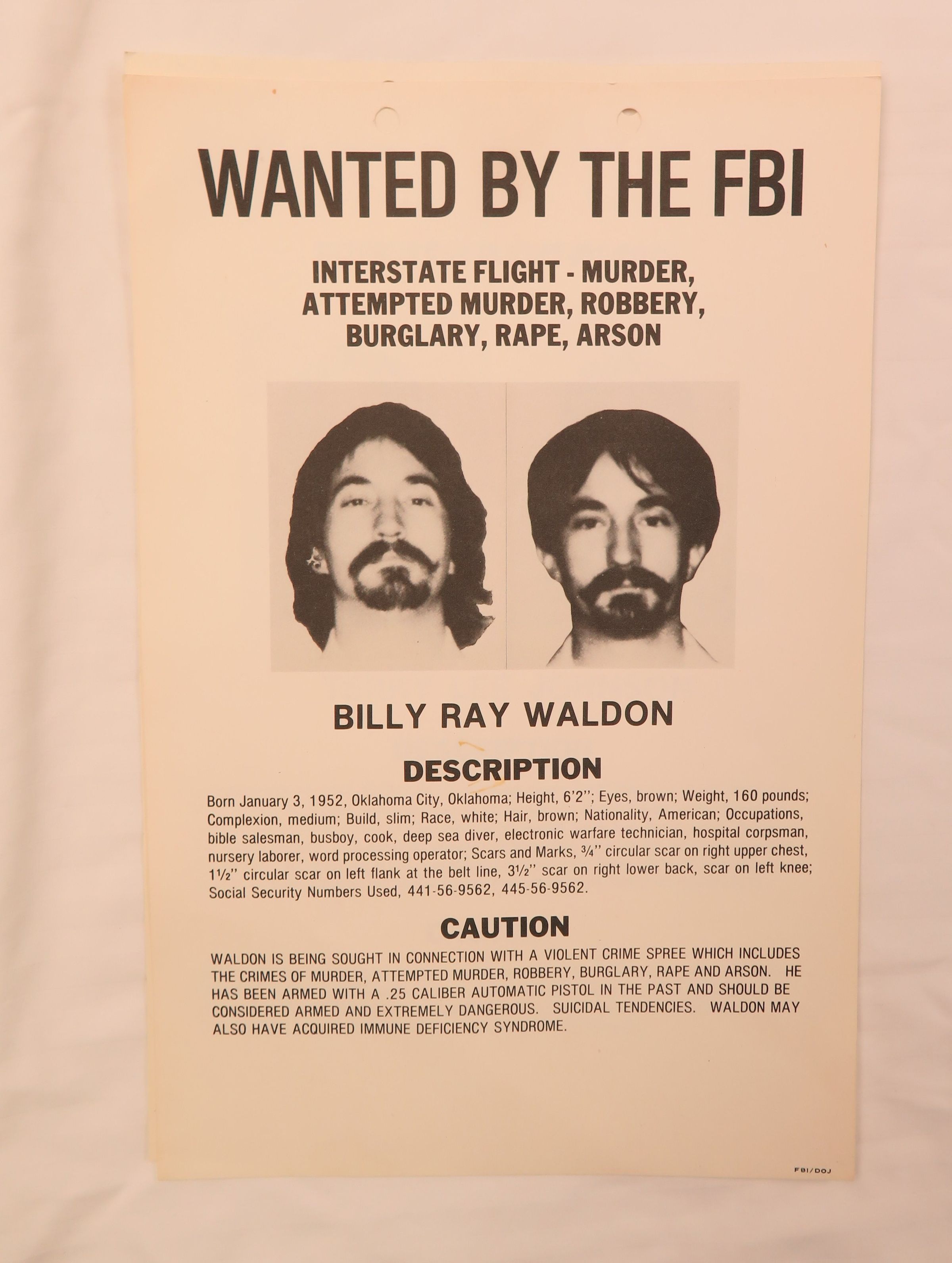 A 8.5" x 13" FBI wanted poster for Billy Ray Waldon used by the Broomfield Police Department, circa 1988. The poster was printed on a thin poster board, with two hole punches along the top edge. The poster includes two black and white photographic images of Waldon, one depicting him with long hair and one depicting him with shorter hair, along with detailed information on his general background, crimes committed, and a message of caution. The poster was printed and distributed by both the Federal Bureau of Investigation (FBI) and Department of Justice (DOJ).Collection