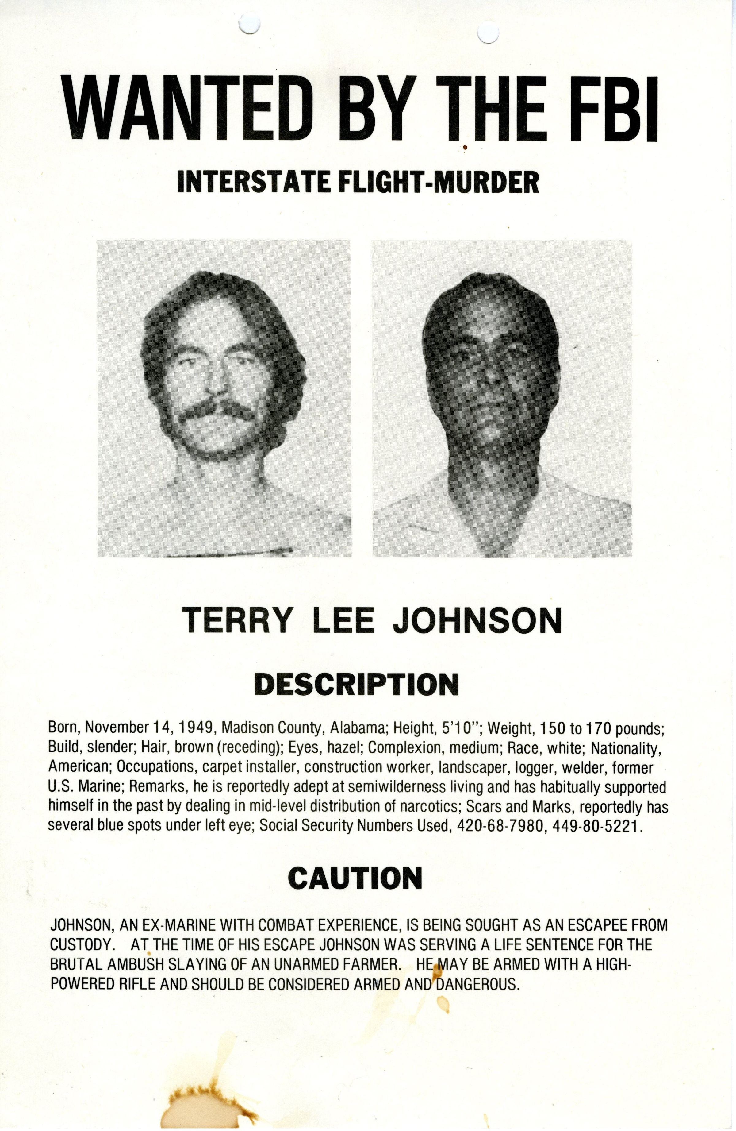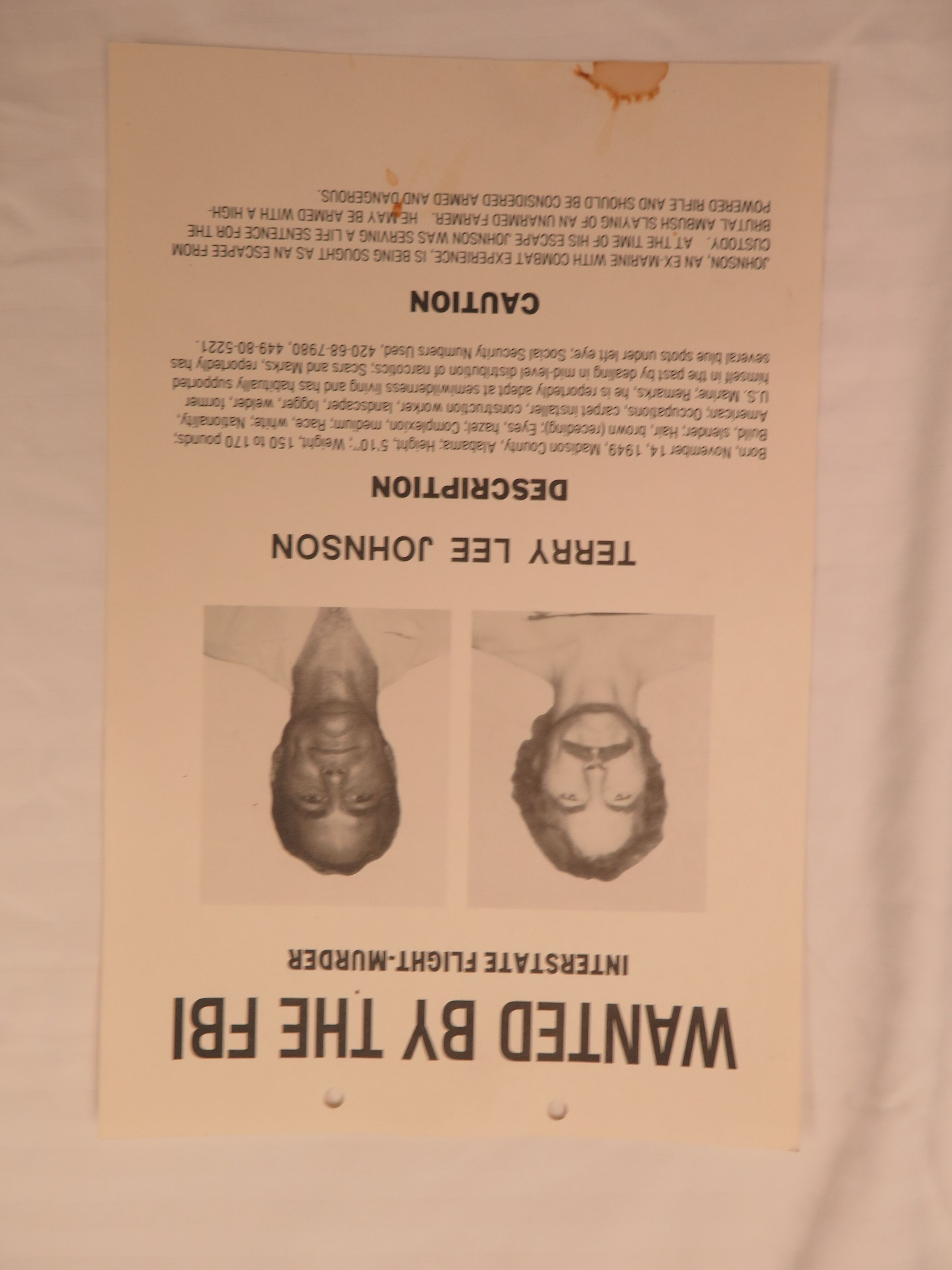 A 8.5" x 13" FBI wanted poster for Terry Lee Johnson used by the Broomfield Police Department, circa 1988. The poster was printed on a thin poster board, with two hole punches along the top edge. The poster includes two black and white photographic images of Johnson, one in profile and one from the front, along with detailed information on his general background, crimes committed, and a message of caution. The poster was printed and distributed by both the Federal Bureau of Investigation (FBI) and Department of Justice (DOJ).Collection