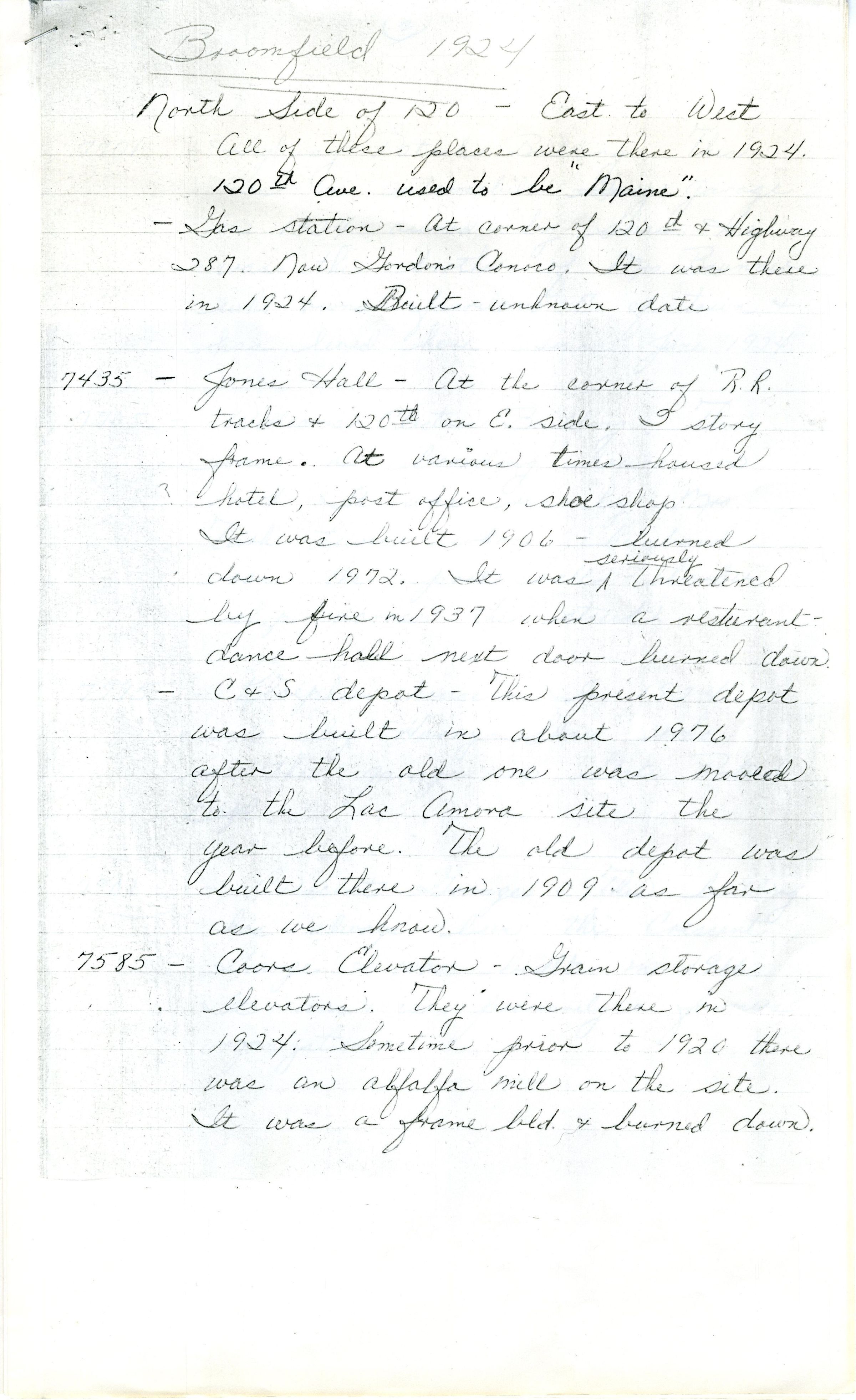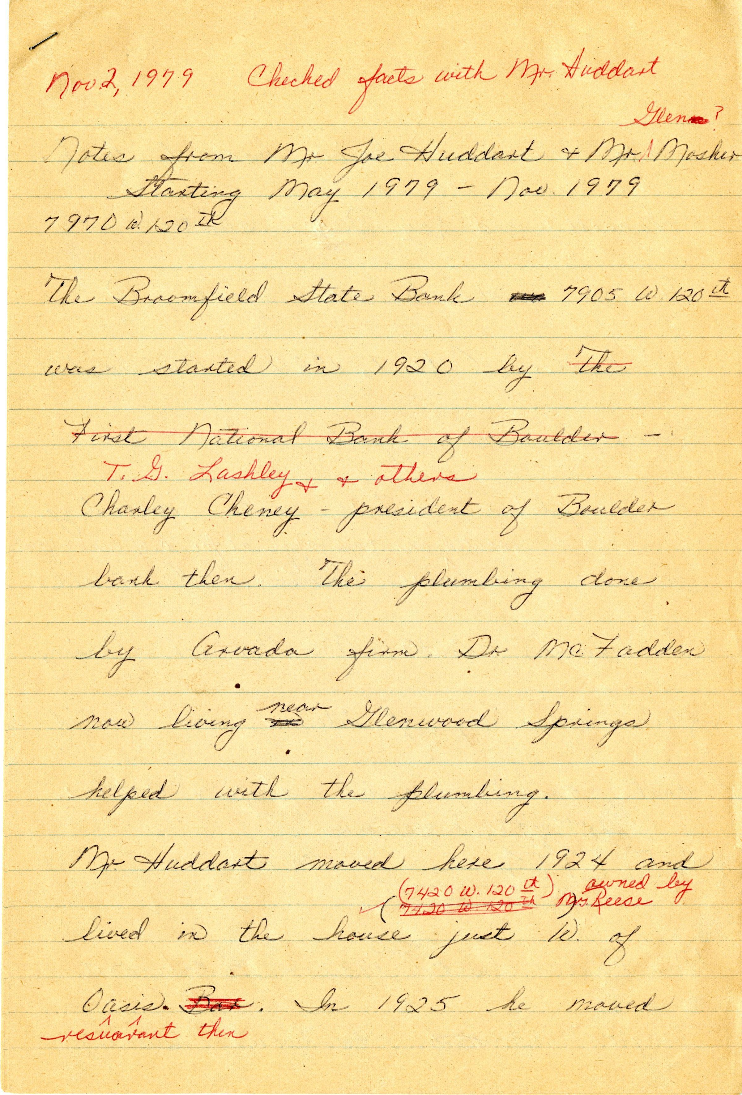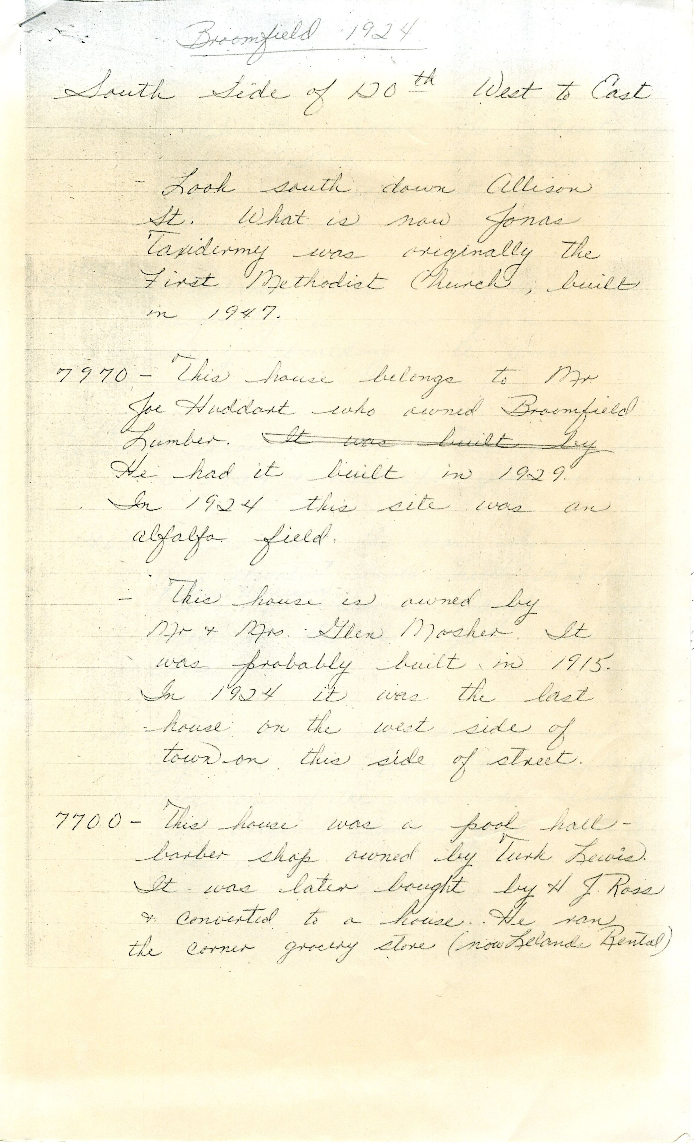These notes may have accompanied slides developed around the same time that the research was compiled in 1979. Information on houses in the notes appears to pertain directly to houses shown in the slides' images. The slides are numbered Ph.1004-1042 and Ph.1943 in Broomfield Depot Museum collections.