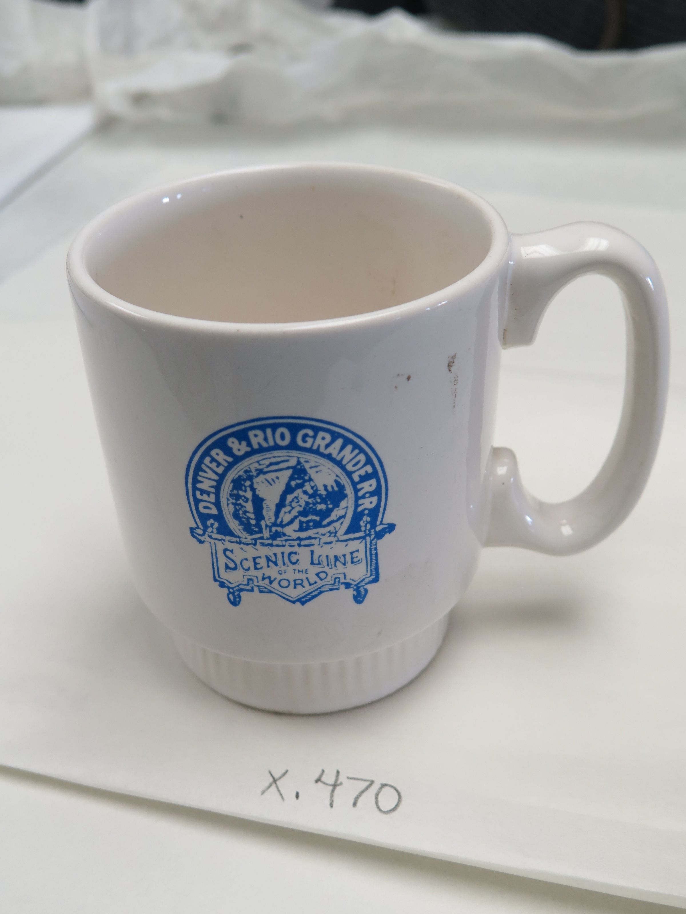 This is a white ceramic coffee mug with a logo for the Denver & Rio Grande R.R. Scenic Line of the World on the front in blue. The mug has a handle and measures 3.75" (h) x 4.5" (w) x 3.25" (dia).