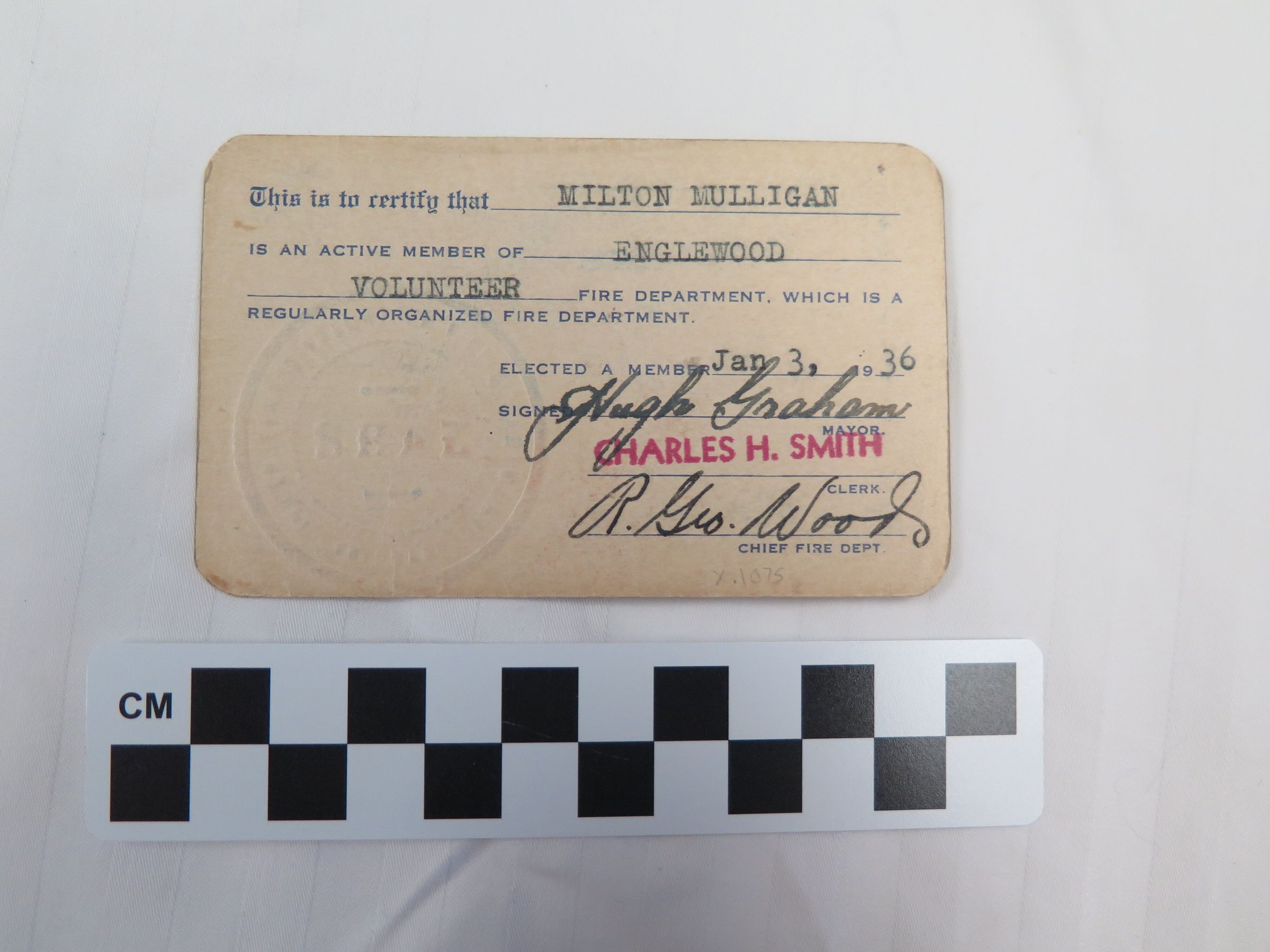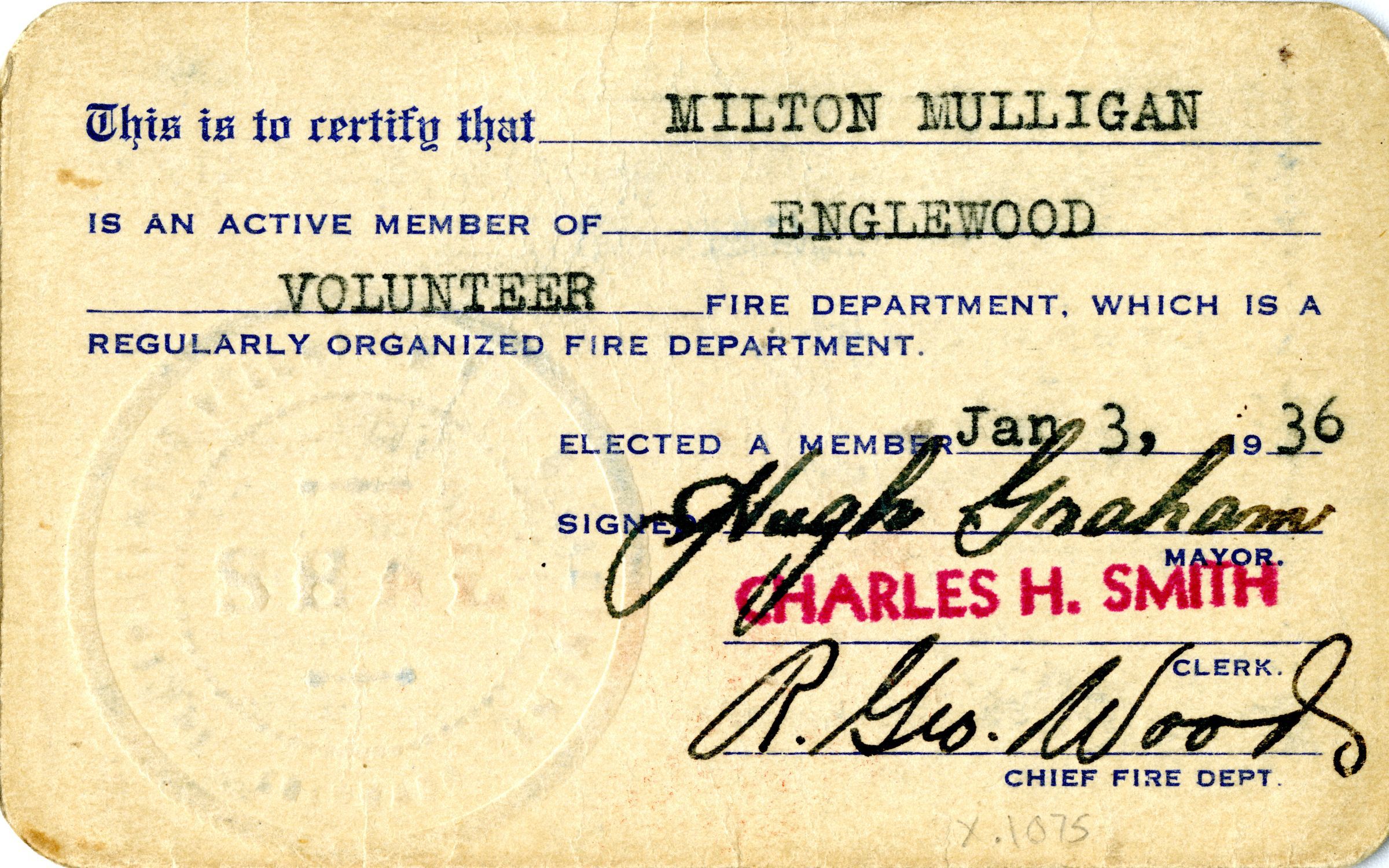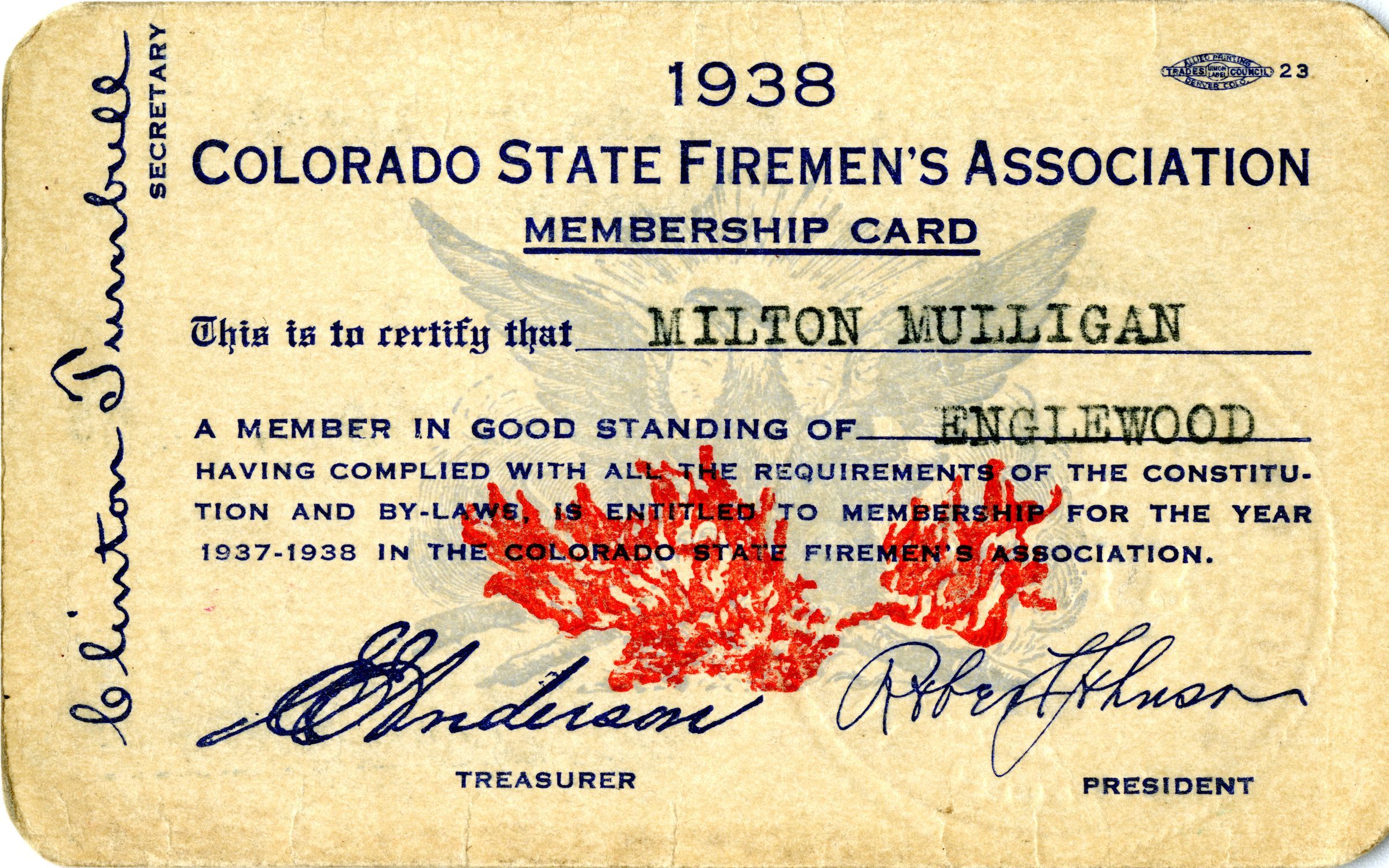 A Colorado State Firemen's Association membership card for Milton Mulligan, 1938. The card is 2.5" x 4". The card verifies that Mulligan was part of the organization that year, and includes an imprinted stamp seal for the Englewood Volunteer Fire Department. An illustration of an eagle is visible behind the text on the front. Signatures from the Association Secretary, Treasurer, and President, the Mayor and Clerk of Englewood, and the fire department chief are also present on the card, front to back. The card was printed by Allied Printing Trades Council, Denver, Colorado.Collection