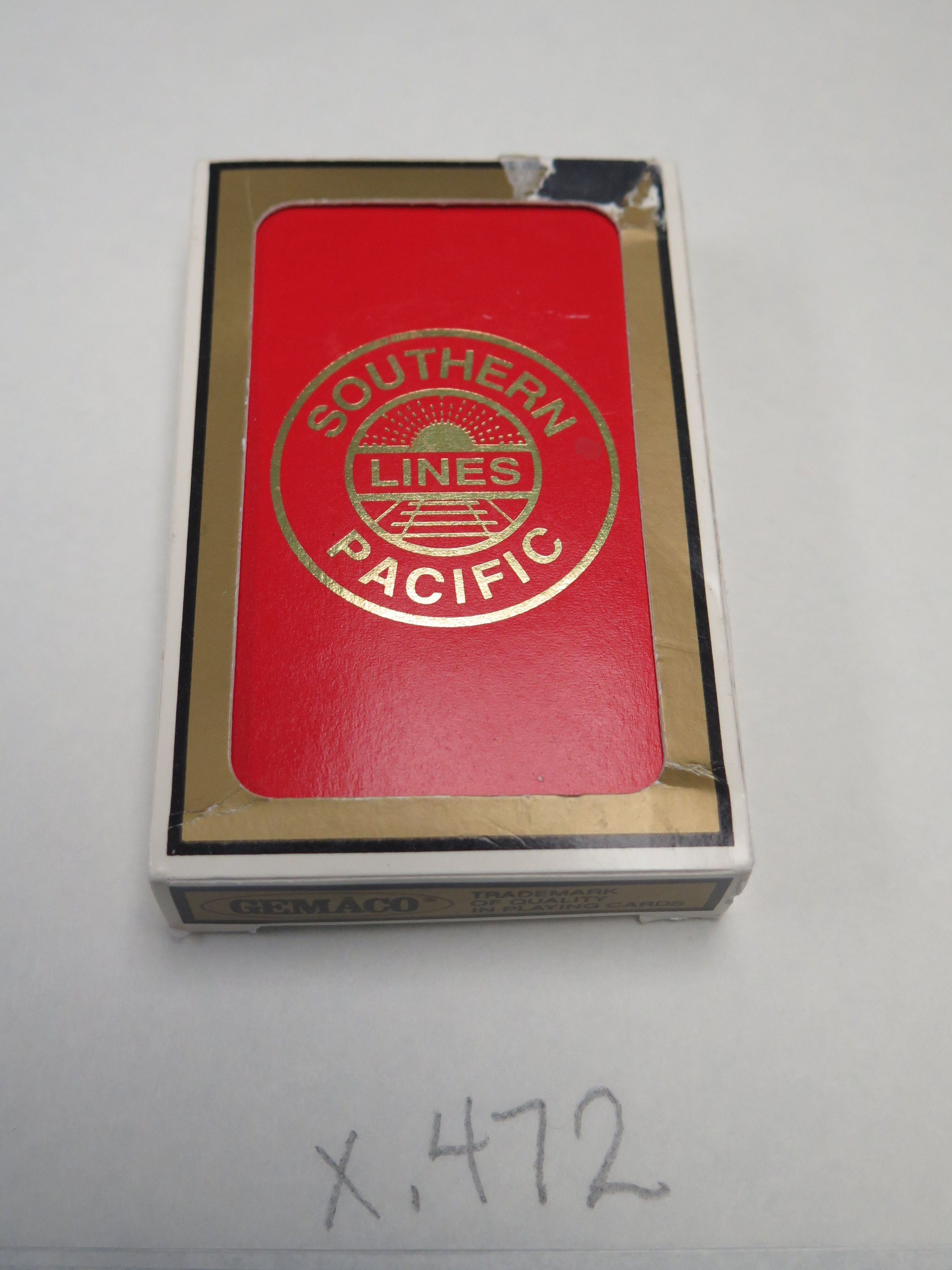 This is a set or deck of playing ccards in a red box. The box has the Southern Pacfic logo on the front in gold. The box measures 0.5" (h) x 2.25" (w) x 3.25" (l).