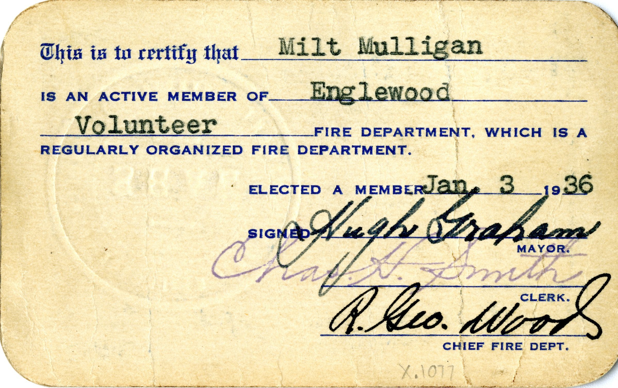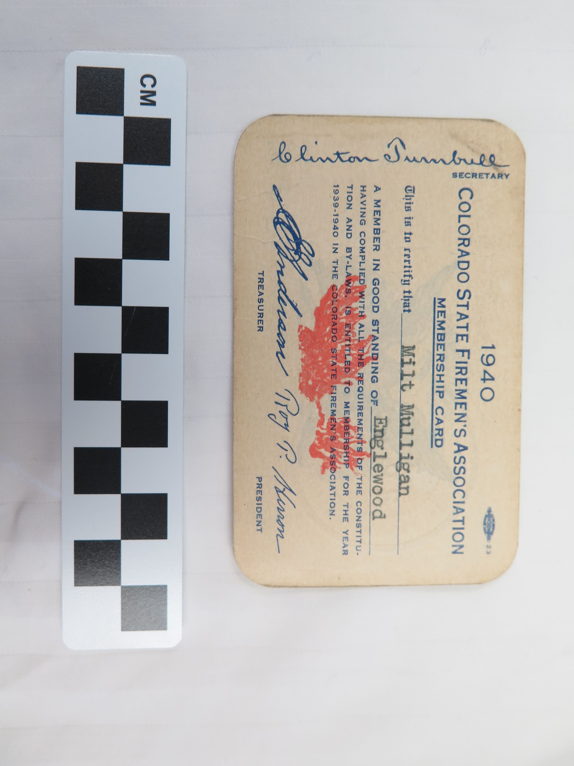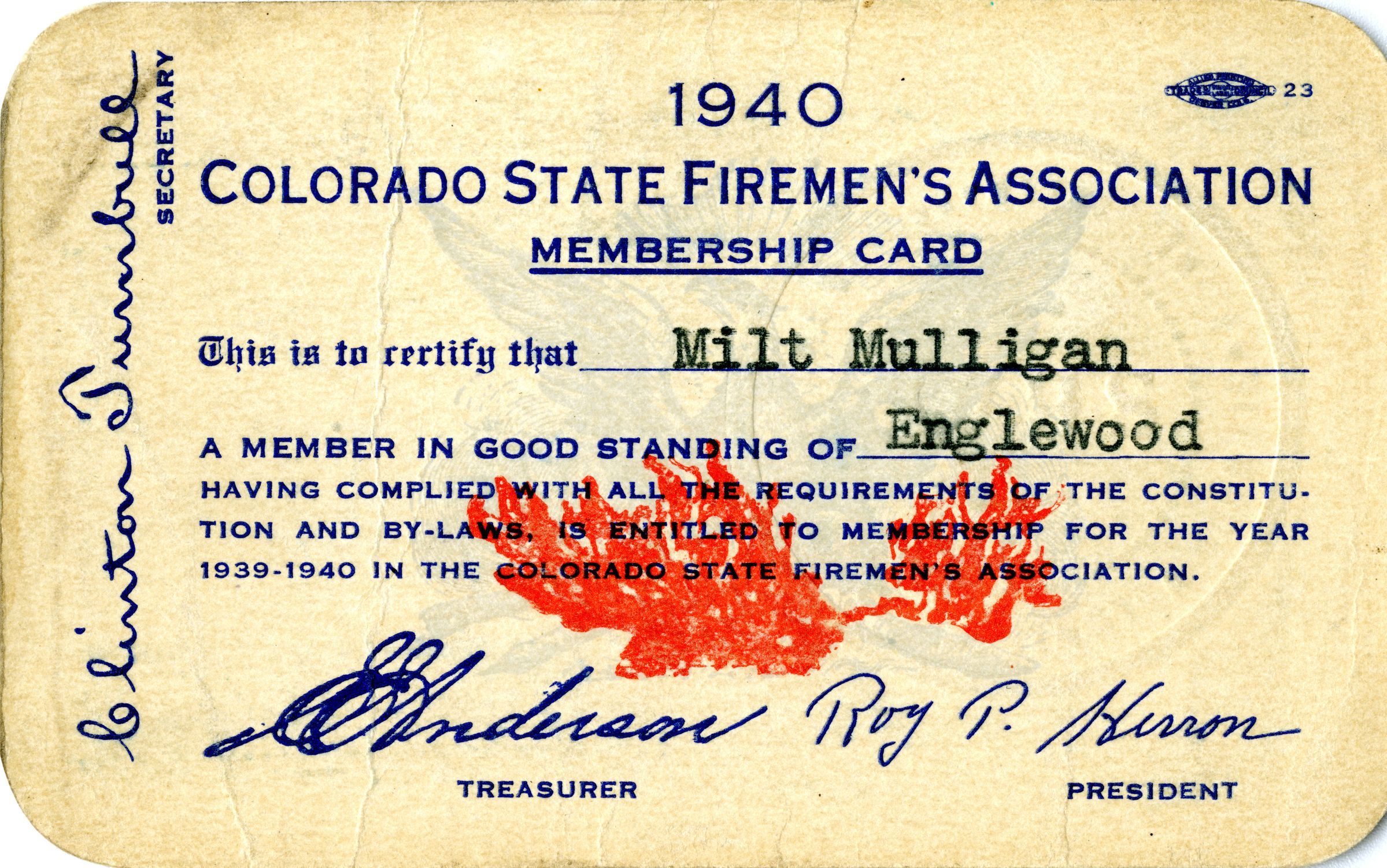 A Colorado State Firemen's Association membership card for Milton Mulligan, 1940. The card is 2.5" x 4". The card verifies that Mulligan was part of the organization that year, and includes an imprinted stamp seal for the Englewood Volunteer Fire Department. An illustration of an eagle is visible behind the text on the front. Signatures from the Association Secretary, Treasurer, and President, the Mayor and Clerk of Englewood, and the fire department chief are also present on the card, front to back. The card was printed by Allied Printing Trades Council, Denver, Colorado.Collection