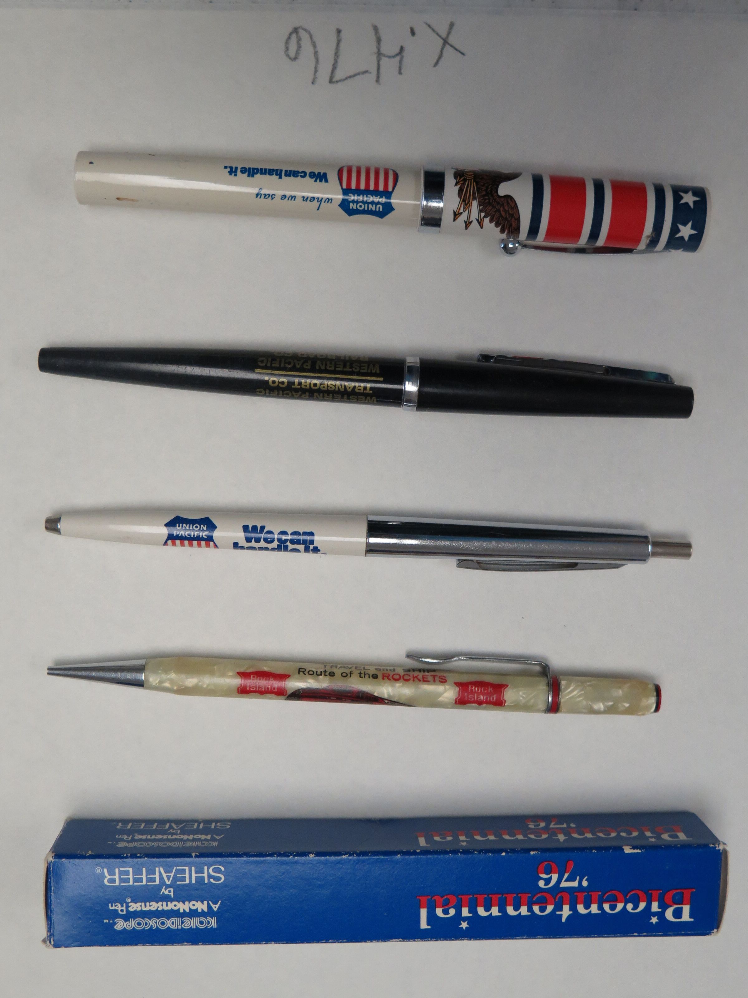 This is a set of 4 pens. The set includes a blue box with the words "Bicentennial '76" on the side, a Rock Island pen with a pearled appearance, a Union Pacific pen that clicks open, a black Western Pacific pen, and a white Union Pacific pen with a lid. The box measures 1" (h) x 1" (w) x 6" (l).