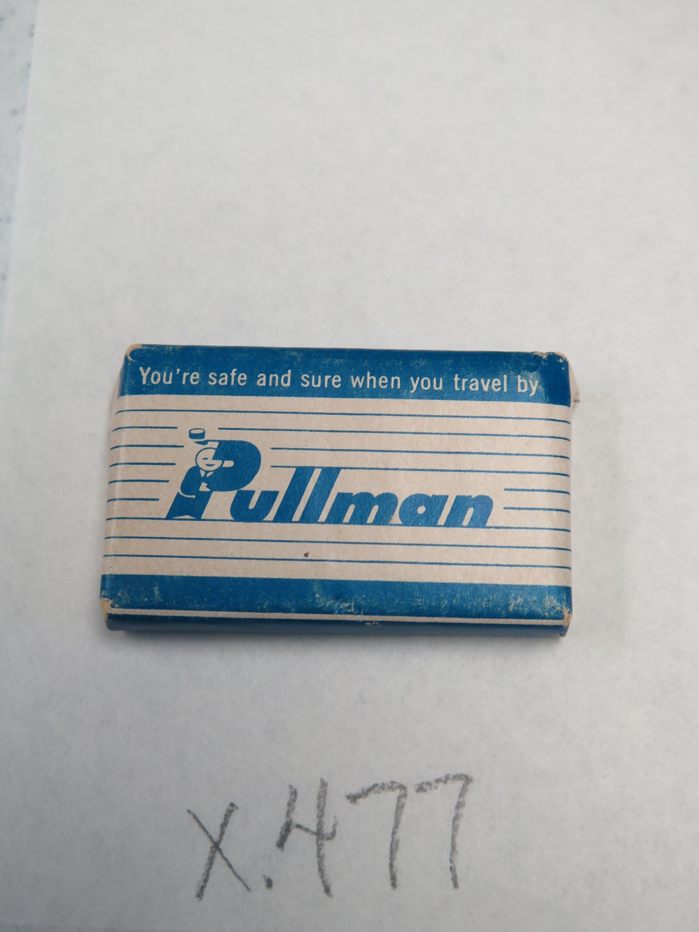 This is a bar of soap in blue and white packaging, The text on the front of the packaging reads, "You're safe and sure when you travel by/ Pullman". The soap measures 0.25" (h) x 1.25" (w) x 2.25" (l).