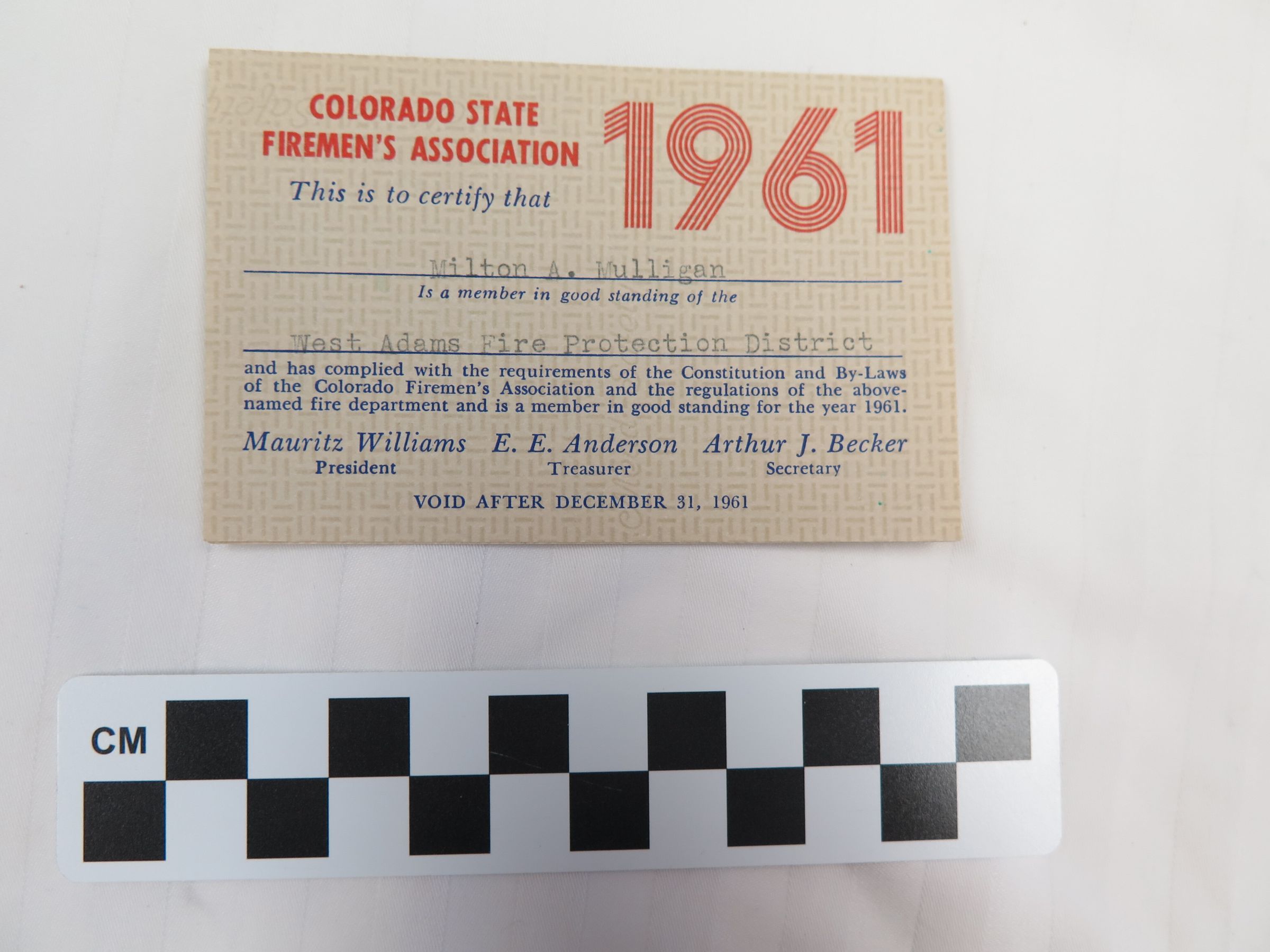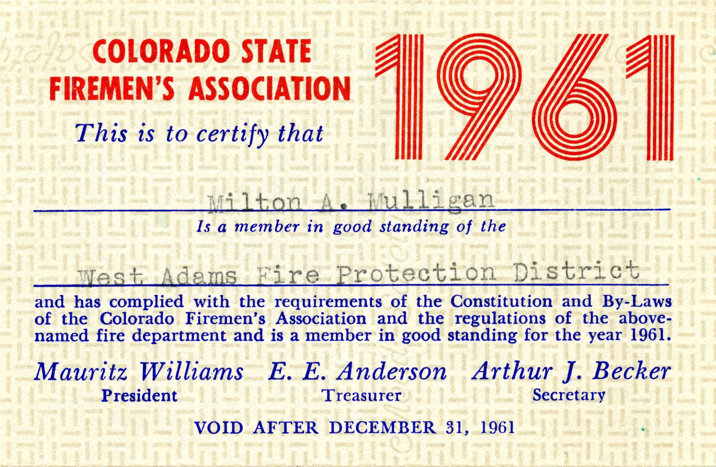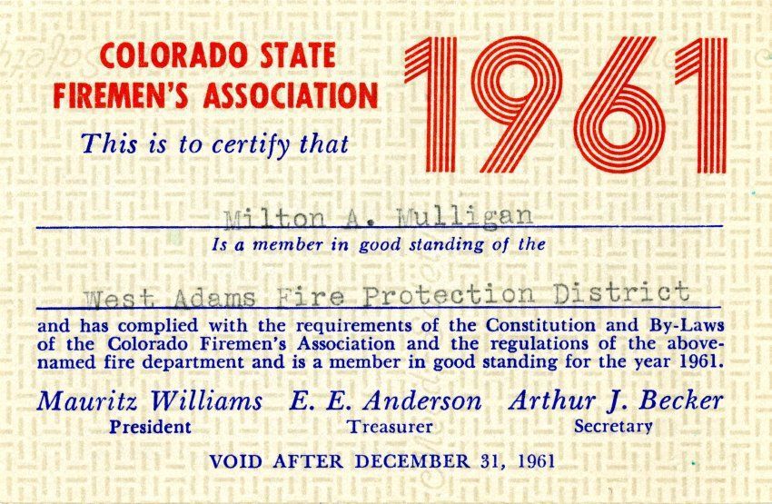 Milton Mulligan's Colorado State Firemen's Association Membership Card, 1961Entry/Object ID