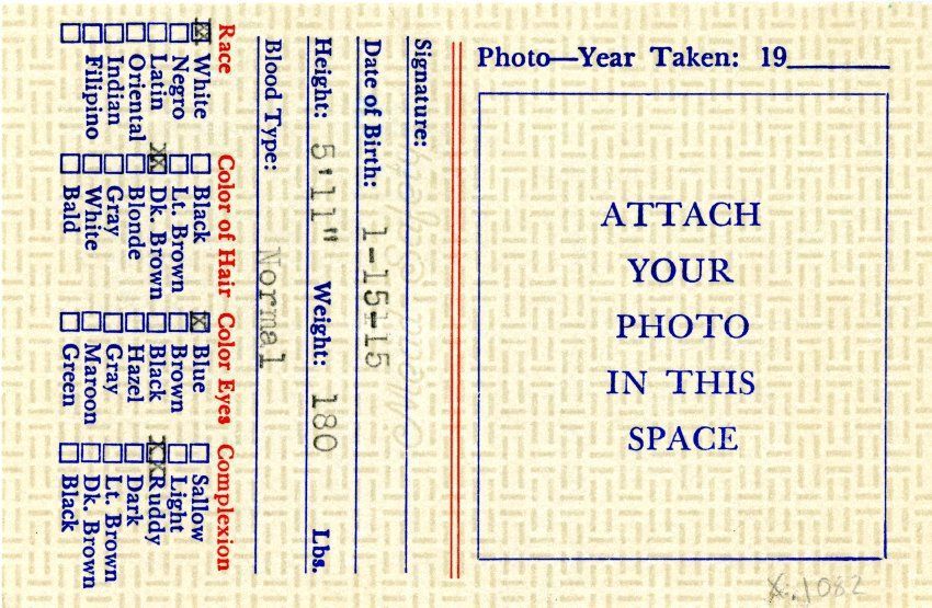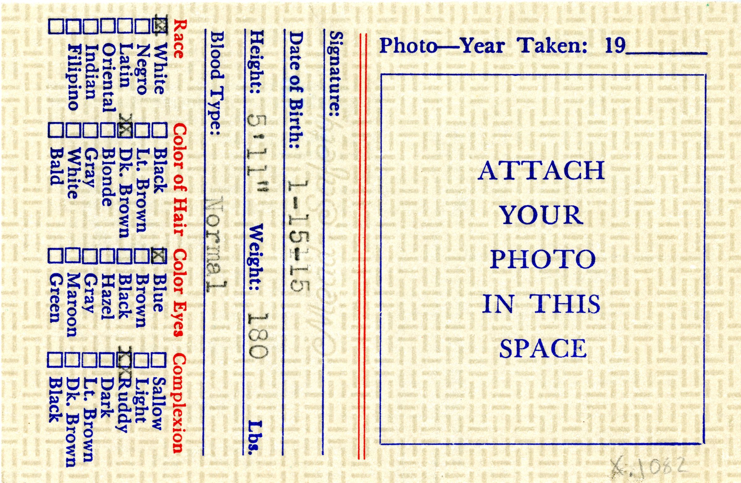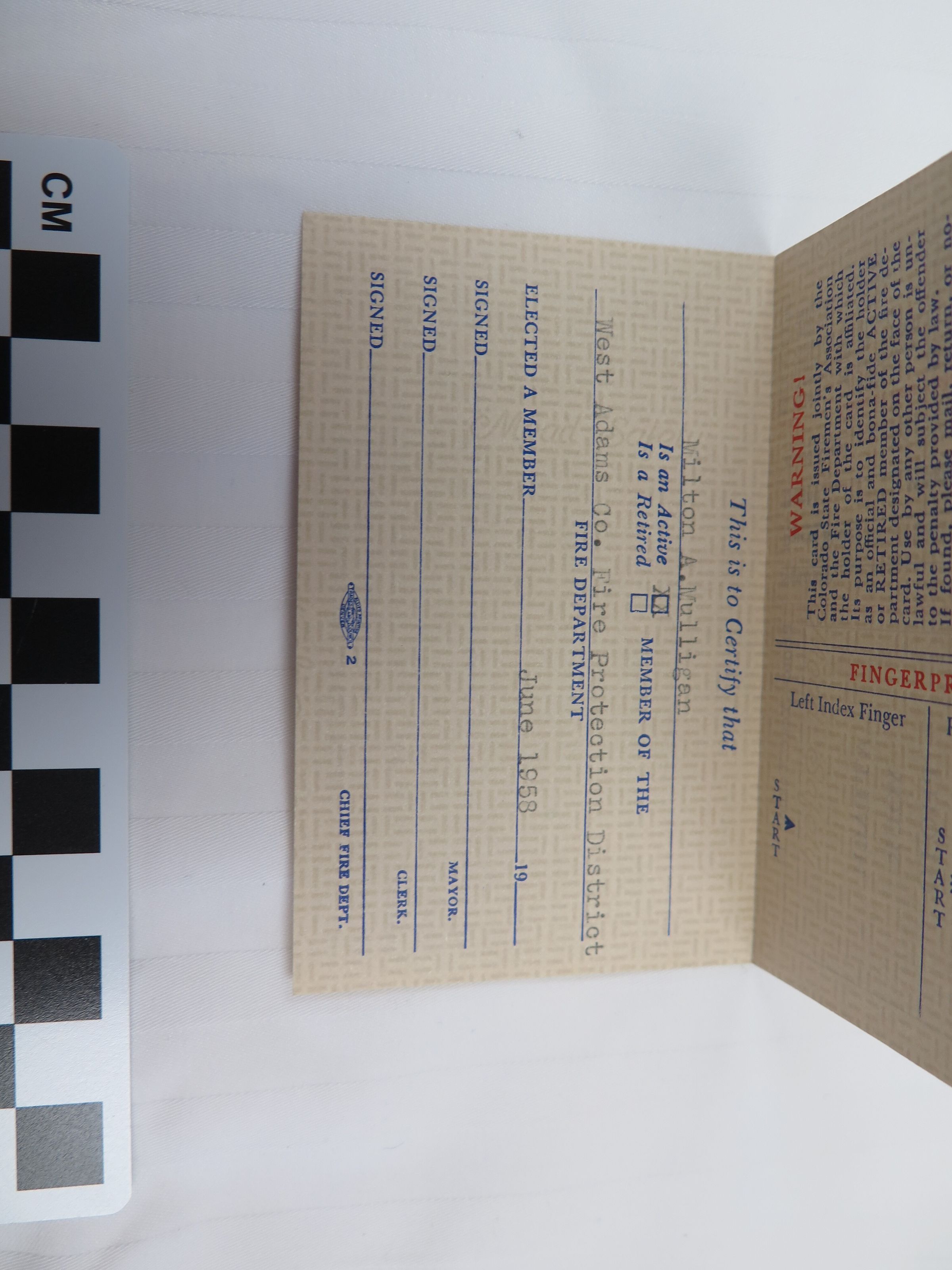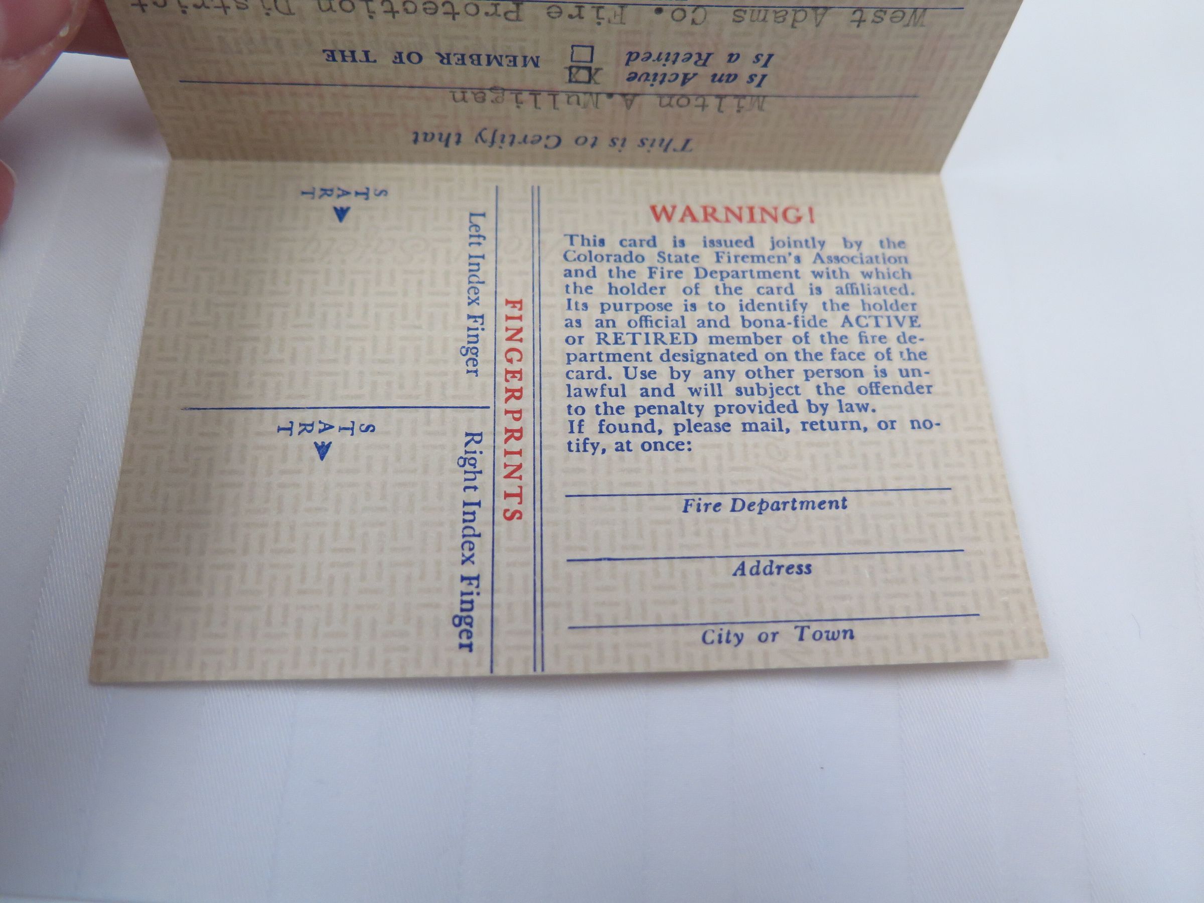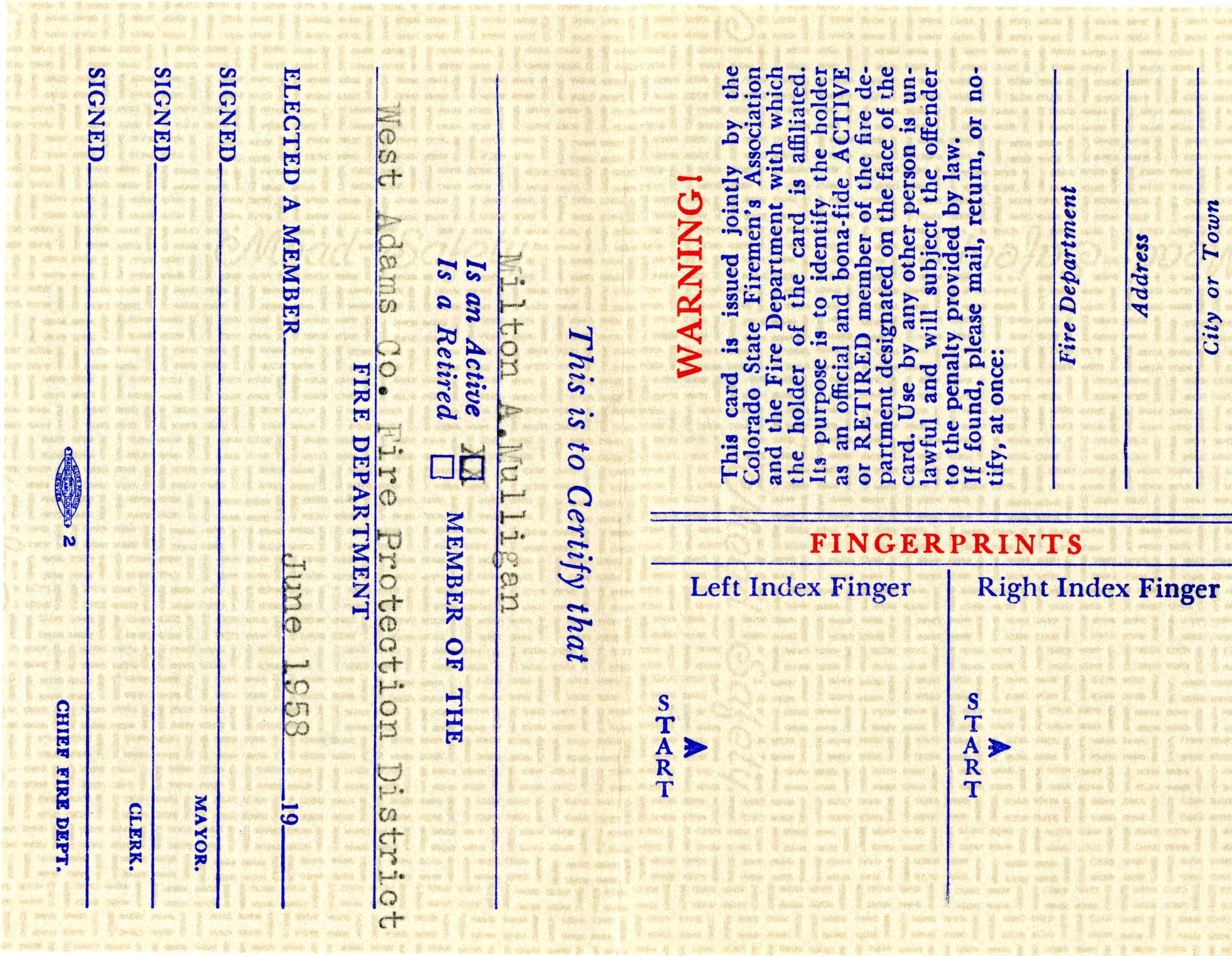 A Colorado State Firemen's Association membership card for Milton Mulligan, 1961. The card is 2.5" x 4.5" and yellow with line designs behind the text. Mulligan is certified as a member of the Association and the West Adams Fire Protection District. The names of Association members Mauritz Williams (President), E.E. Anderson (Treasurer), and Arthur J. Becker (Secretary) are printed on the front. The card opens to show additional information, including spaces for fingerprints. The reverse side has information on date of birth, height, weight, blood type, and appearance for Mulligan, as well as a designated area for a photo. The card was printed by Allied Printing Trades Council, Denver, Colorado.Collection