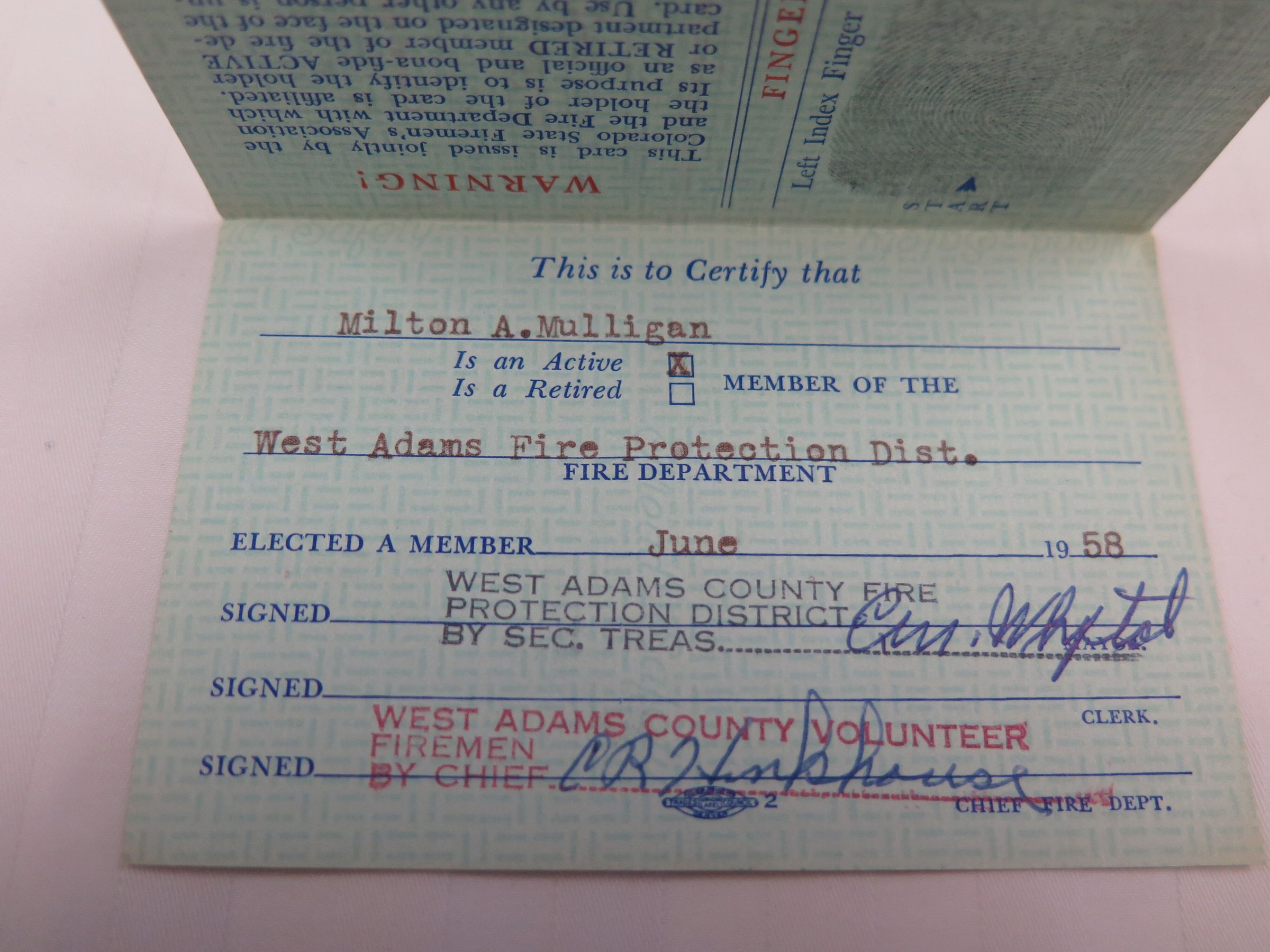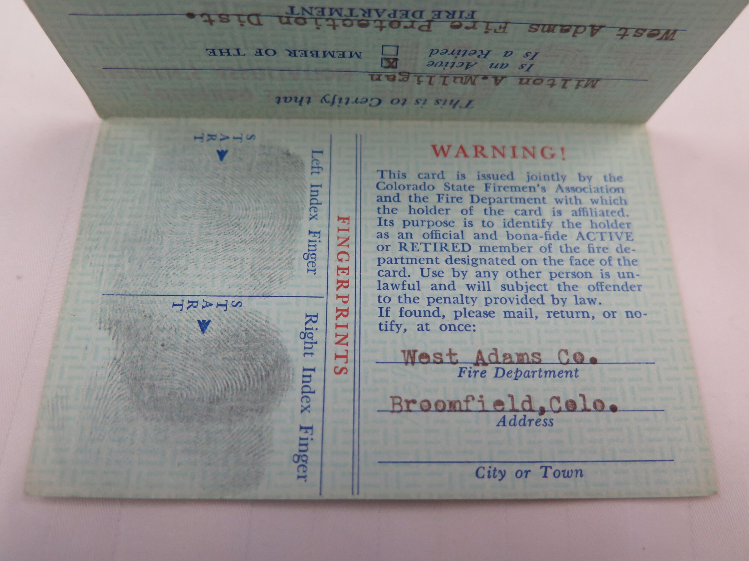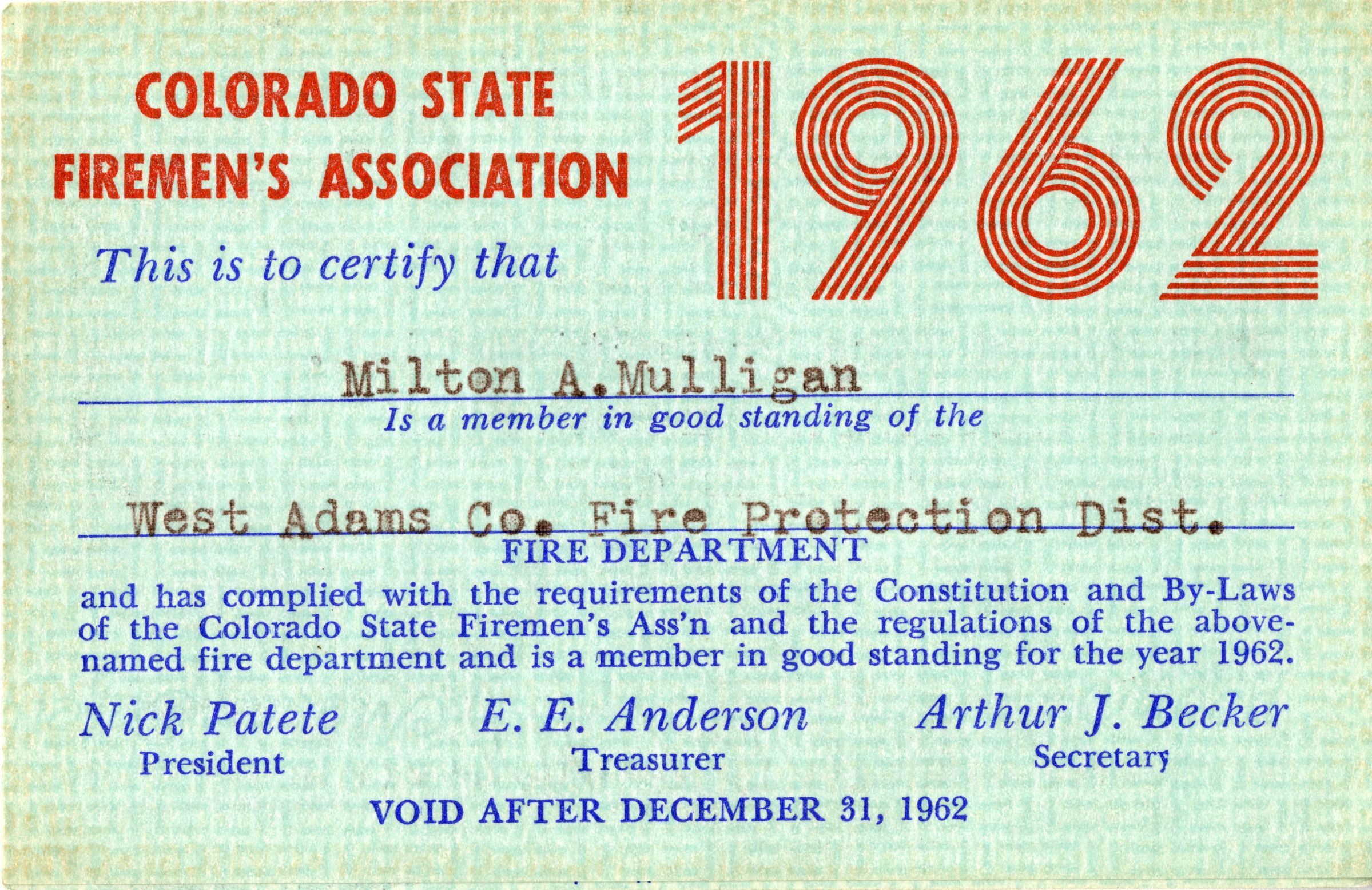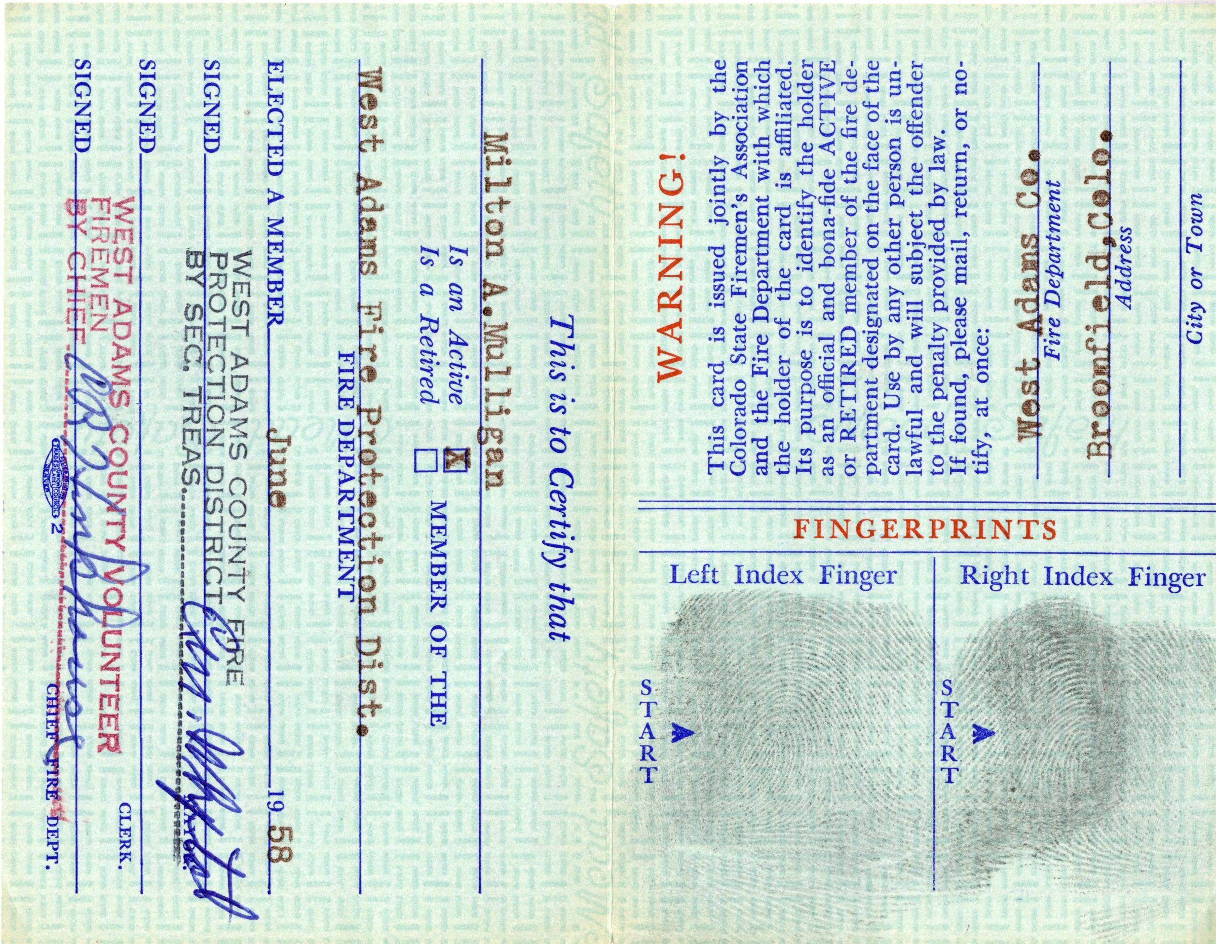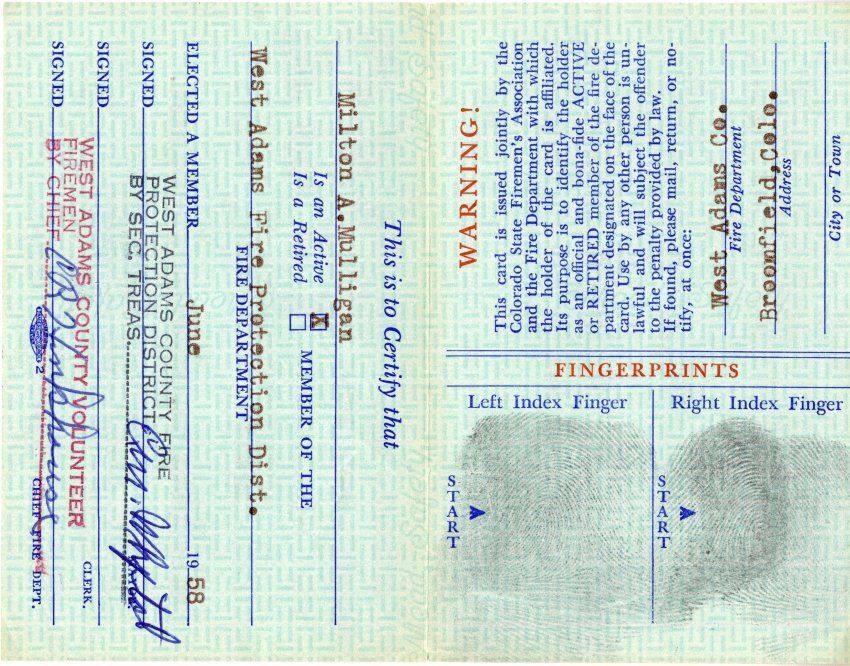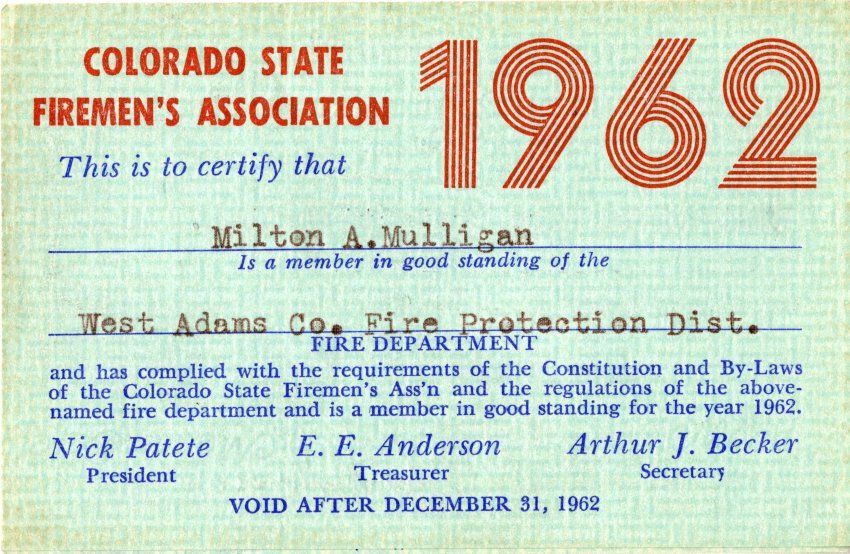 A Colorado State Firemen's Association membership card for Milton Mulligan, 1962. The card is 2.5" x 4.5" and green with line designs behind the text. Mulligan is certified as a member of the Association and the West Adams Fire Protection District. The names of Association members Mauritz Williams (President), E.E. Anderson (Treasurer), and Arthur J. Becker (Secretary) are printed on the front. The card opens to show additional information, including fingerprints and signatures from the West Adams County Fire Protection District Secretary Treasurer and Chief. The reverse side has information on date of birth, height, weight, blood type, and appearance for Mulligan, as well as a designated area for a photo. The card was printed by Allied Printing Trades Council, Denver, Colorado.Collection
