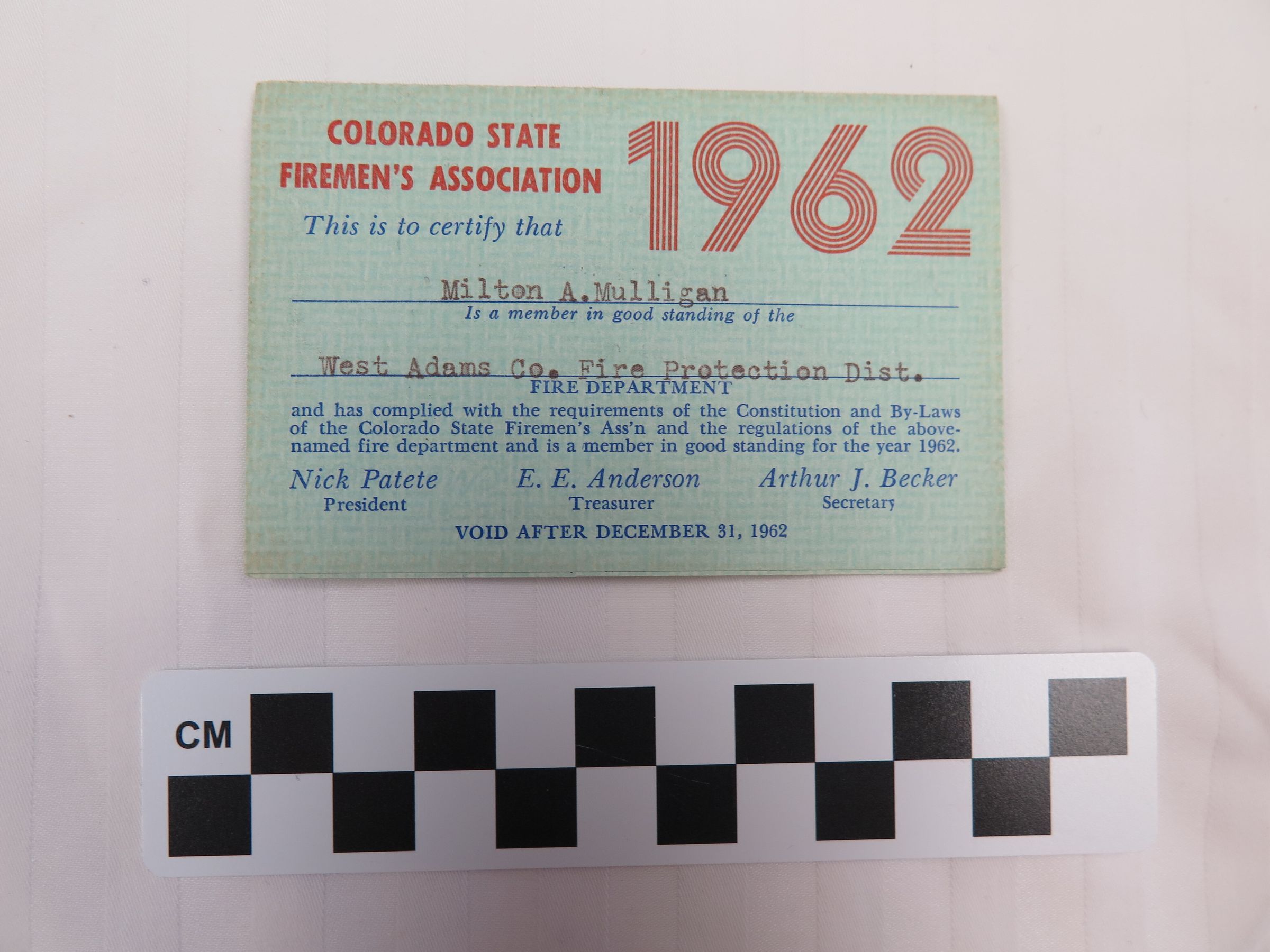 Milton Mulligan's Colorado State Firemen's Association Membership Card, 1962Entry/Object ID
