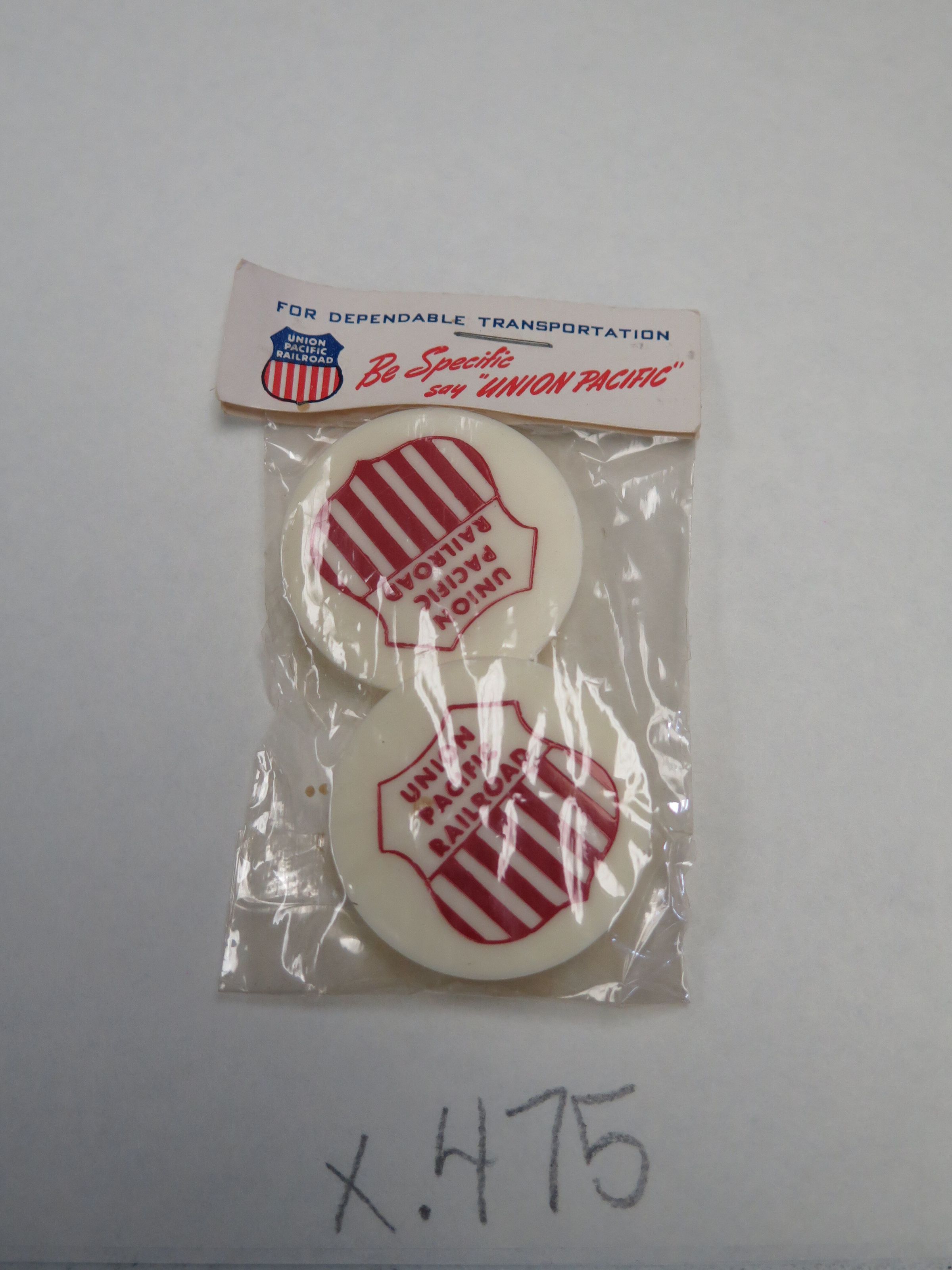 This is a set of 2 Union Pacific bottle caps in the original packaging. The caps are white with the Union Pacific logo in red. The packaging is a plastic bag with a piece of cardboard stapled to the top. The bag measures 2.5" (w) x 3.75" (l).