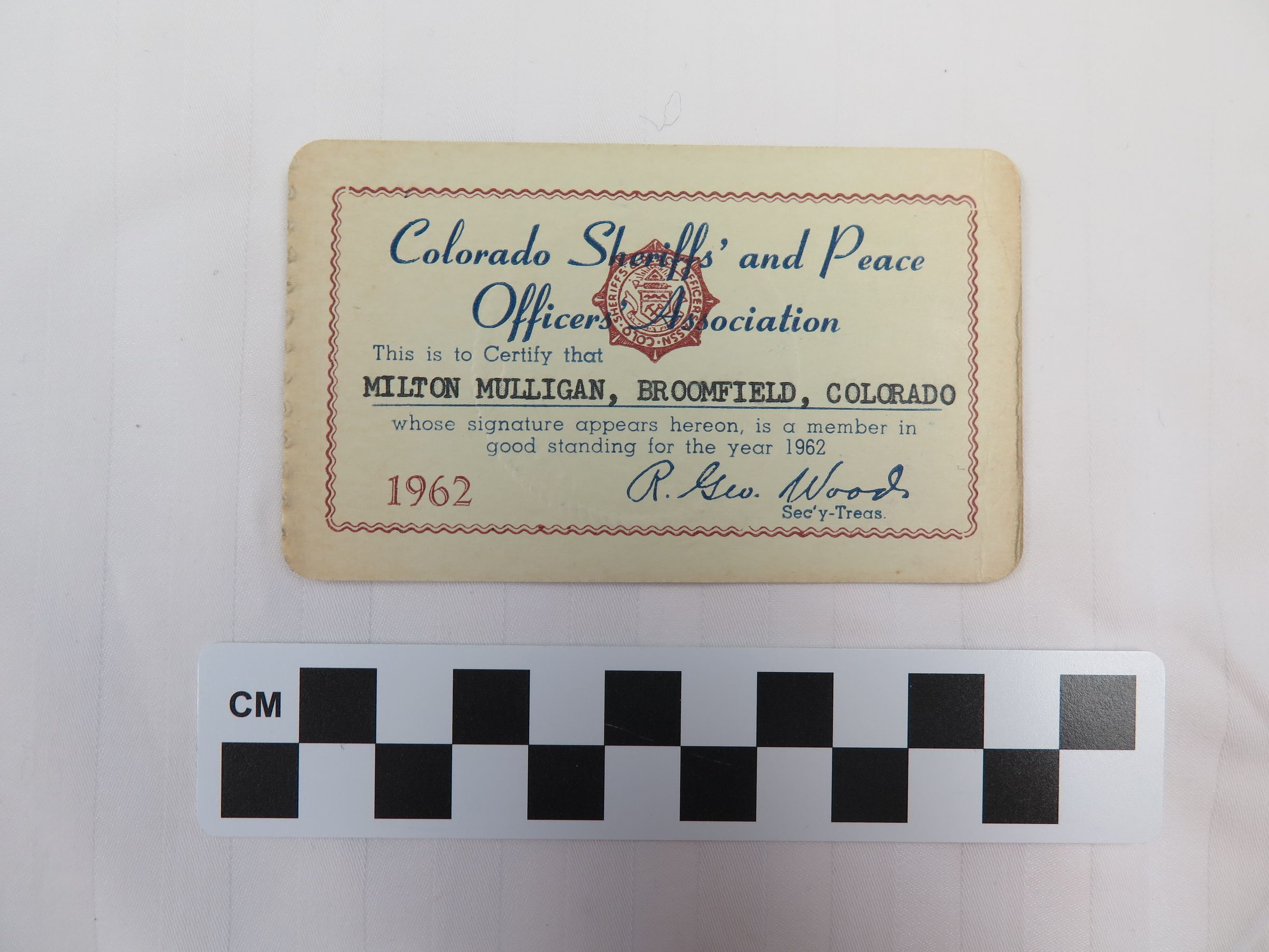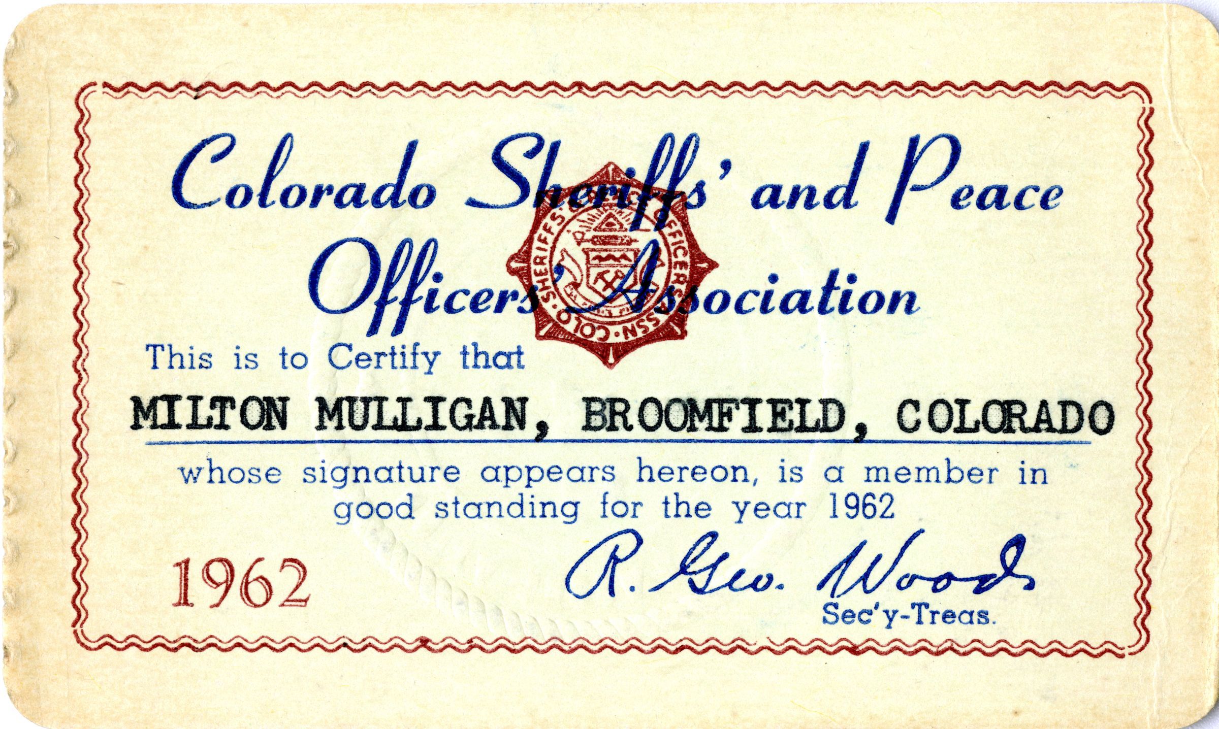 A Colorado Sheriffs' and Peace Officers' Association membership card for Milton Mulligan, 1962. The card is 2.5" x 4.5" with a waving red interior border on the front and the Association's seal behind the text. The card is signed by the Secretary Treasurer R. George Wood on the front, and by Mulligan on the back, certifying that Mulligan was a member of the Association.