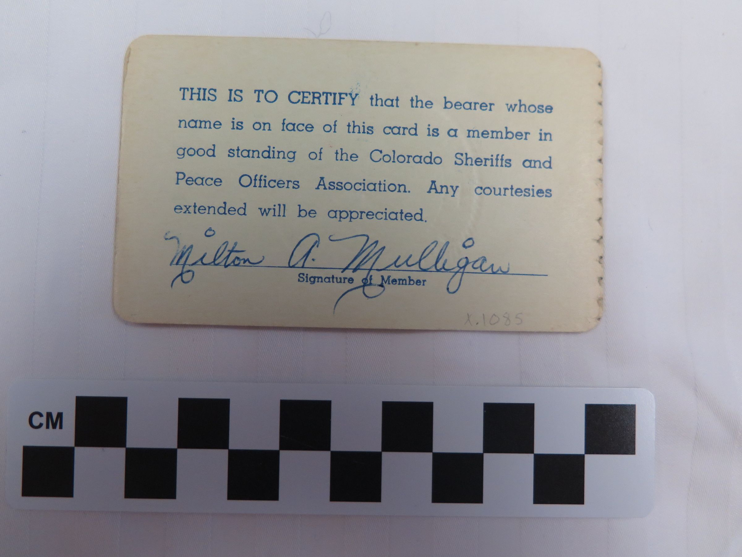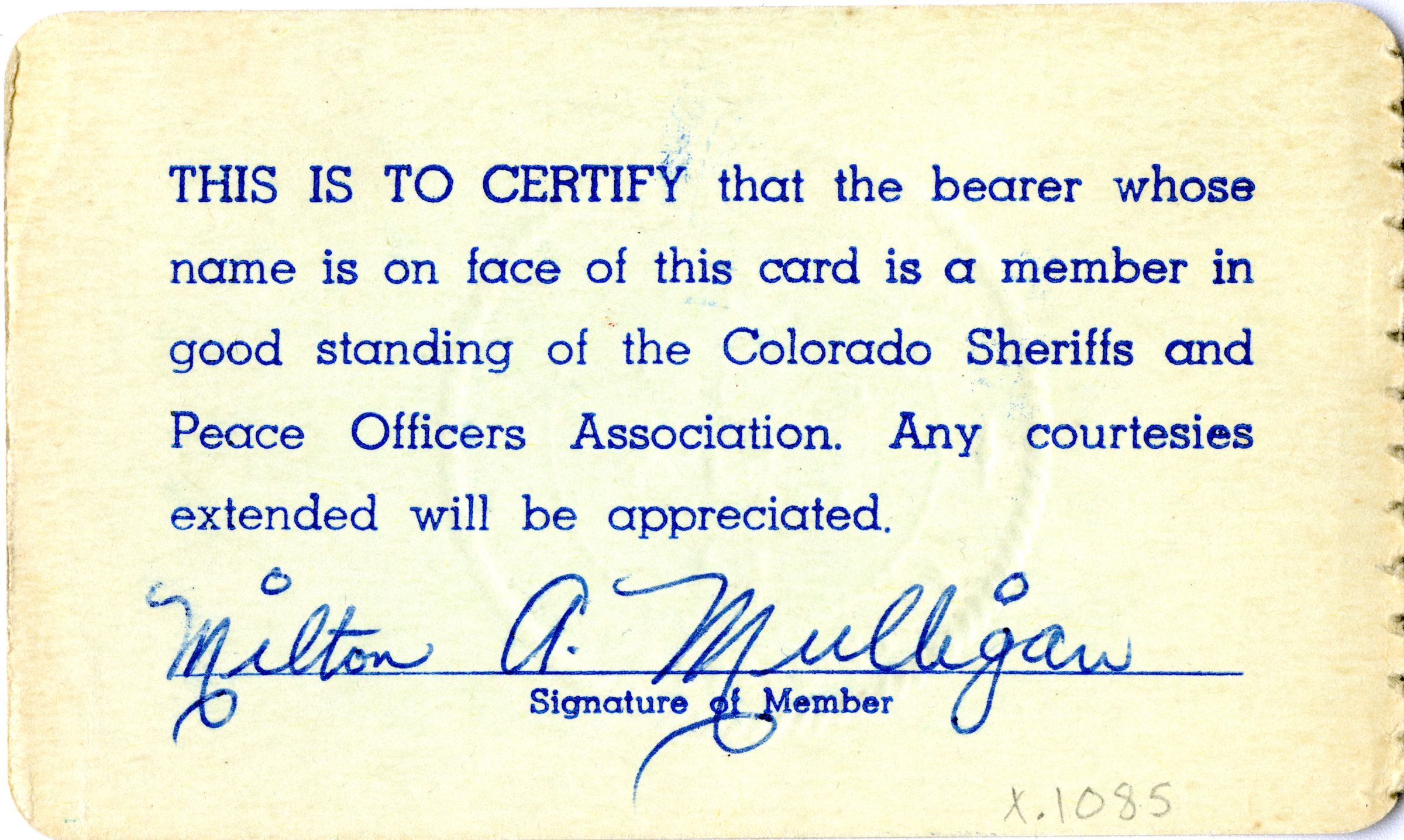 Milton Mulligan's Colorado Sheriffs' and Peace Officers' Association Membership Card, 1962