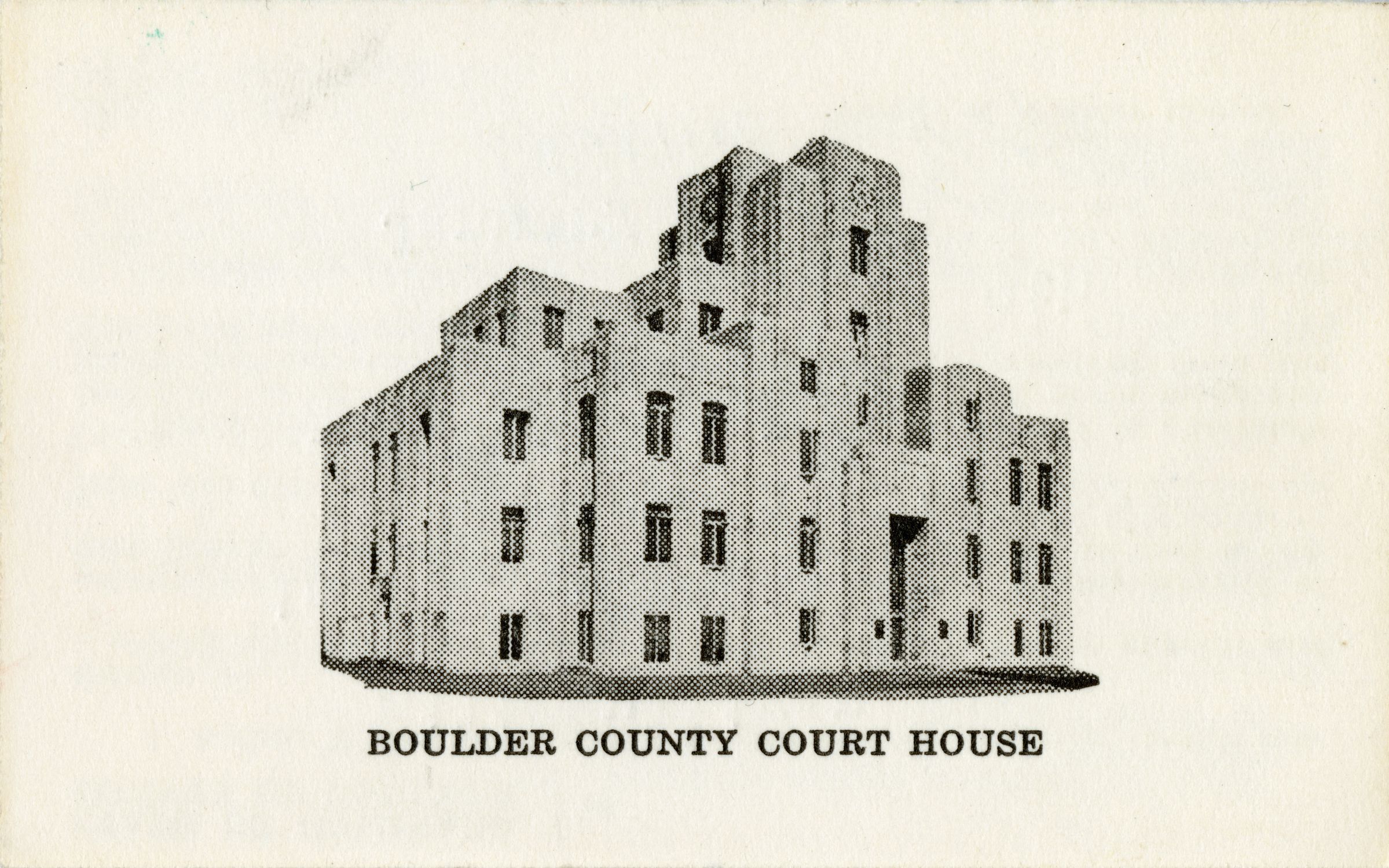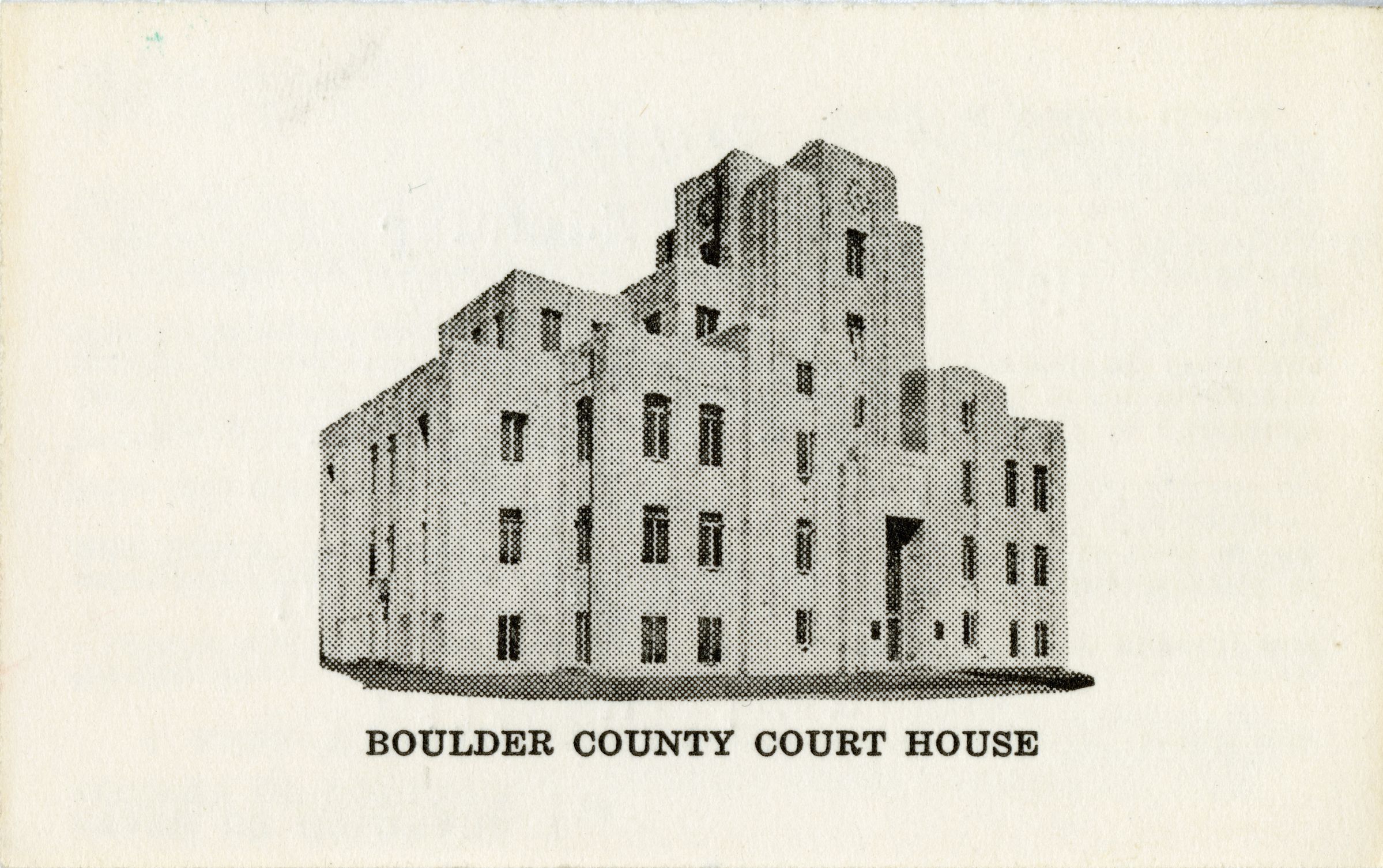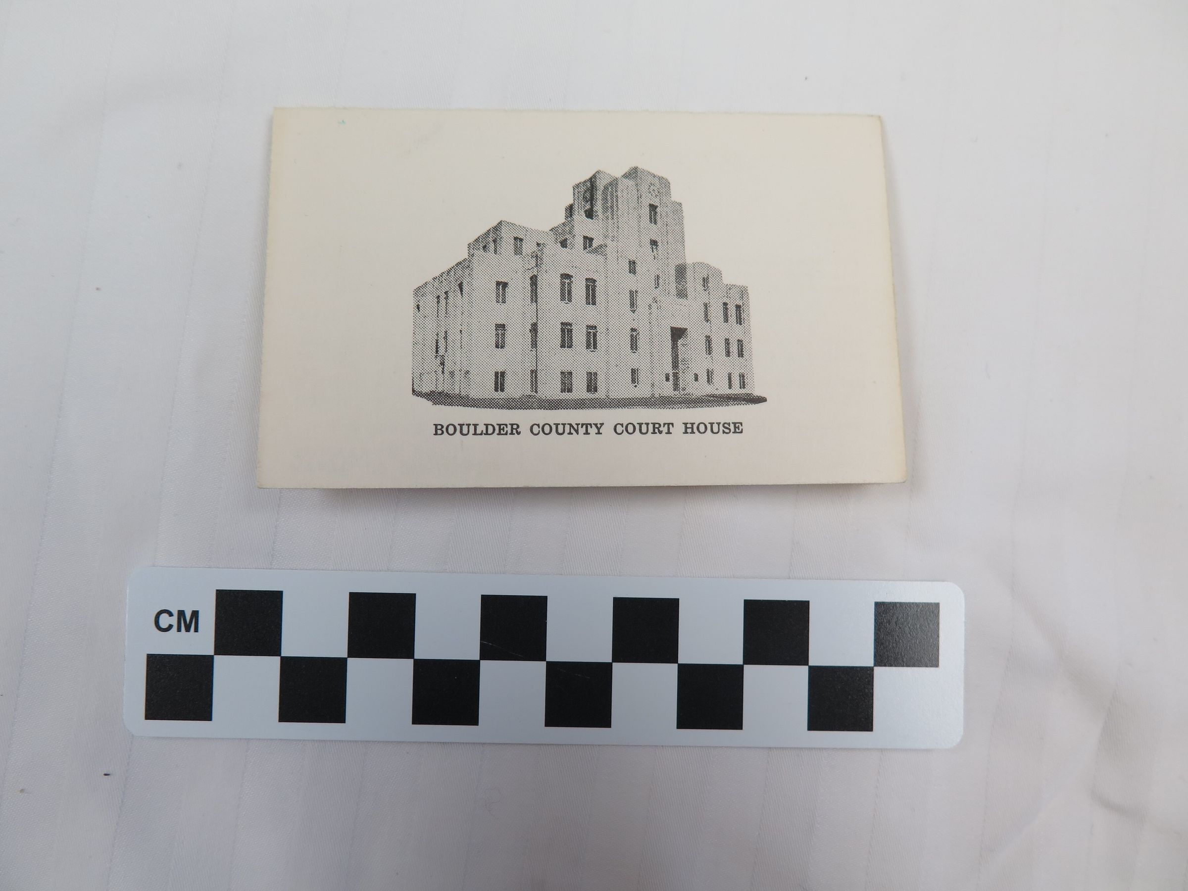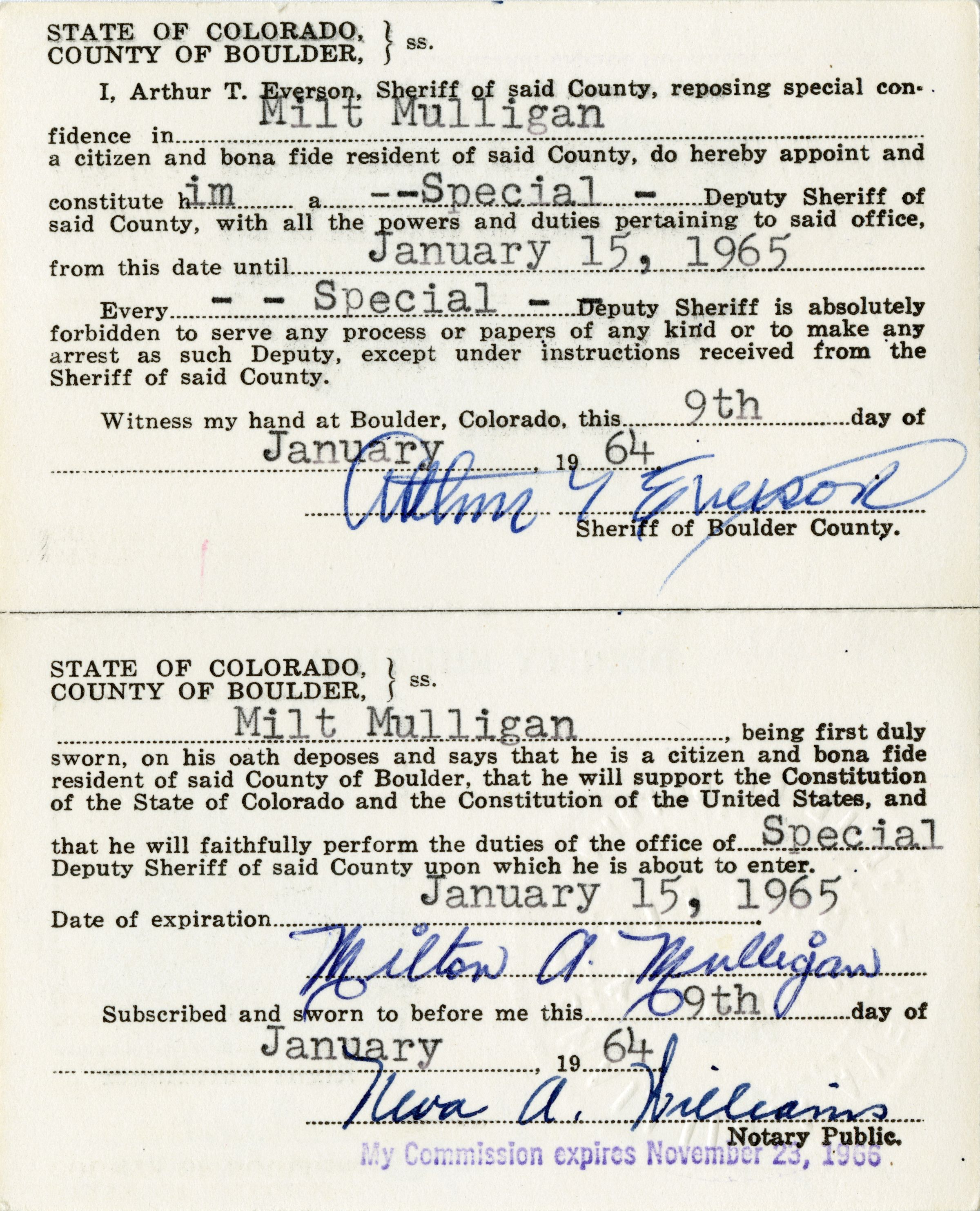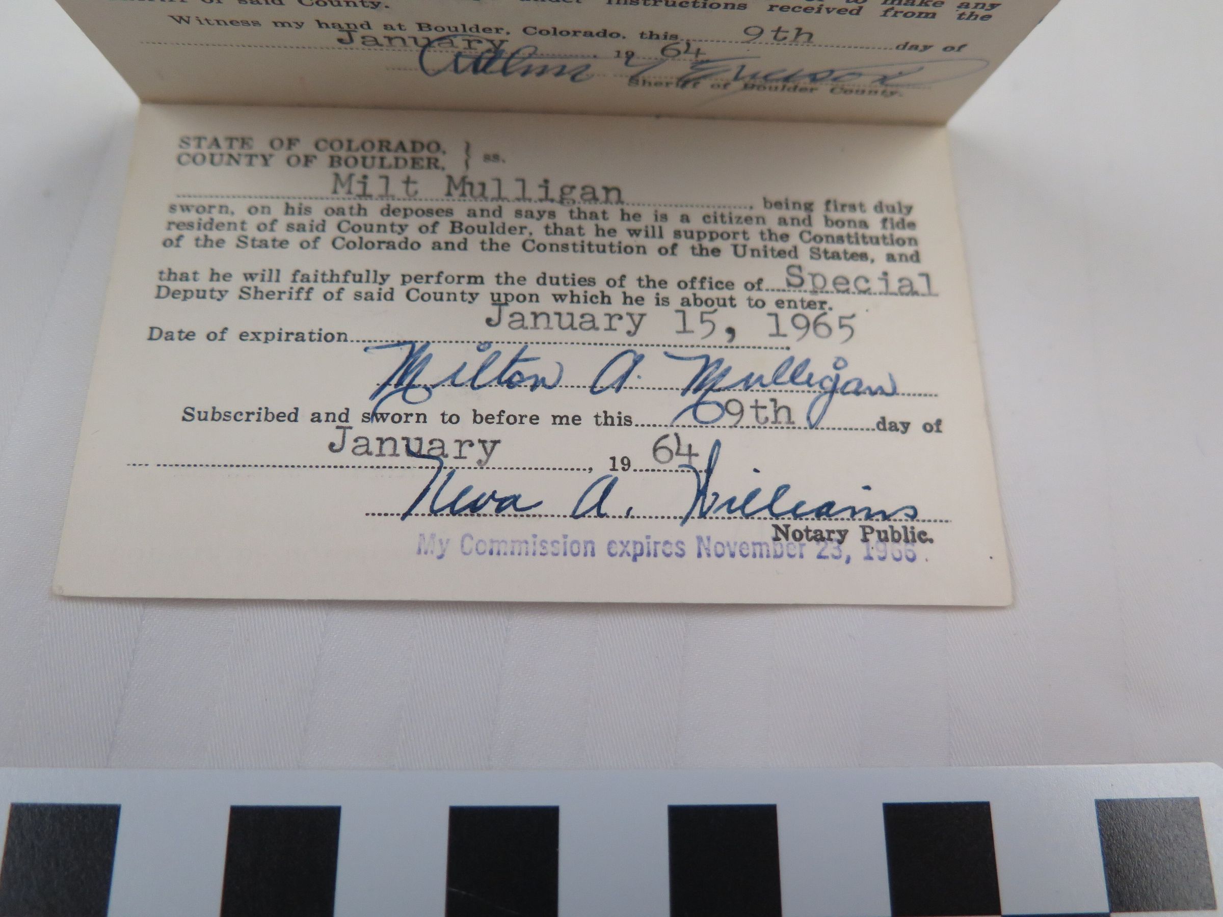 A Boulder County Deputy Sheriff card for Milton Mulligan, 1964. The card is 2.5" x 4" with an illustration of the Boulder County Court House on the front. The card opens to show additional information certifying Mulligan as the Deputy, including signatures from the Sheriff of Boulder County and a public notary. The reverse side has Mulligan's signature and fingerprint.