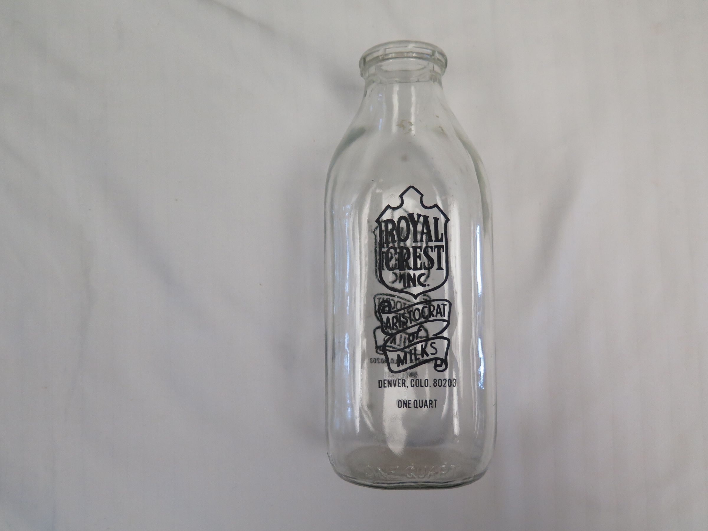 This is a clear glass milk bottle without a lid. The milk bottle has a square base. The sides of the milk bottle have black text on them that reads, "Royal/ Crest/ Inc./ Aristocrat/ of/ Milks/ Denver, Colo 80203/ One Quart". The milk bottle measures 8.5" (h) x 3.5" (w) x 3.5" (l).