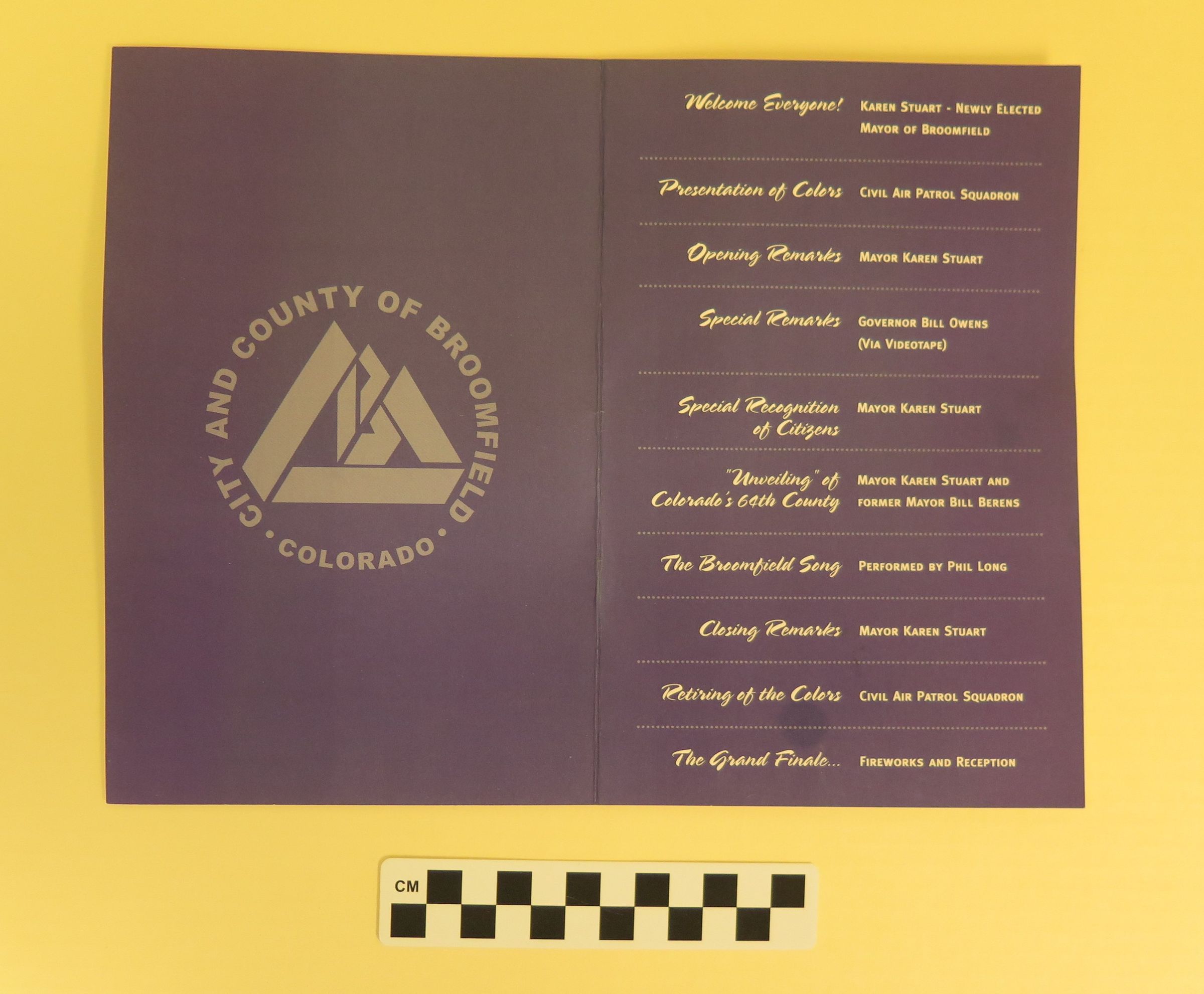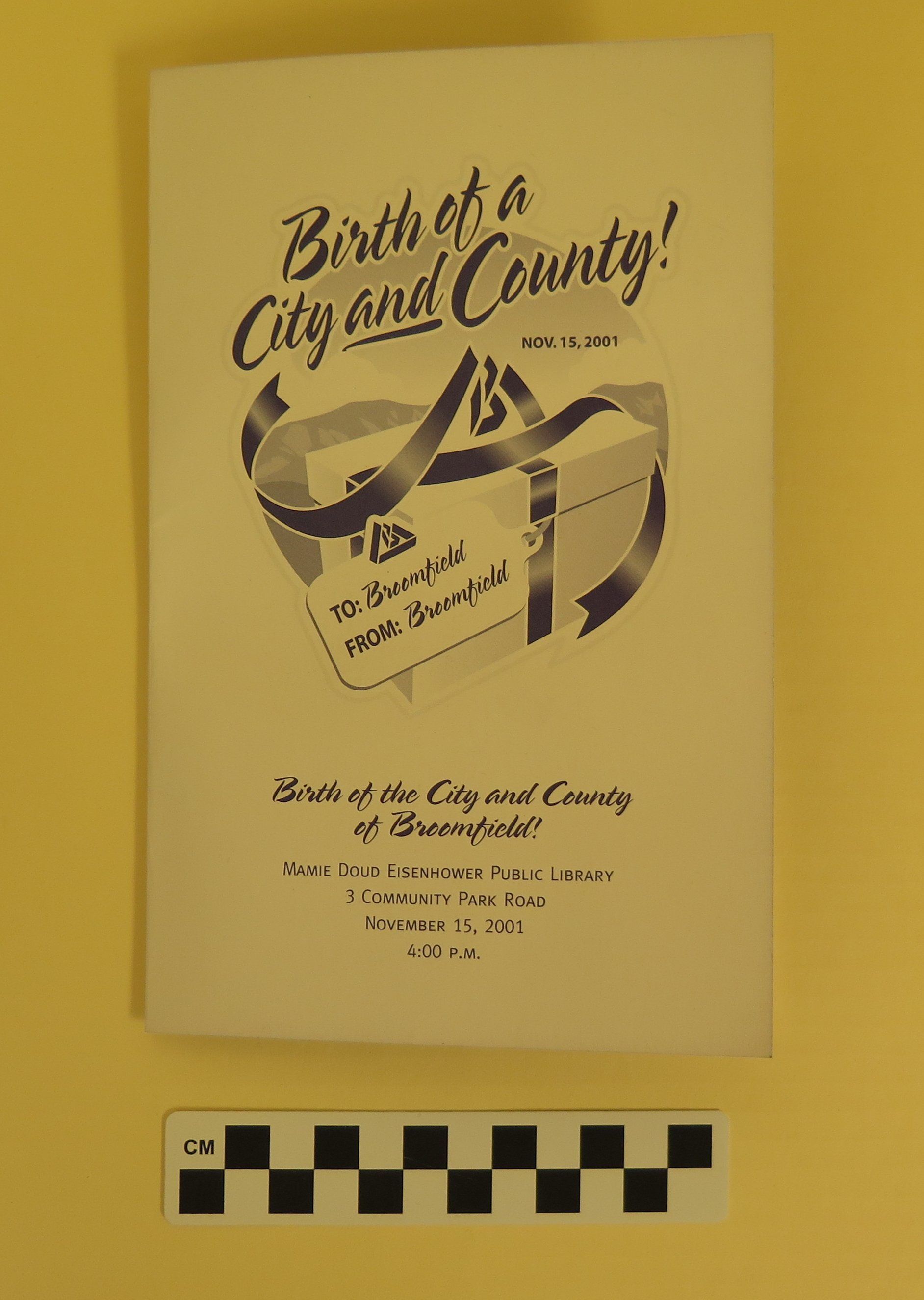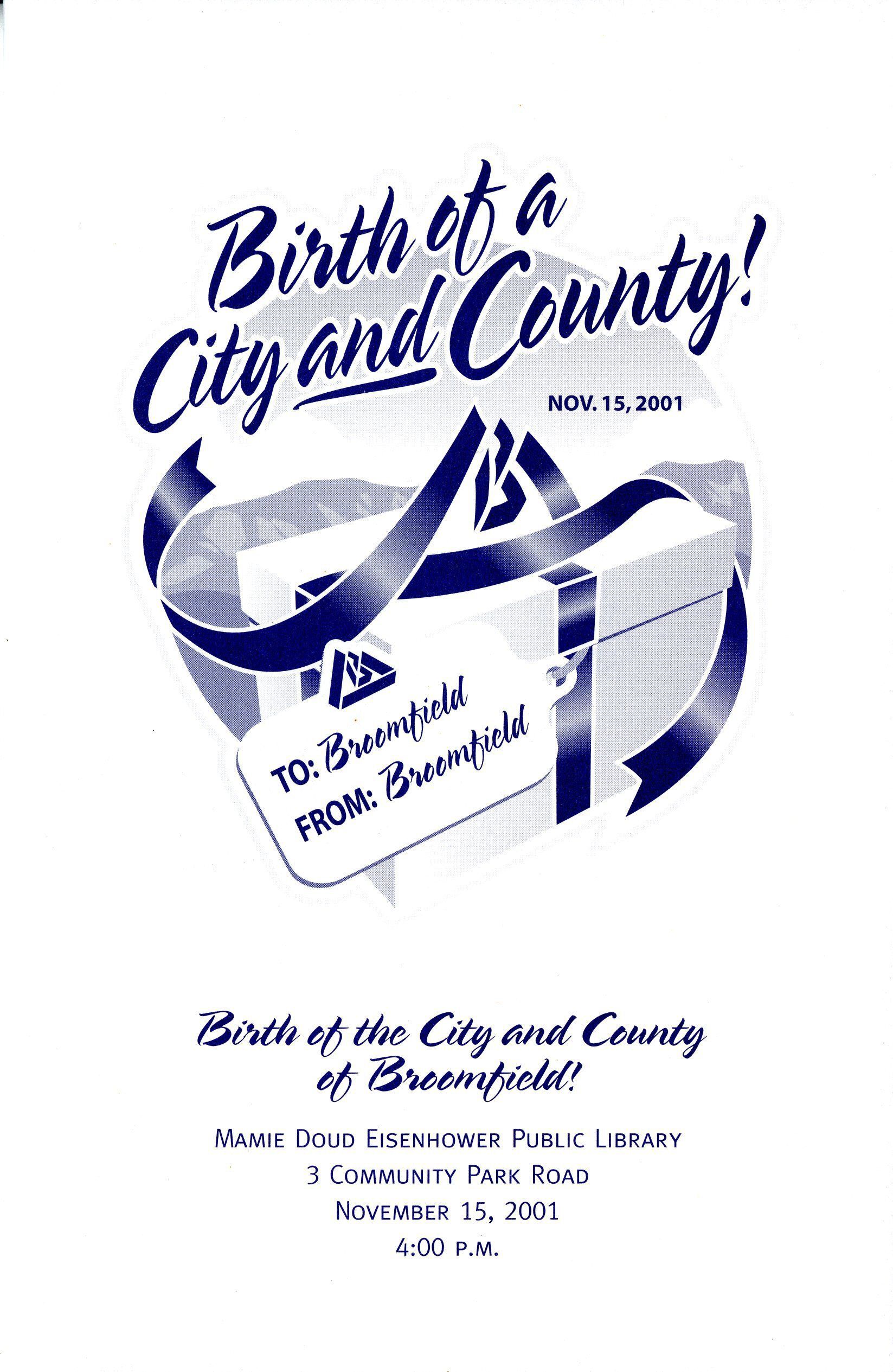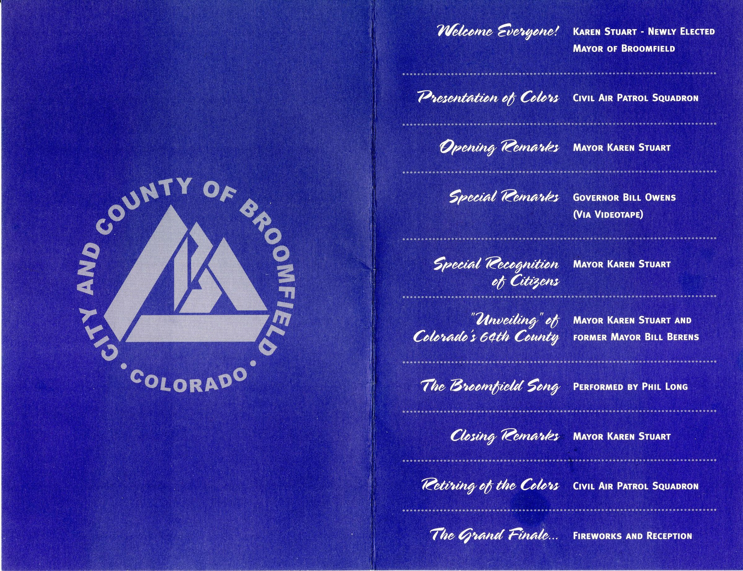 The event was held at the Mamie Doud Eisenhower Public Library at 3 Community Park Road at 4:00 PM on November 15, 2001. The inside of the program contains a schedule for the event, which included opening remarks by Broomfield Mayor Karen Staurt, words from Colorado Governor Bill Owens, performances, and recognition of Broomfield citizens. The event marked the creation of Broomfield as both a City and a County of the State of Colorado.Collection