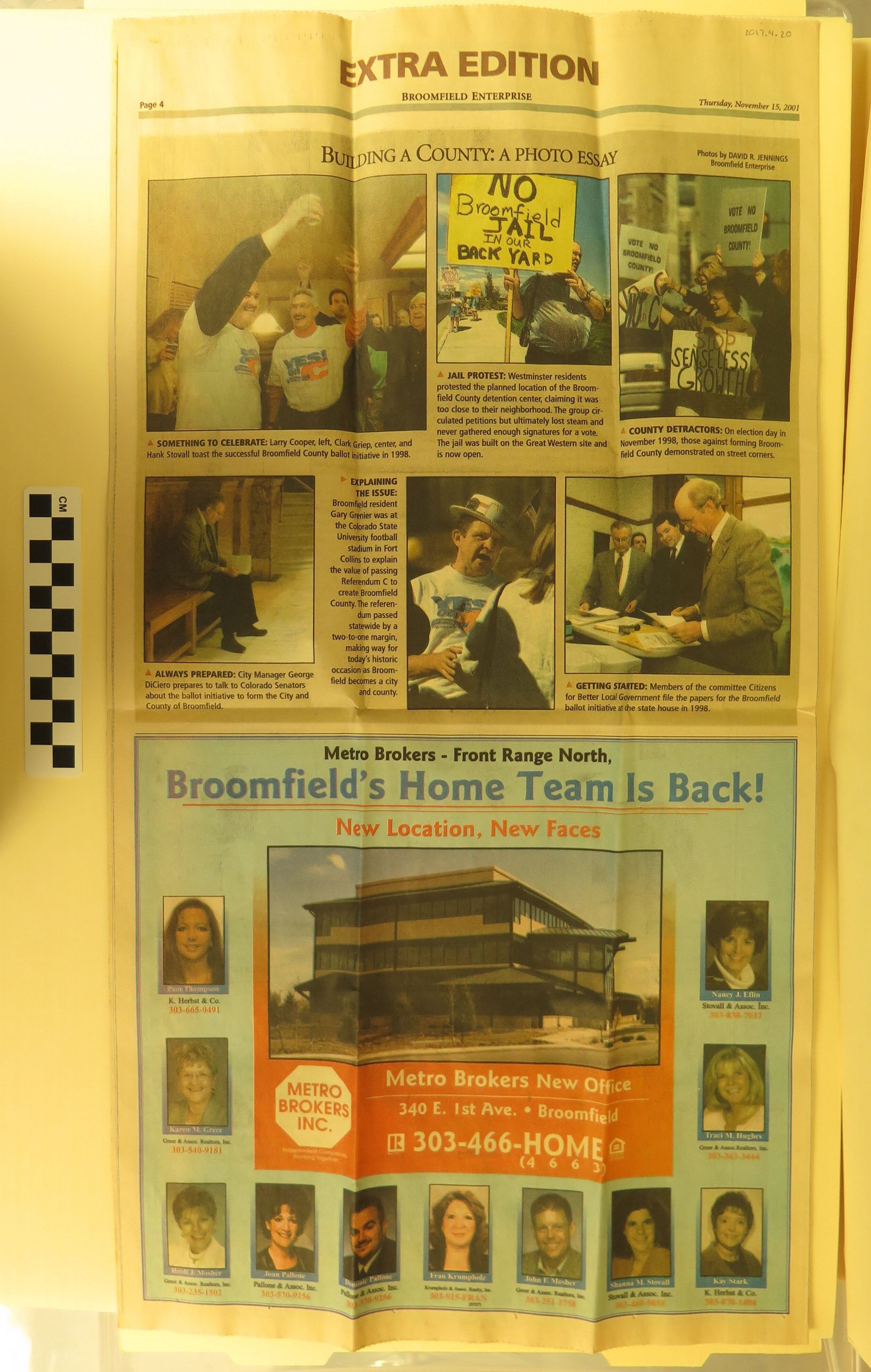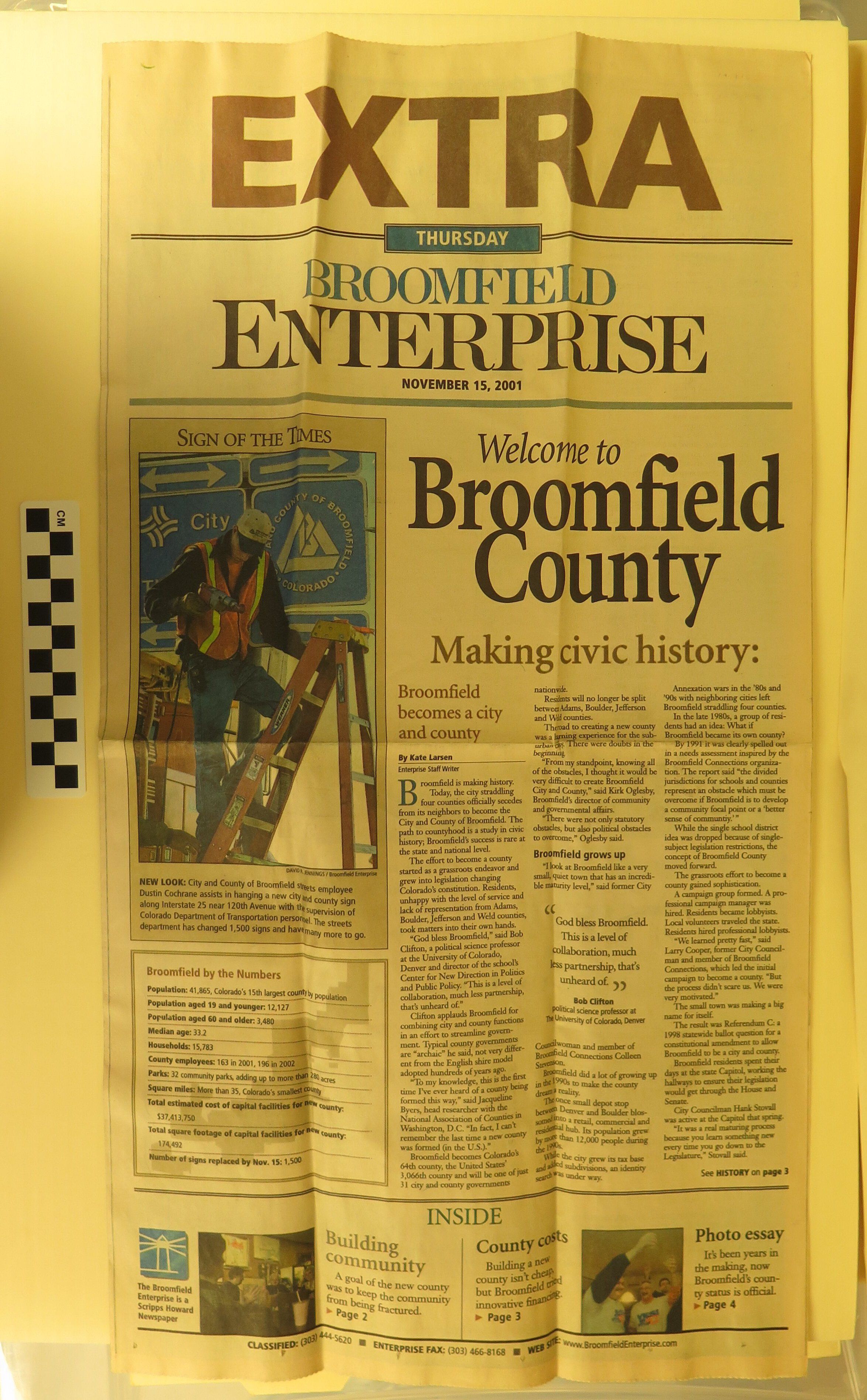 An extra edition of the Broomfield Enterprise on the creation of Broomfield County, November 15, 2001. The paper is 12.5" x 22.75" when unfolded, with four pages of content front to back. The paper contains articles explaining the process of Broomfield becoming the first city in the United States to successfuly become its own county out of four previous counties, as well as the finances and community building involved. The last page includes a photo essay on the efforts to form the county, as well.Collection
