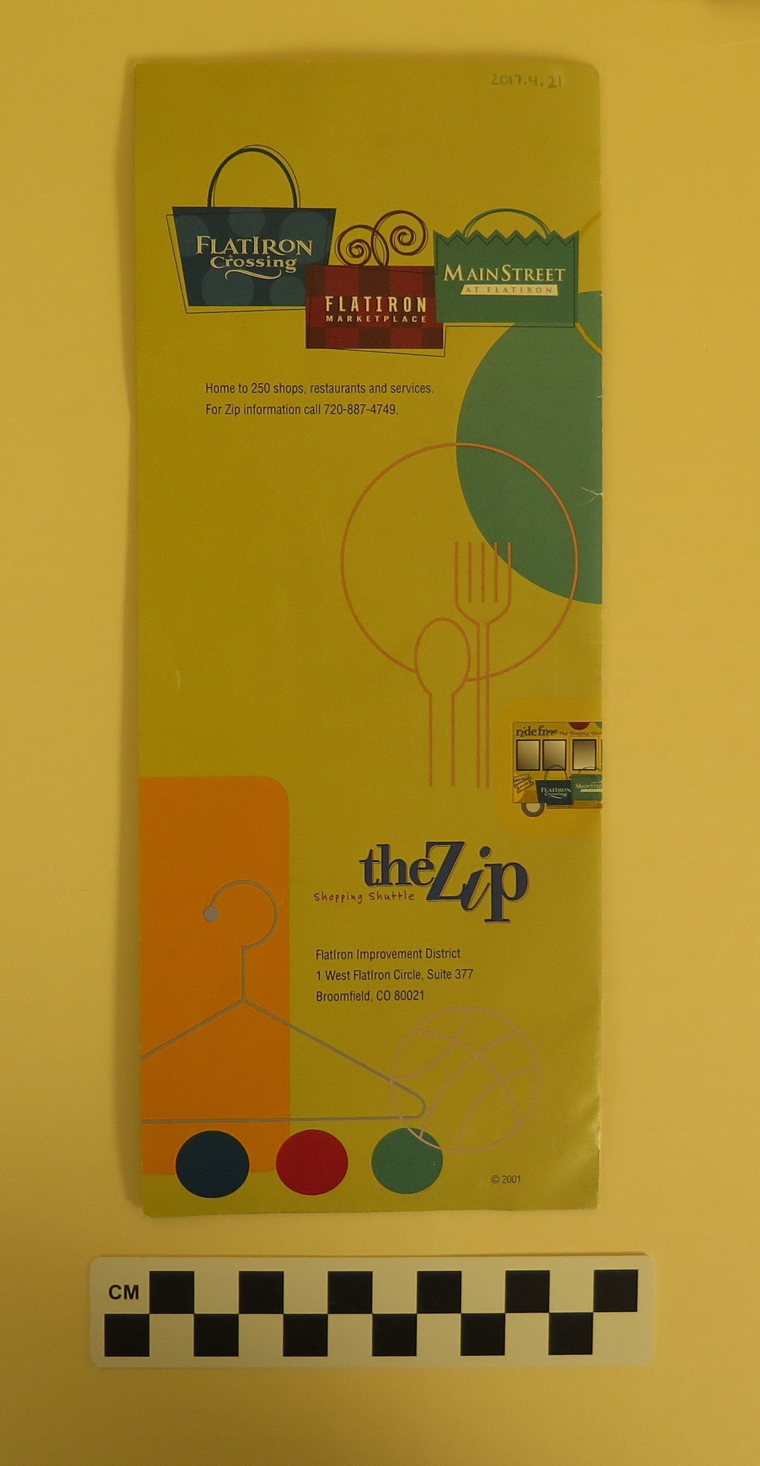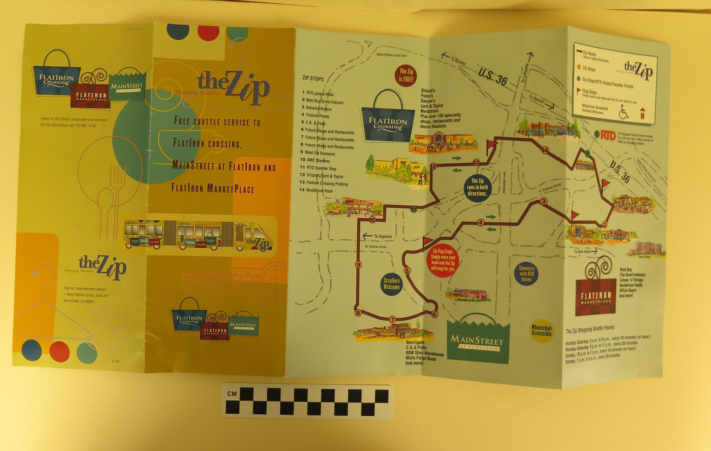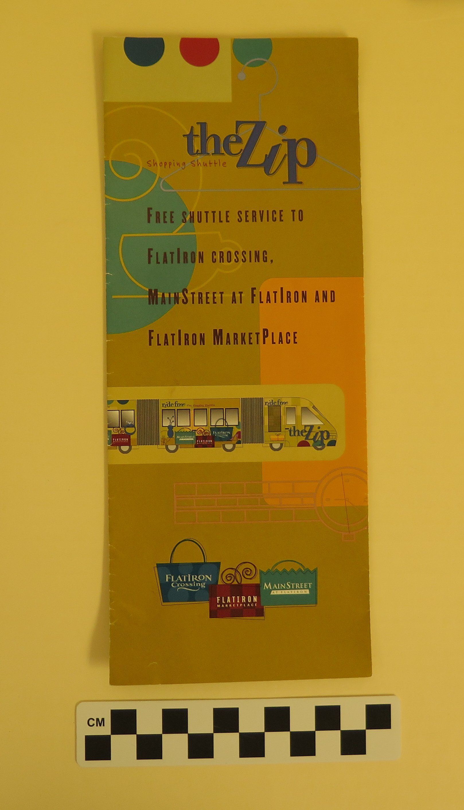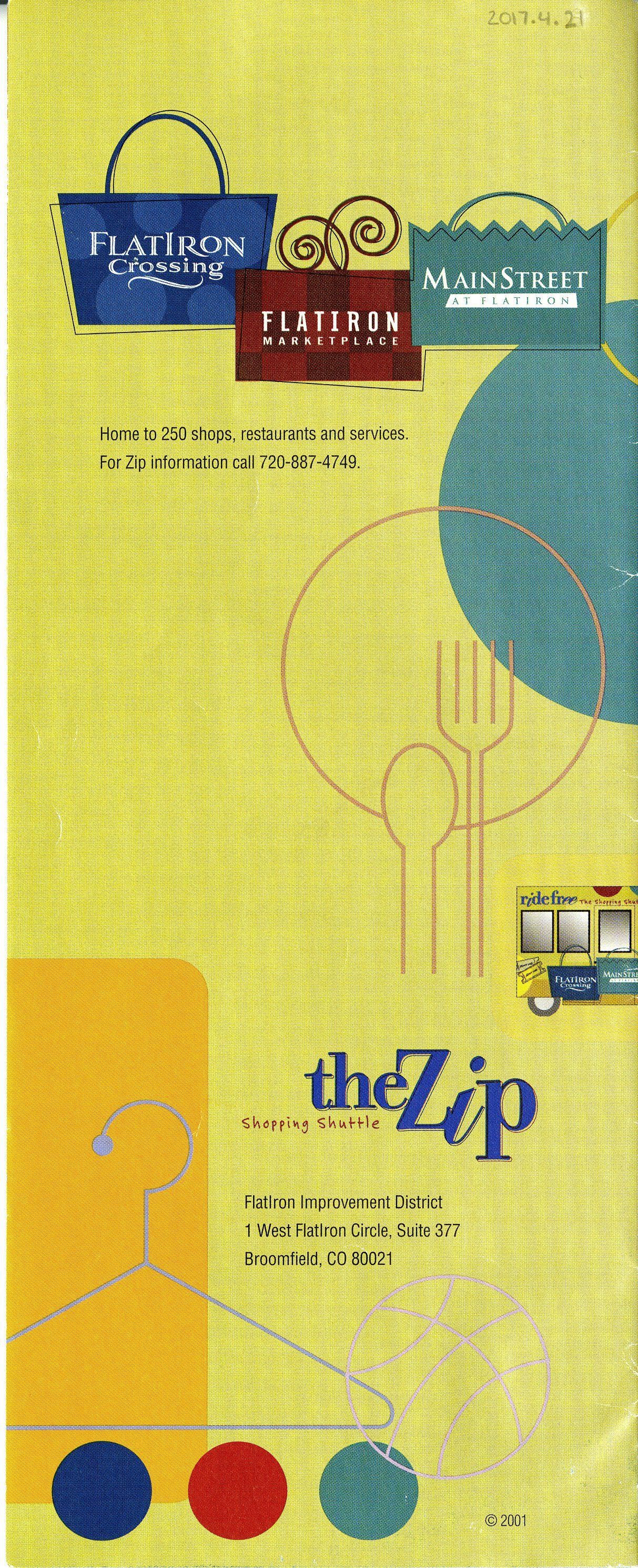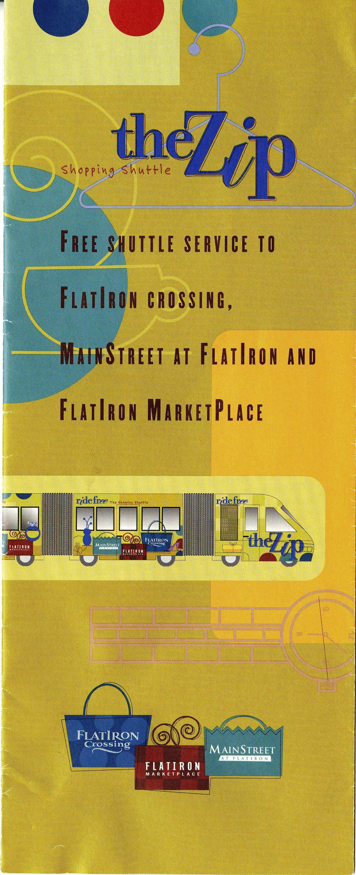 A brochure and map for the Zip Shopping Shuttle at FlatIron Crossing Mall, 2001. The brochure is 4" x 10" when folded, green, with an illustrated color picture of the Zip shuttle on the front. When opened, one side of the brochure has a full retail list for FlatIron Crossing and its surrounding area. The other side has a color map of the Zip Shuttle's route, with illustrations of various shopping locales.Collection