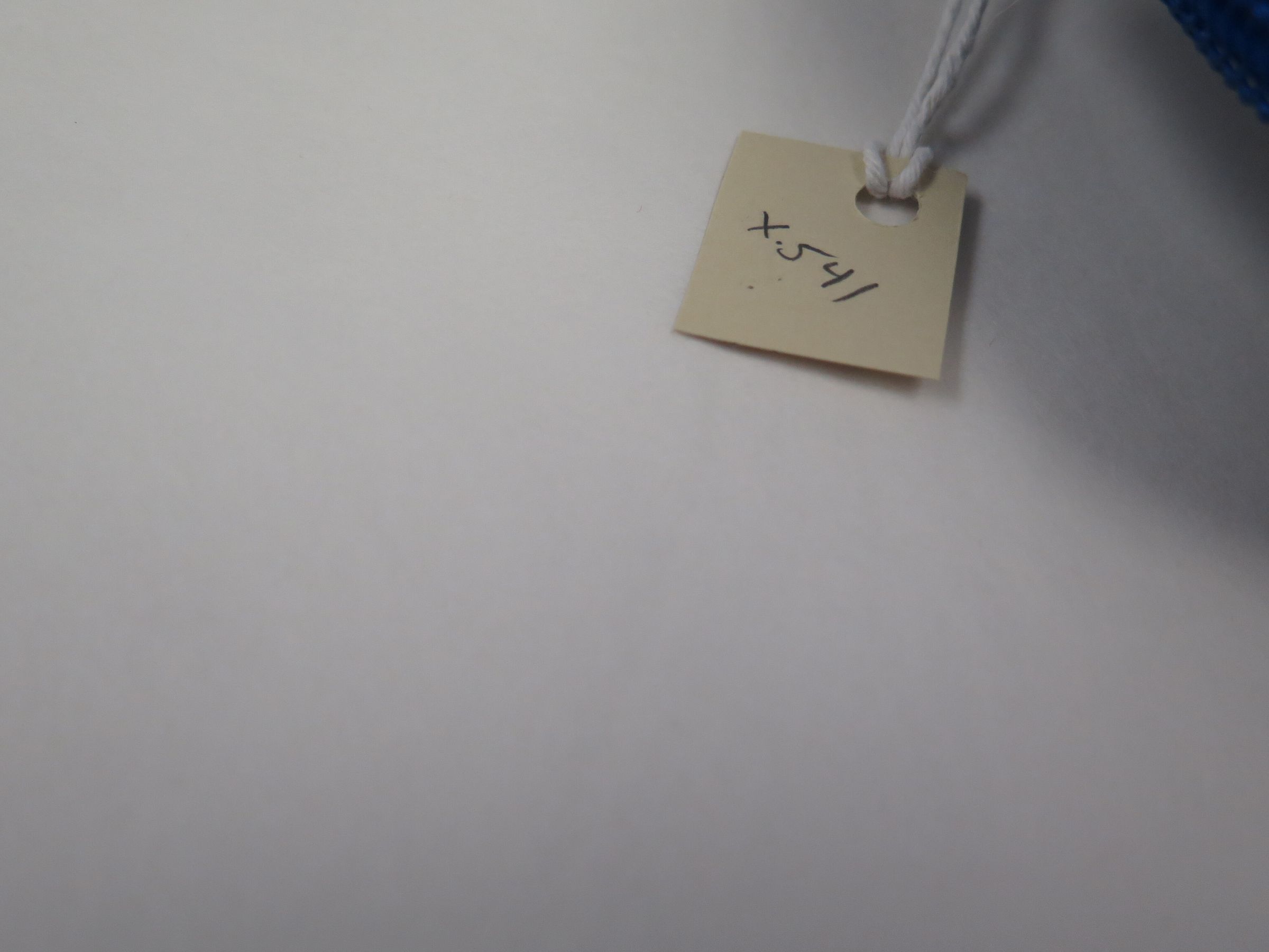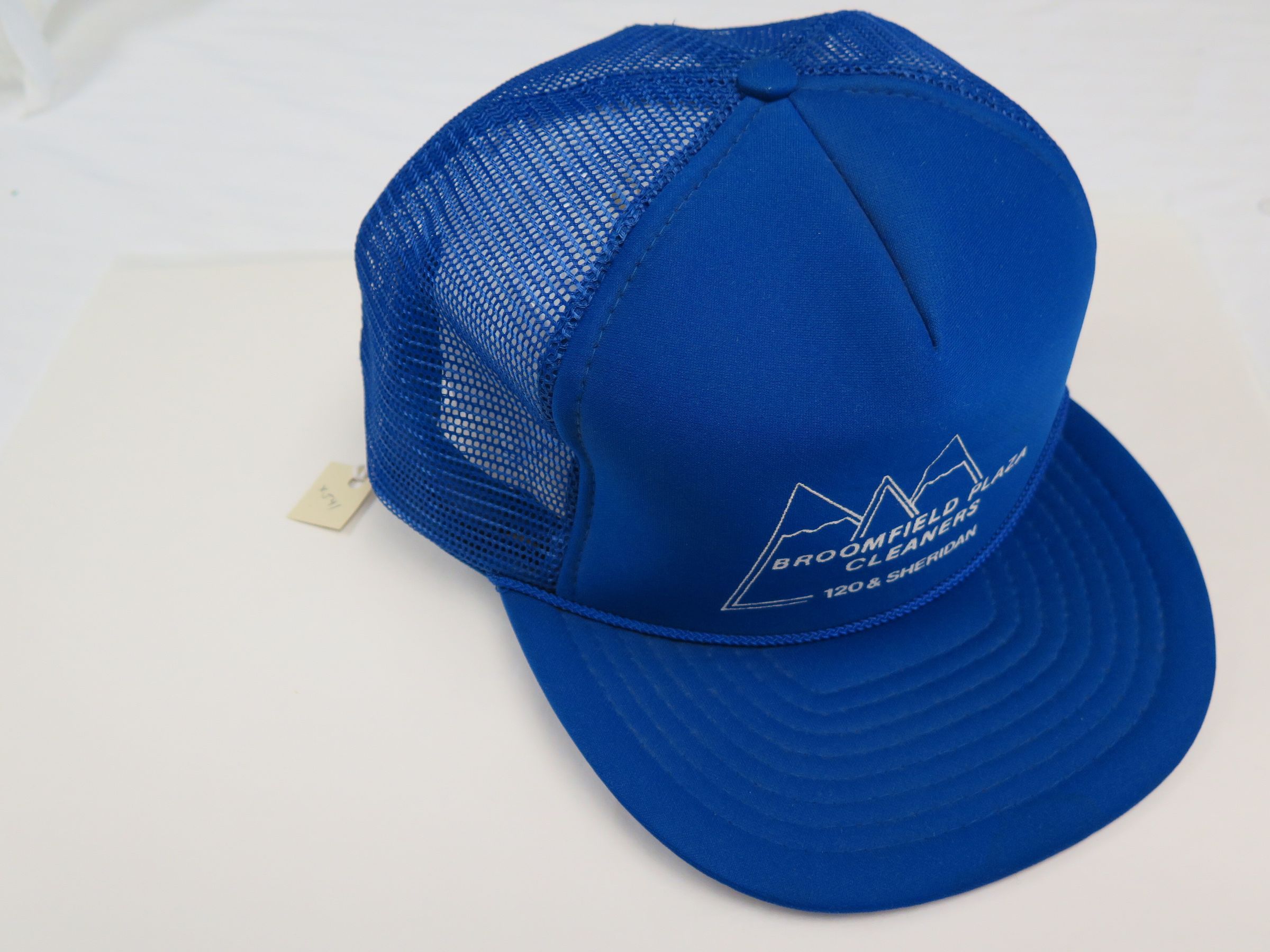 This is a blue baseball cap with white text on the front. The text reads, "Broomfield Plaza/ Cleaners/ 120 & Sheridan". The cap measures 5" (h) x 9" (w) x 9.5" (l).