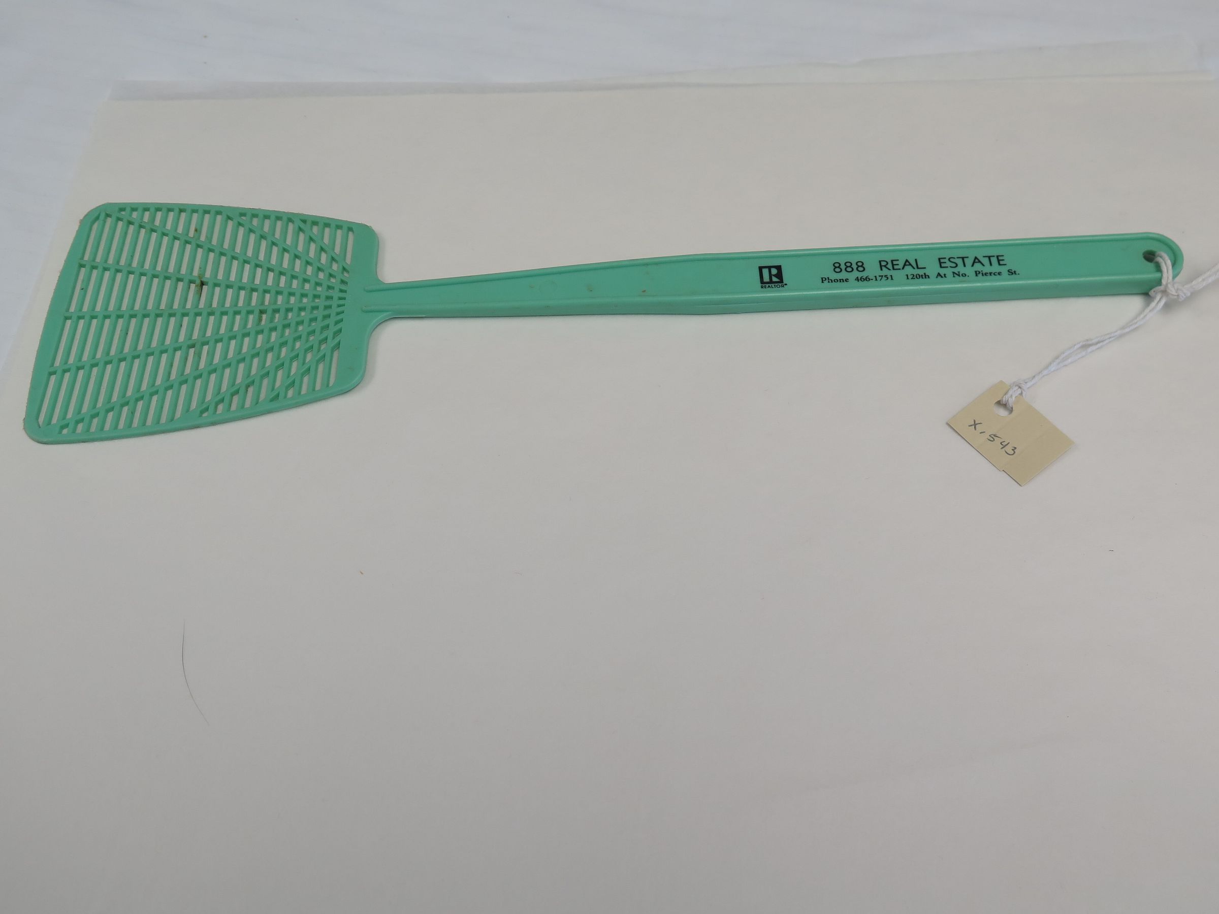 This is a green plastic fly swatter with a business name printed on the handle in black. The text reads, "888 Real Estate/ Phone 466-1751 120th At No. Pierce St.". The fly swatter measures 4.25" (w) x 15" (l).