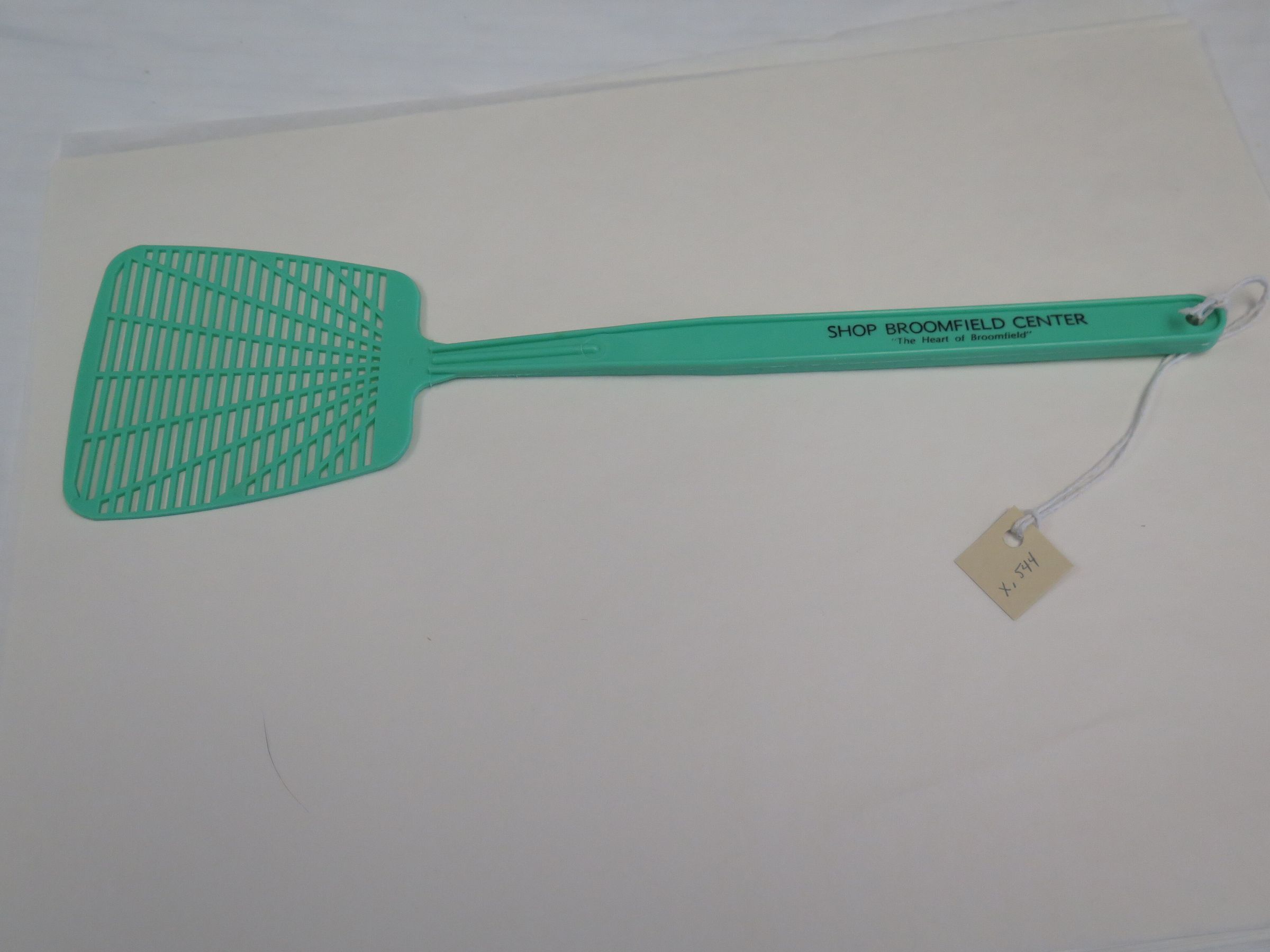 This is a green plastic fly swatter with black text on the handle. The text reads, "SHOP BROOMFIELD CENTER/ "The Heart of Broomfield". The fly swatter measures 4" (w) x 15.5" (l).