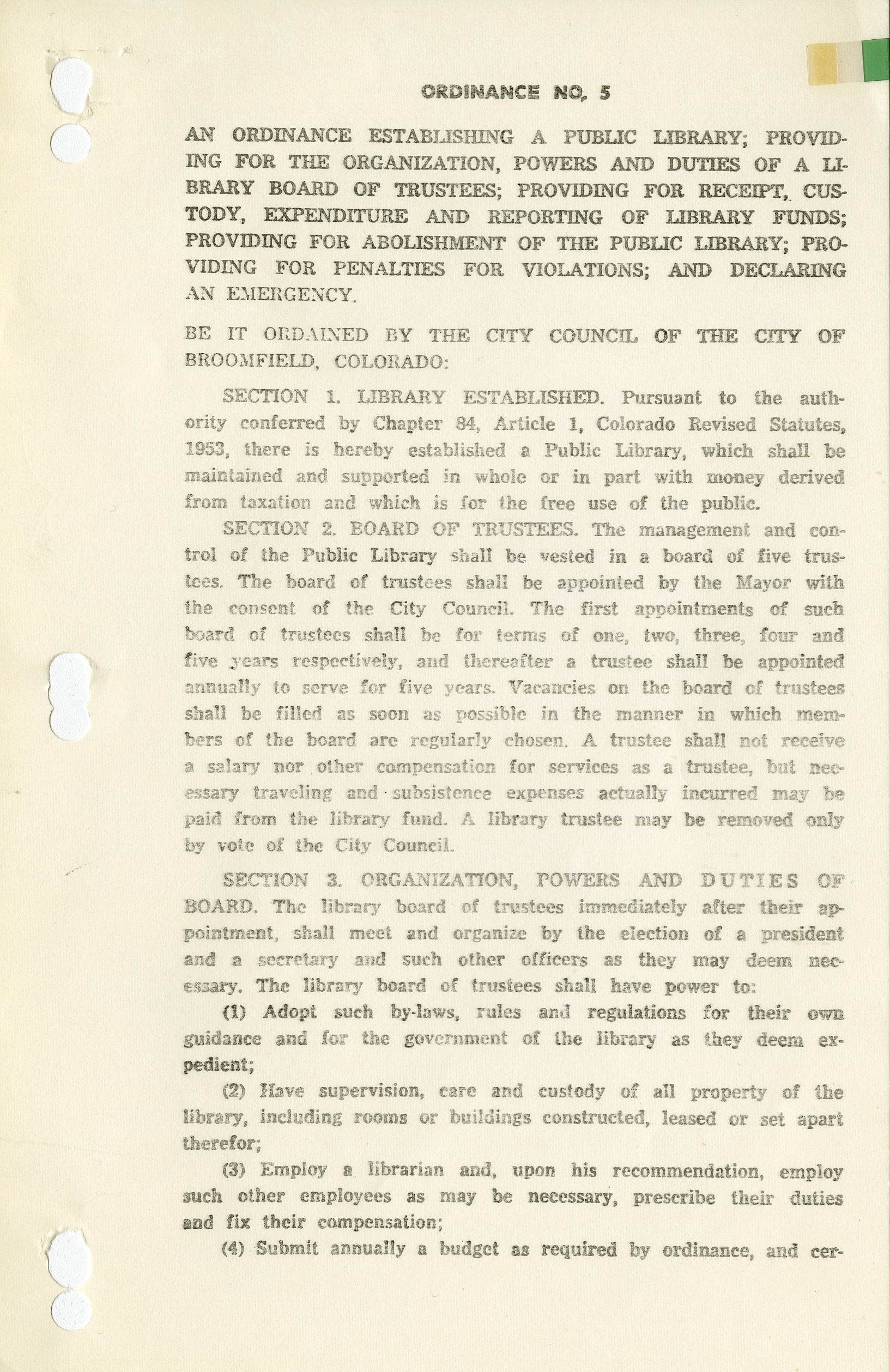The binder contains a total of 200 typewritten ordinances, with an accompanying contents list that includes the name, effect date, and number of pages of each ordinance. Revisions to some of the ordinances are also noted in the contents. Some of the ordinances have green index tabs marking their number and location in the binder. Most of the ordinances were prepared by Lucy Brown, City Clerk for the City of Broomfield.Collection