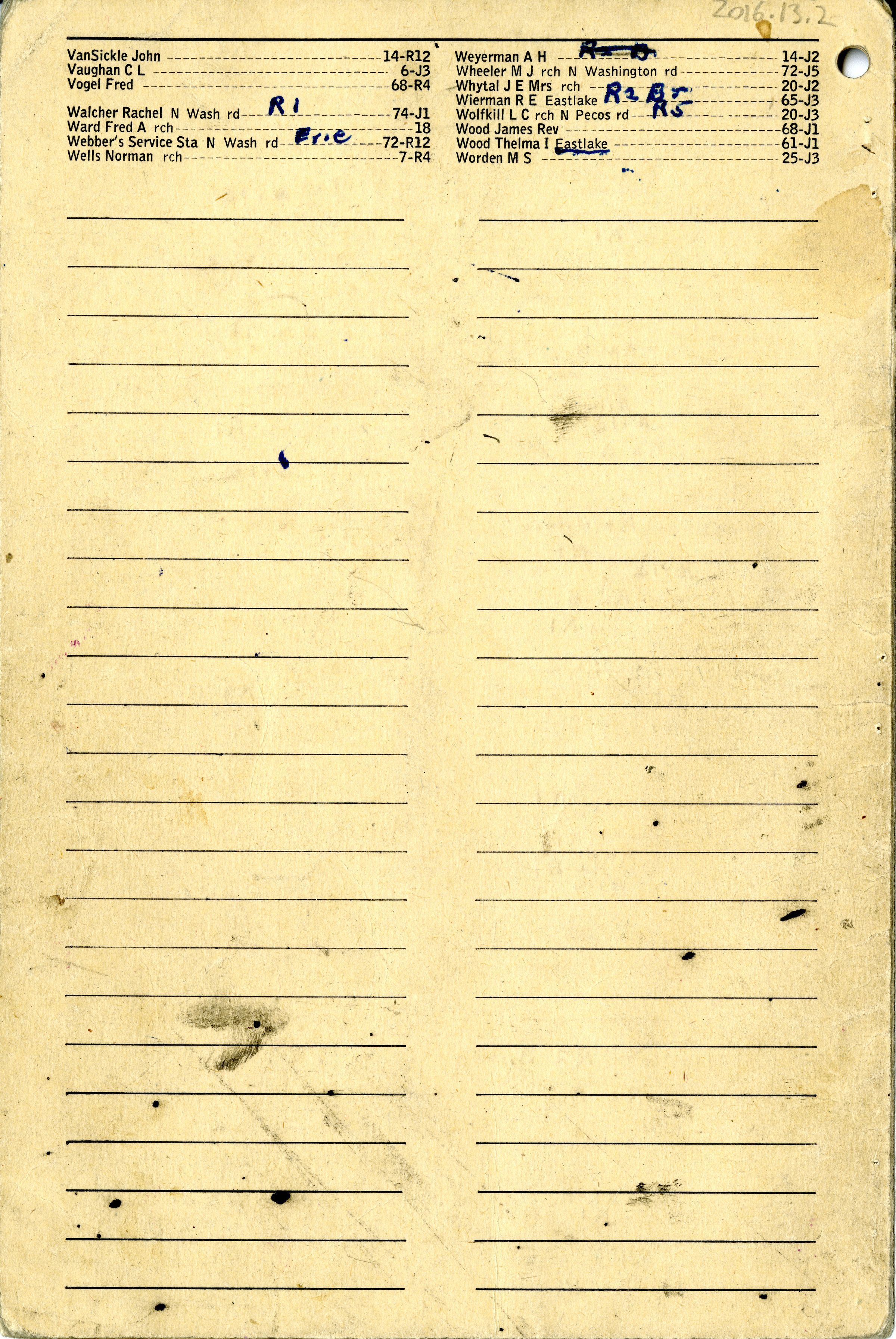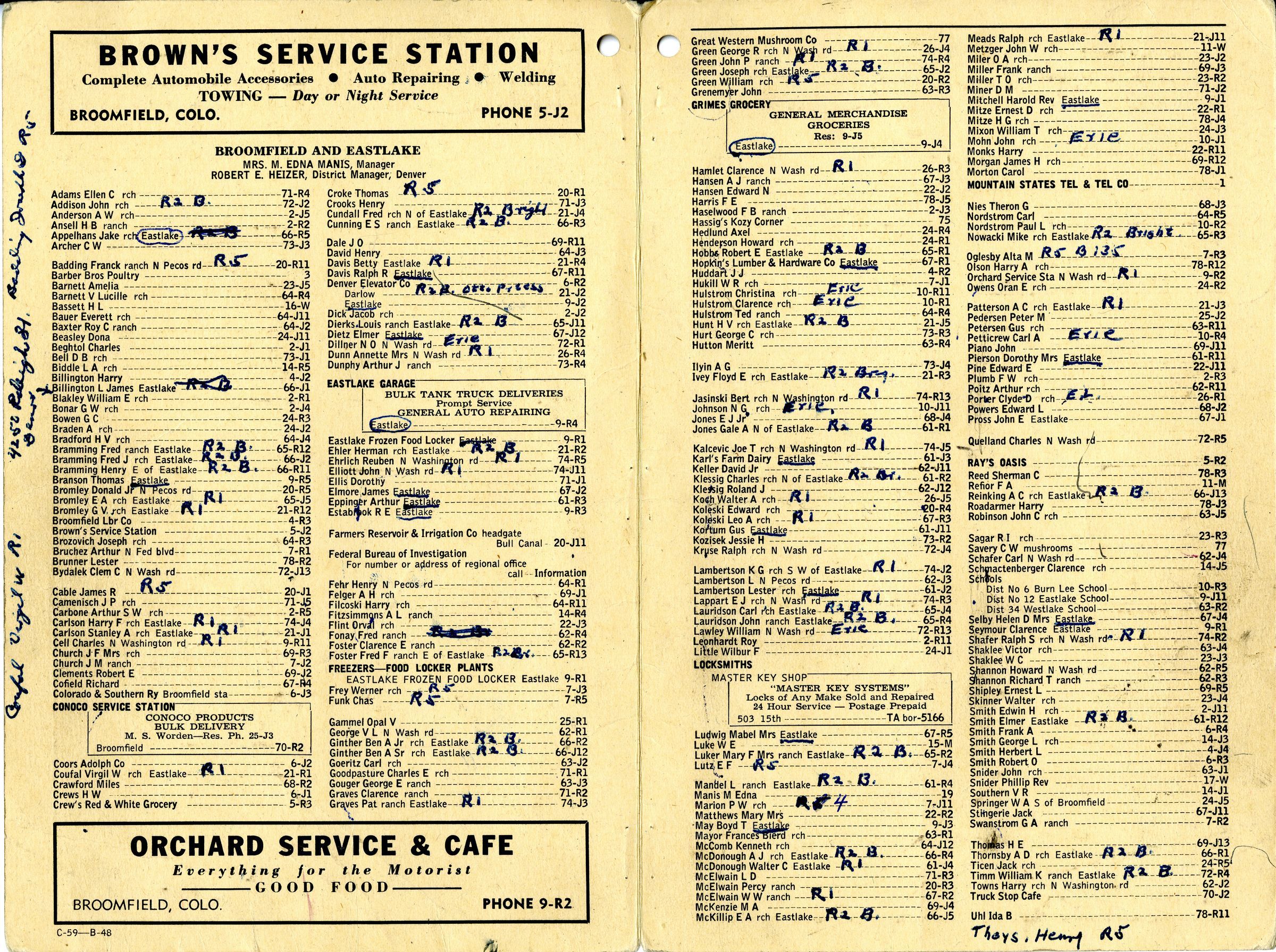 The interior and back of the directory contains several lists of individual and business phone numbers for Broomfeild, organized aphabetically by last name and by business category (i.e. "Locksmith", etc.). The directory's original owner, likely Miles Crawford, added several names, addresses, and phone numbers in blue ink in the margins.Collection