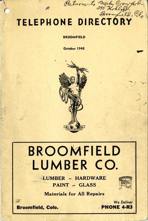A Broomfield area telephone directory, October 1948. The directory is 6"x 9" when closed, on cardstock, and opens like a booklet. The front has an illustration of a winged man holding lightning bolts and a telephone wire, standing on a globe with a banner stating, "Spirit of Communication." Broomfield Lumber Company is advertised prominently on the front as well, with the phone number "4-R3." Inscription in ink in the upper right corner states, "Return to Miles Crawford 390 Kohl St. Broomfield, Colo."